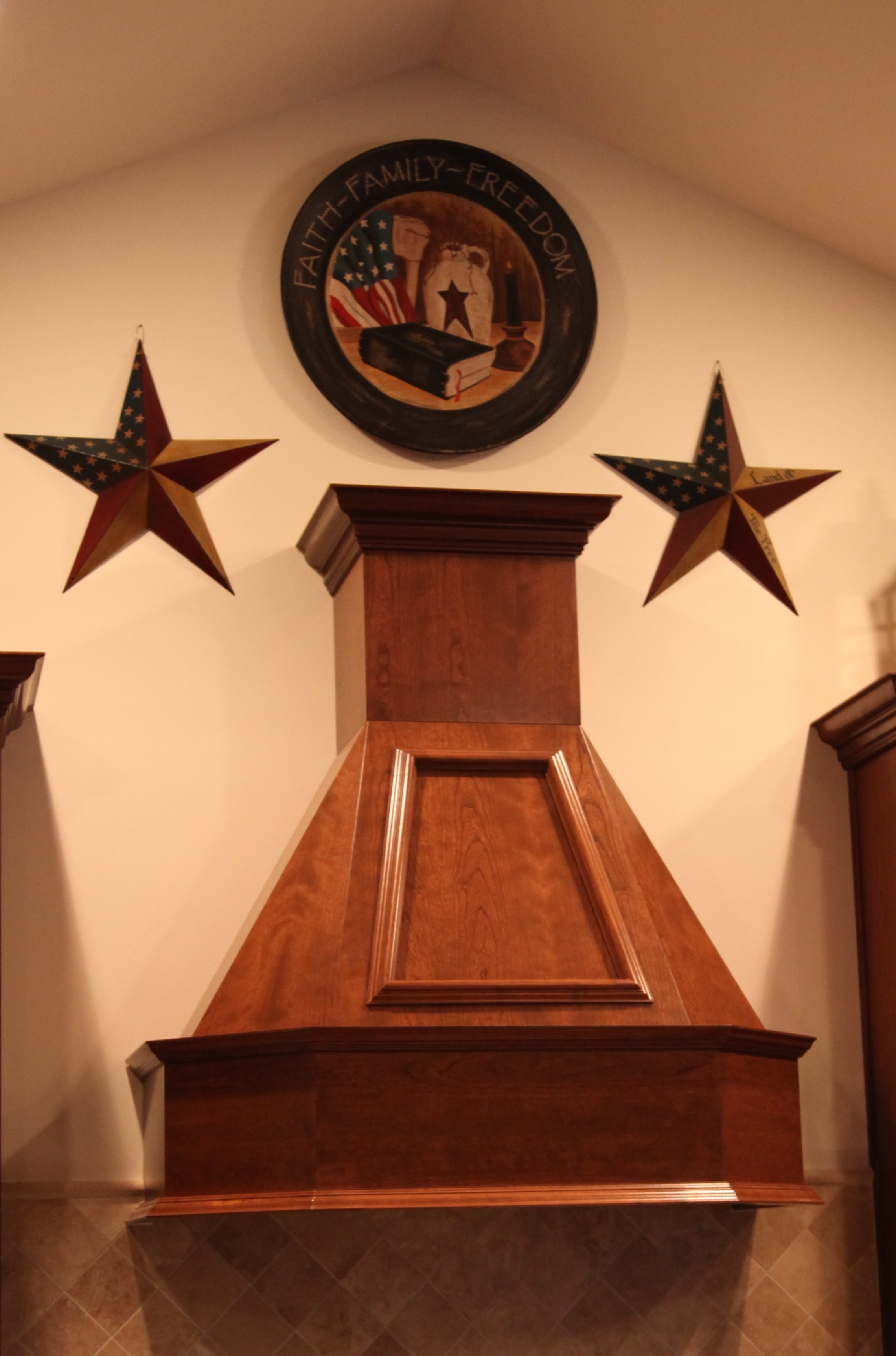 One of the main reasons that my hubby and I chose this model of home to build for our retirement home was because of this kitchen.  It is definitely my dream kitchen and I feel humbled and blessed to be able to cook in it daily.  While our house was being built, I was doing a bit of  building of my own, I was building the decor that I would be arranging on top of the kitchen cabinets.  First, I have been collecting Longaberger baskets for decades so I knew that some baskets would definitely be part of the design.  I have also been collecting Dickens Houses for decades, and I’ve always added them into my decor no matter the time of year, so I knew a few of those would also be incorporated into the design.  I love wooden plates and had collected quite a few of those too.  To round out what I needed to complete my vision of the cabinet decor, I spent many a day collecting lanterns and battery operated candles to go in them as well as a *very* large plate and a couple of metal stars (for above and on either side of the hood).