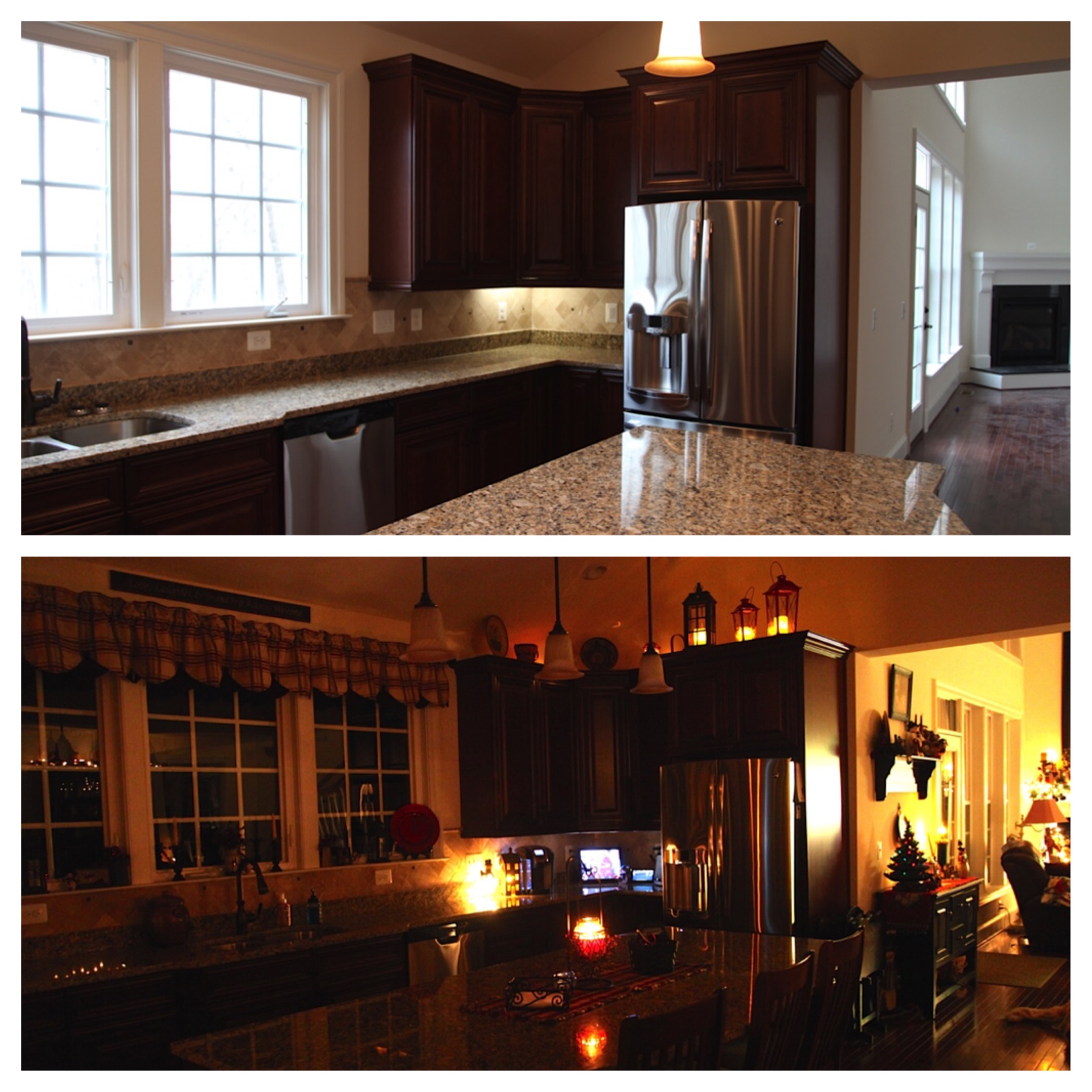 I am really happy with how it all turned out! To add, my hubby attached little chargers to the candles and plugged them in up there–during the building process we had arranged to have wall electrical sockets installed above the cabinets and they all run to a switch down on the wall.  Because he did that, I never have to replace the batteries in the candles and they stay on all of the time. 🙂