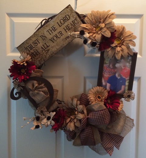 One of my very favorite things to make wreaths out of is a grapevine wreath form. They provide you with a nice sturdy and attractive base for any kind of decor. I’ve made grapevine wreaths for the inside and the outside of my house and for all Seasons. They are not difficult to make and they usually go together quite quickly. I typically will choose a pip berry, leaf, or other kind of garland to use on the wreath to help make it look fuller; I will glue that on first, then I will usually use a picture, plaque, initial, or wooden words and build the rest of the wreath around those choices. I’ll usually pick a coordinating ribbon and some silk or dry flowers to finish off whatever look I’m trying to achieve. I have found that creating the look I want is easier to do when I take the time to place the accented pieces onto the wreath, stand back and look at it and only when I’m happy with how it looks will I *then* use the hot glue to attach all to the wreath for safe keeping. There are a myriad of options out there and the sky is the limit, again, let your imagination be your guide and don’t be afraid to try something new. I will add some pictures of some of the grapevine wreaths that I’ve made in the last couple of years; I hope one of them will inspire you to try to make a grapevine wreath for yourself. 🙂