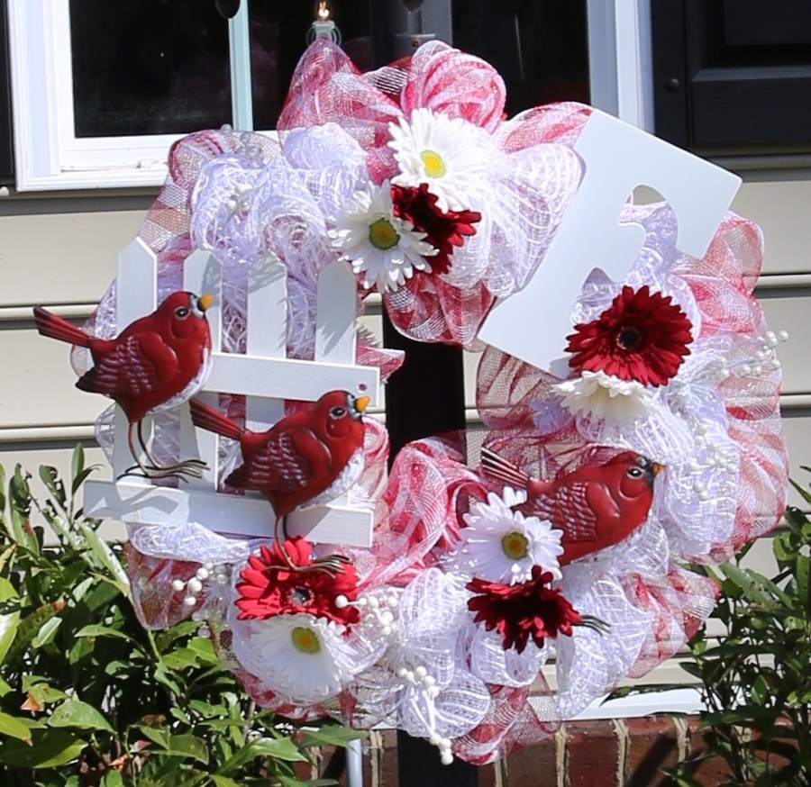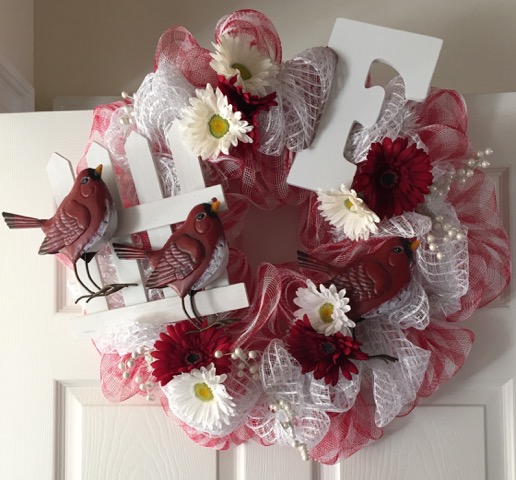 I love a challenge and I love to try my hand at new creations. Deco mesh has been around for quite some time, but, I had never tried to create anything with it until just recently. Goodness knows, I had made plenty of burlap wreaths and I felt as if I’d mastered how to make one of those, so I thought, how hard can it be to use deco mesh in the place of the burlap? So, I tried it and it turns out that I am able to use the same burlap wreath making techniques as I described in this blog post. The meshy material is very easily manipulated and it provides a beautifully full background for any other crafty components that might be added, i.e. a wooden or metal sign, an initial, flowers, birds, etc…