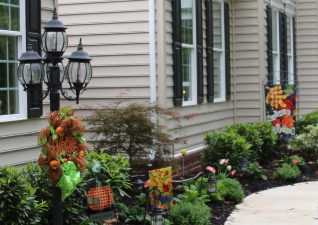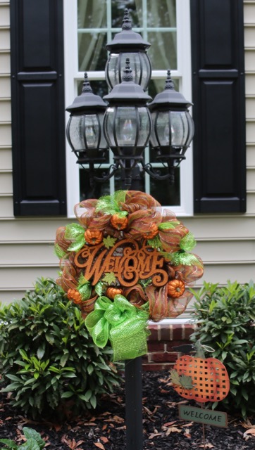 And last but not least, I made this deco mesh wreath to hang on the outdoor light post, it pairs nicely with the Fall decorative flags that are seen while walking down our front sidewalk.