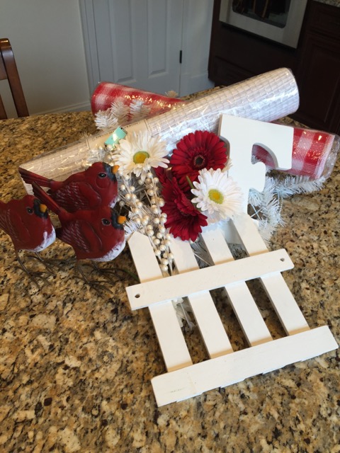 So, now I’ve gotten into the habit of making a deco mesh wreath to hang on the front light post for each Season or for whenever I change out and to match my decorative flags that I display in the front flower bed. For this wreath, I wanted to make something that would pair nicely with all of our family reunion red and white gingham decor. You can imagine my delight when I found the red and white gingham option in deco mesh. Yippee!! 🙂 (The link will lead you to my blog post describing all of that fun decor and craft projects that were created for our reunion). 🙂