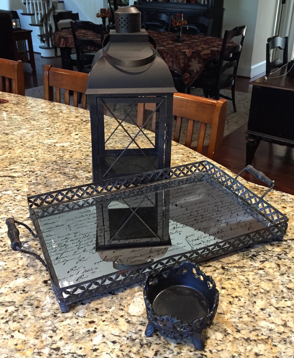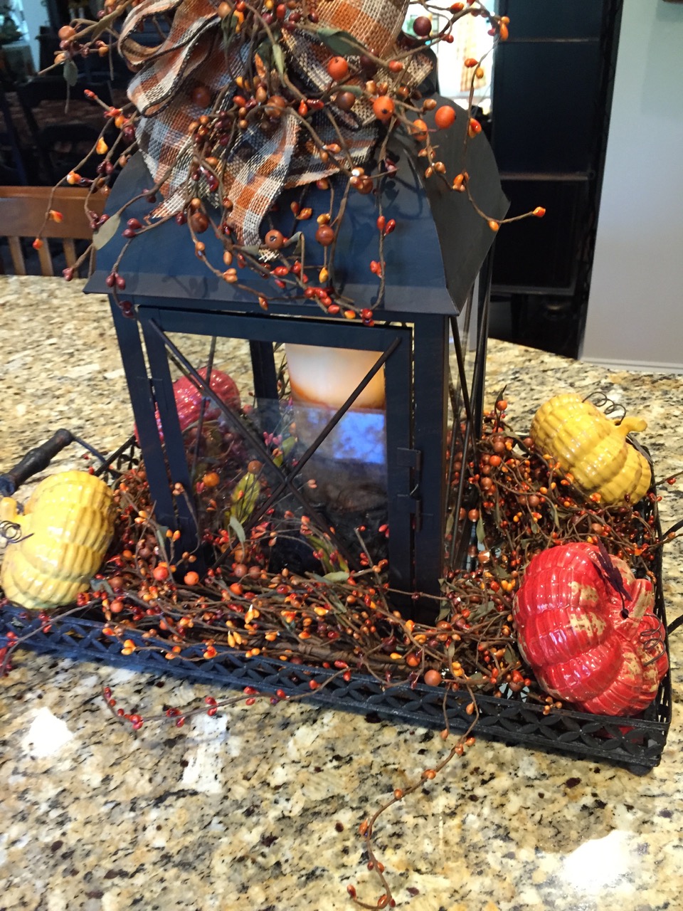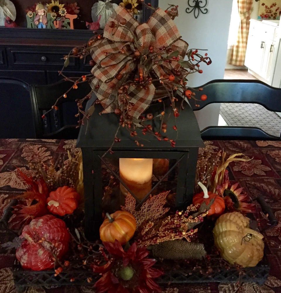 I have really enjoyed creating a new centerpiece as each Season has passed while utilizing the same basic designs and design pieces. I will admit that I spent a good chunk of change on this particular lantern (and I use one just like it on my dining room table, but, it was so worth the cost. I’ll write another post showing you all of the different Seasonal centerpieces I’ve created for the dining room table).   I was able to get the tray for 1/2 off at Hobby Lobby, and I’ve been able to get each Season’s accent pieces for a discounted price. It hardly costs me anything to change out the decor and of course from now on, it won’t cost me a penny because I will reuse the same accent pieces in the coming years.  That said, I know myself and I’m sure I will be adding or changing some things out for new things, but, I’ll already have all of the basics that I need. 🙂