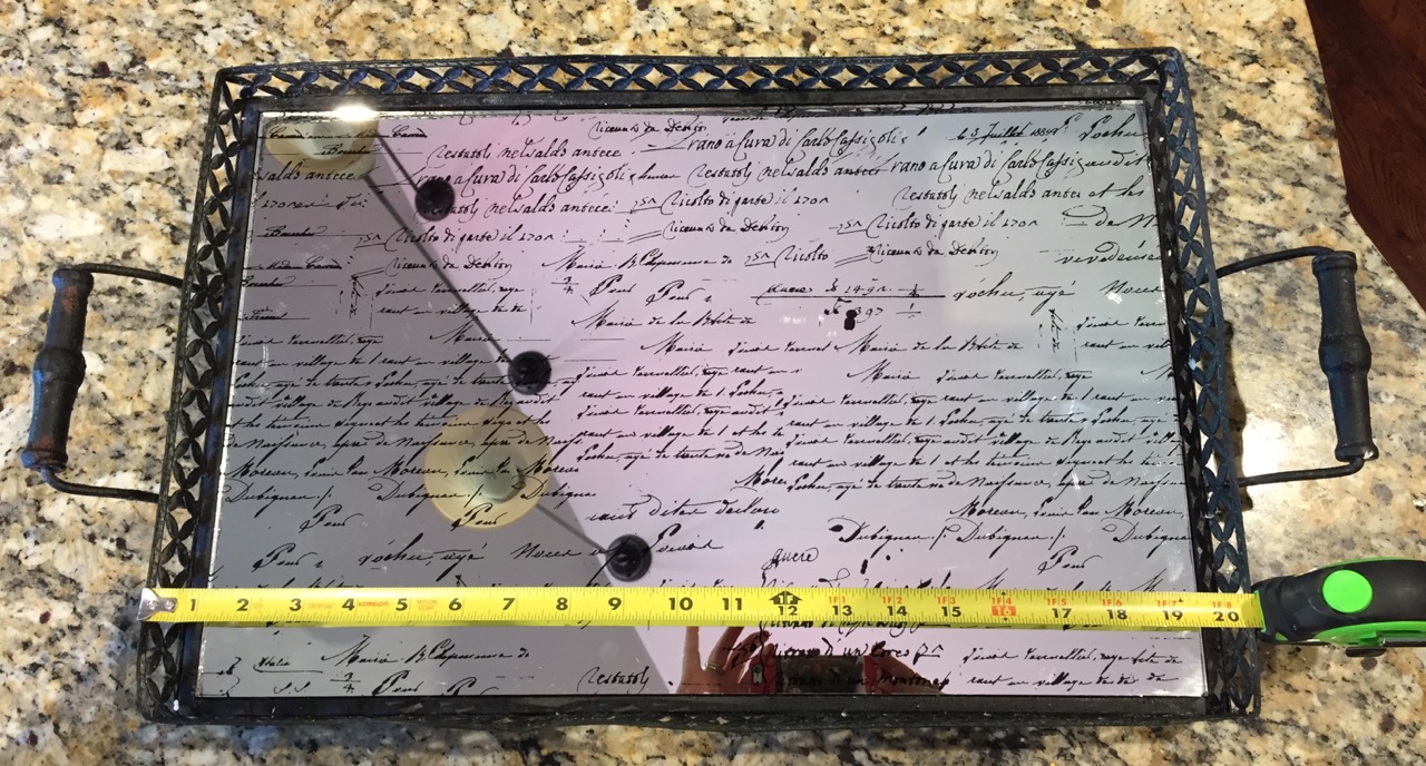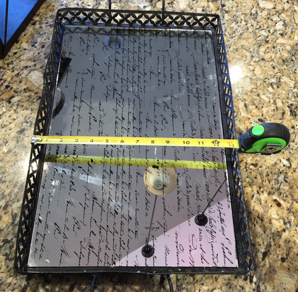 I will start with the very first lantern centerpiece that I created; last January. In addition to the lantern, I’ve used a metal mirrored tray, and a black candle holder as the anchors of every one of the centerpieces.  Here is the lantern, (it is metal btw), I’ve measured it for you so that you can see that it is quite large, I love to have a big centerpiece on my kitchen table, I’ve also measured the tray for you: