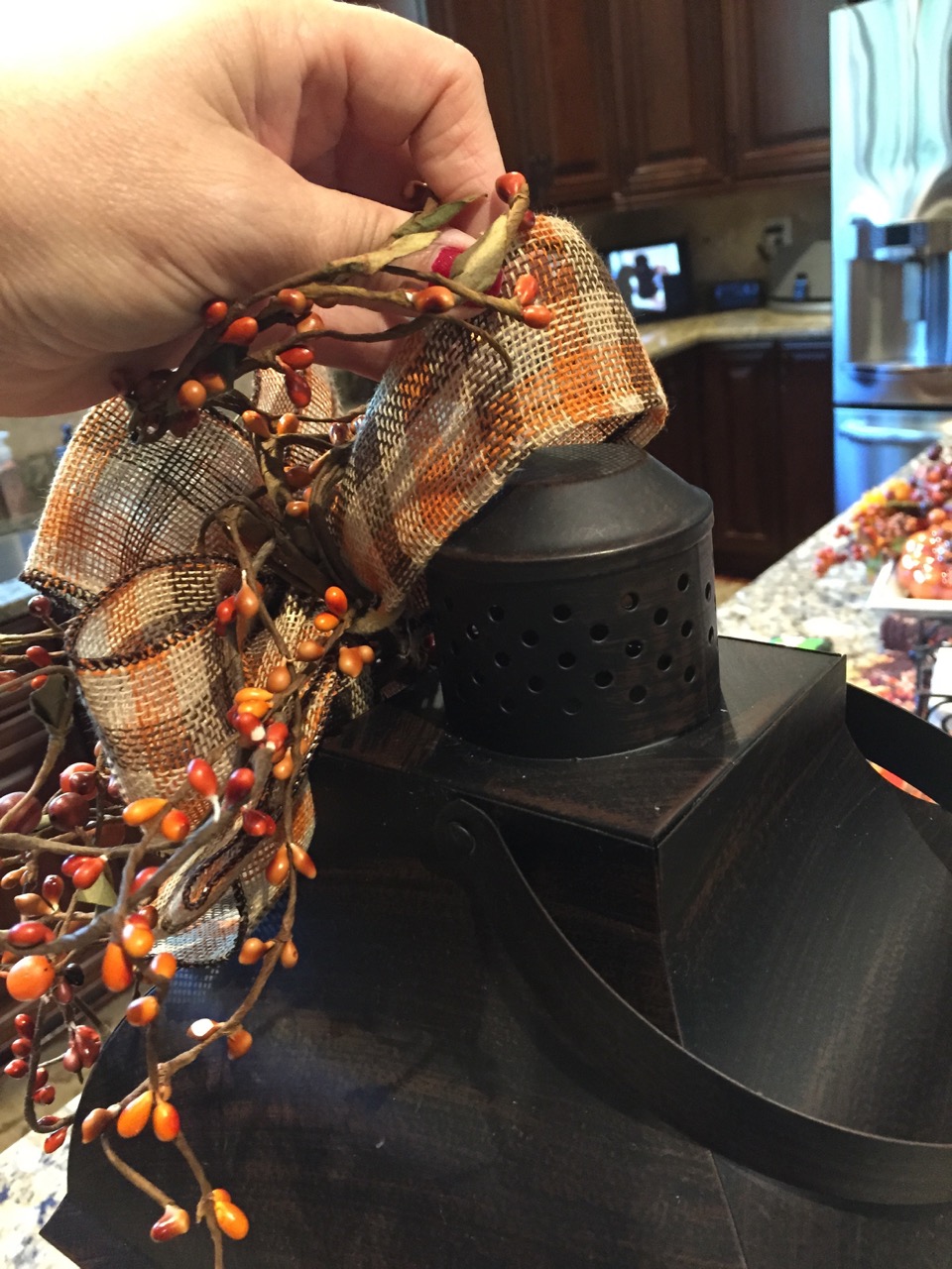 I made the bow and simply attached the small section of pip berries into the pipe cleaner that I used to hold the bow together (behind the bow). Then I took a piece of the same ribbon and attached it to the back of the bow with the pip berries.  I kind of held it up to the lantern and figured out how big of a “loop” I wanted and then hot glued it shut to that size. I then slid the entire bow topper onto the top piece of the lantern.  You can see what I’m talking about here: