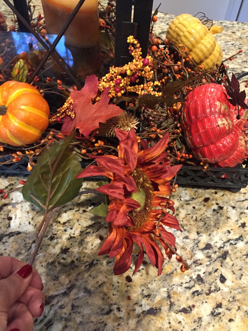 Then I arranged some glass pumpkins at each corner and filled in the spaces in front, back, and on either side with Fall floral picks and a few Fall colored sunflowers: