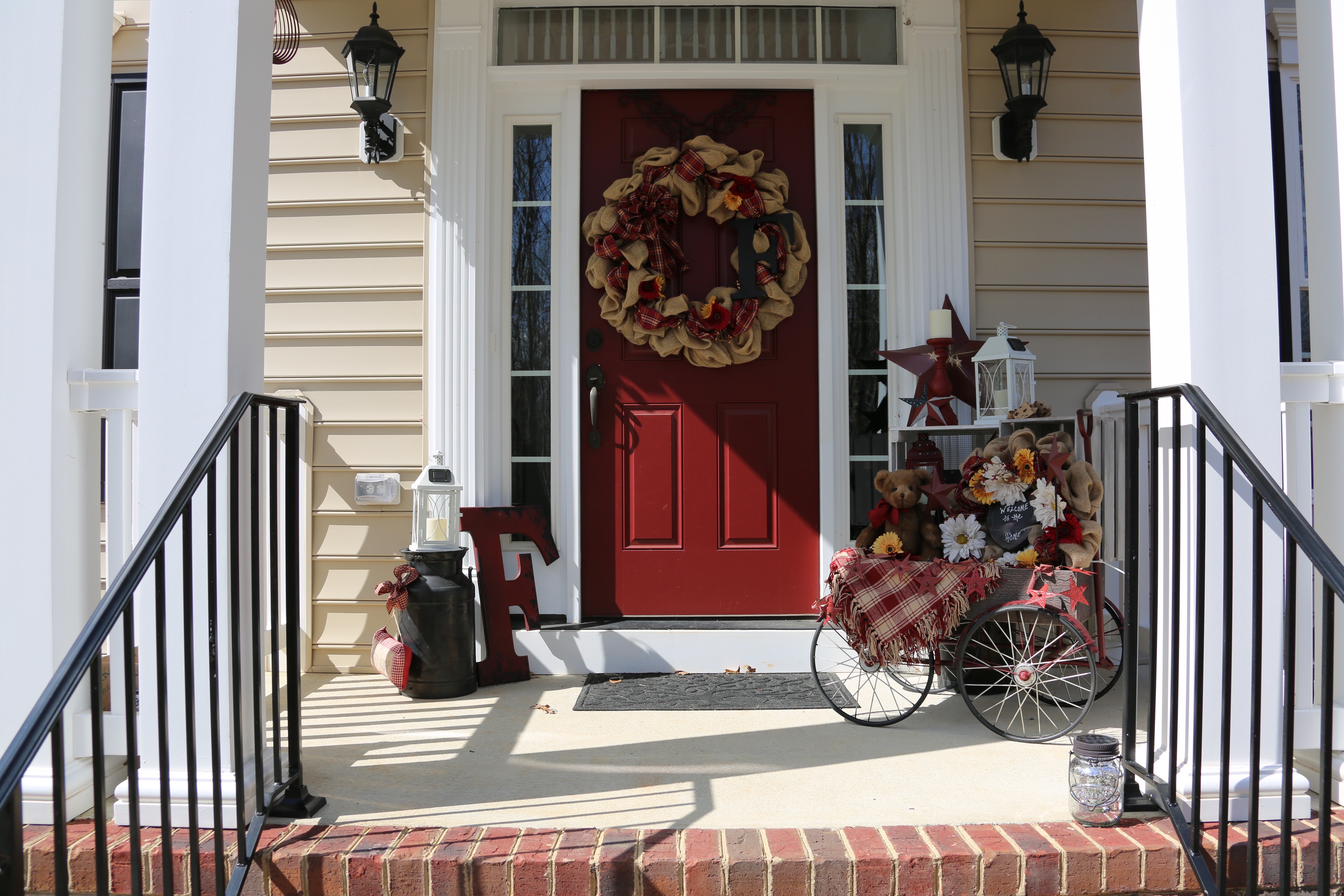 To finish the off the front porch, we added a patriotic bunting to the porch overhang. Notice I said “we” ^^^, I should have said “my hubby” as I do not climb up very tall ladders no matter how badly I want something placed somewhere..haha. Thank goodness, my hubby is willing to take care of such precarious tasks. 😉