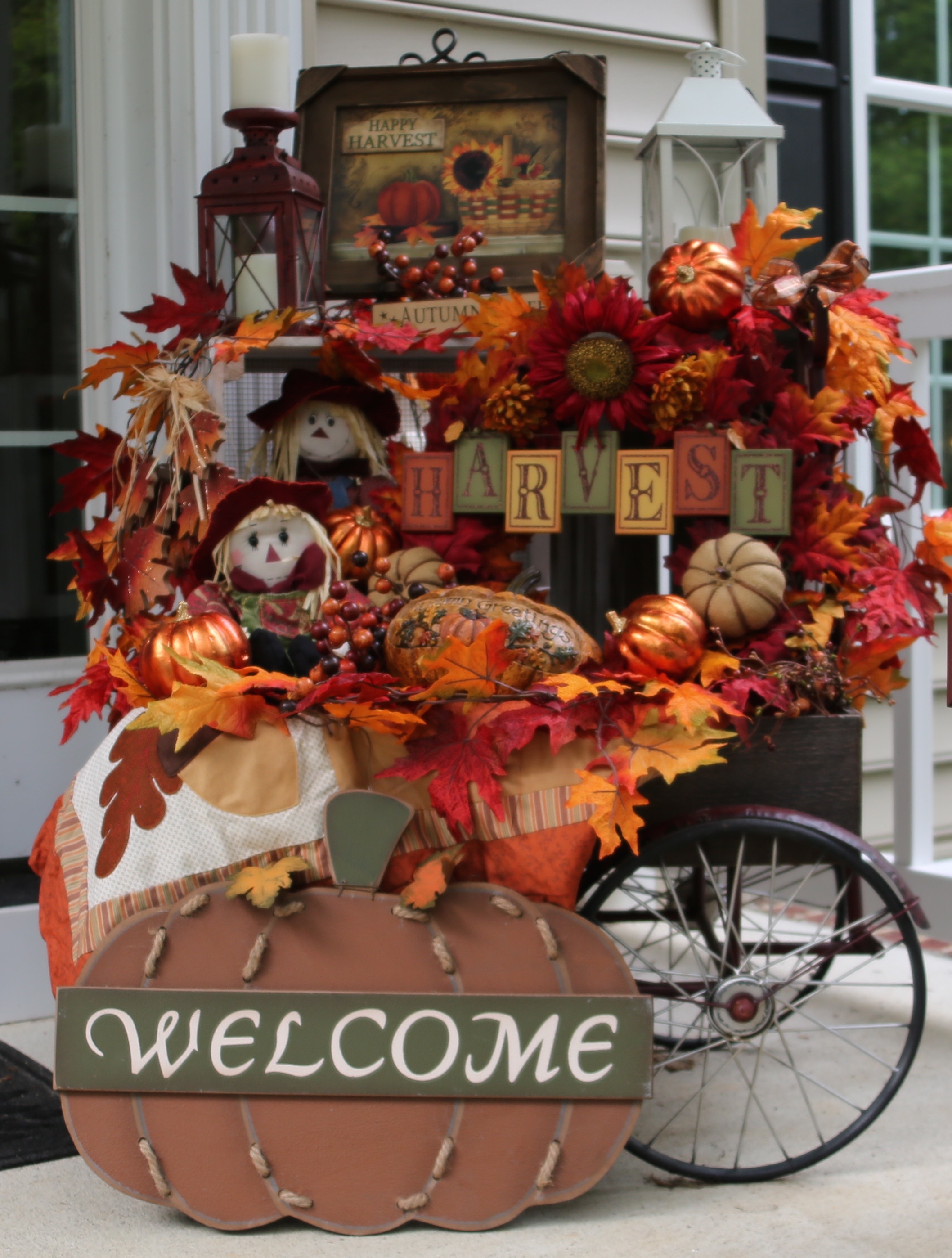 The first thing I did was to start digging through my old Fall accent pieces. I found that throw, and I had made that wreath last year, so those were two of the first things that I placed in the wagon, and then I added scarecrows, a fall leaf garland, some pumpkins, a couple of scarecrows, and a picture/plaque with a Fall theme depicted. Then I added that “Welcome” pumpkin plaque on the ground in front of the wagon and it was done, done, and done. 🙂