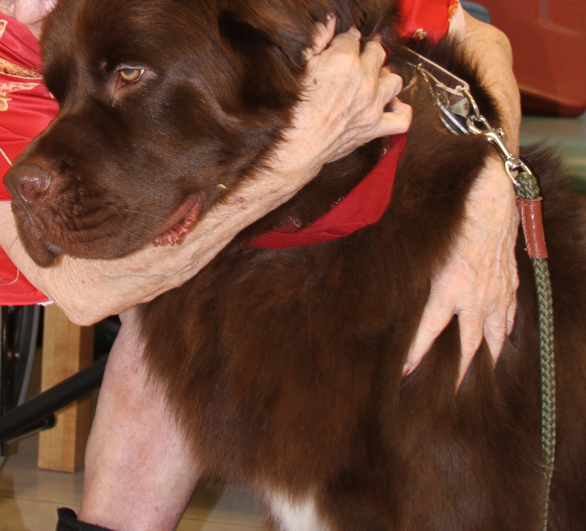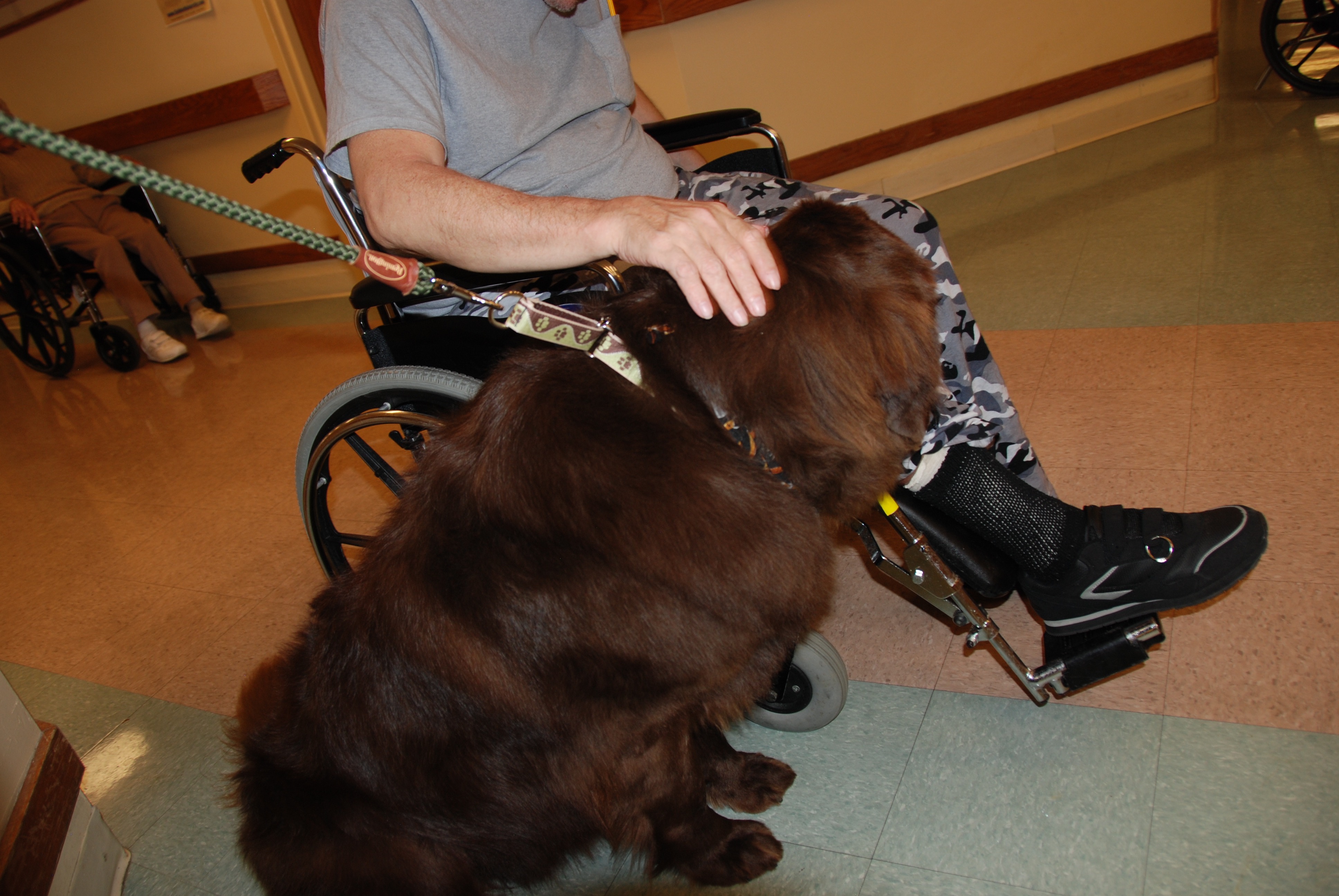 IMG_1571This is Samson, he is also a Newfoundland, he will be 6 years old soon, and he is a very special fella.  Yes, he is huge, he weighs 148 lbs. and is 30-1/2″ at the withers (exactly what the “Standard” calls for).  Samson has a sweetness about him that is undeniable, this boy has never met a stranger and has put many smiles on many peoples faces.  His favorite pastime is laying his head in peoples laps when they tell him to “Come say hi”. ❤  My Mom, who passed away a few years ago, was in a nursing home for the last several years of her life (Alzheimer’s–hate it).  Whenever I would go and visit her, I’d take Samson along with me, trust me when I say that this boy was much loved in that nursing home; his very nature was meant to help people feel better. Here are a few pictures of him at the nursing home, he was amazing: