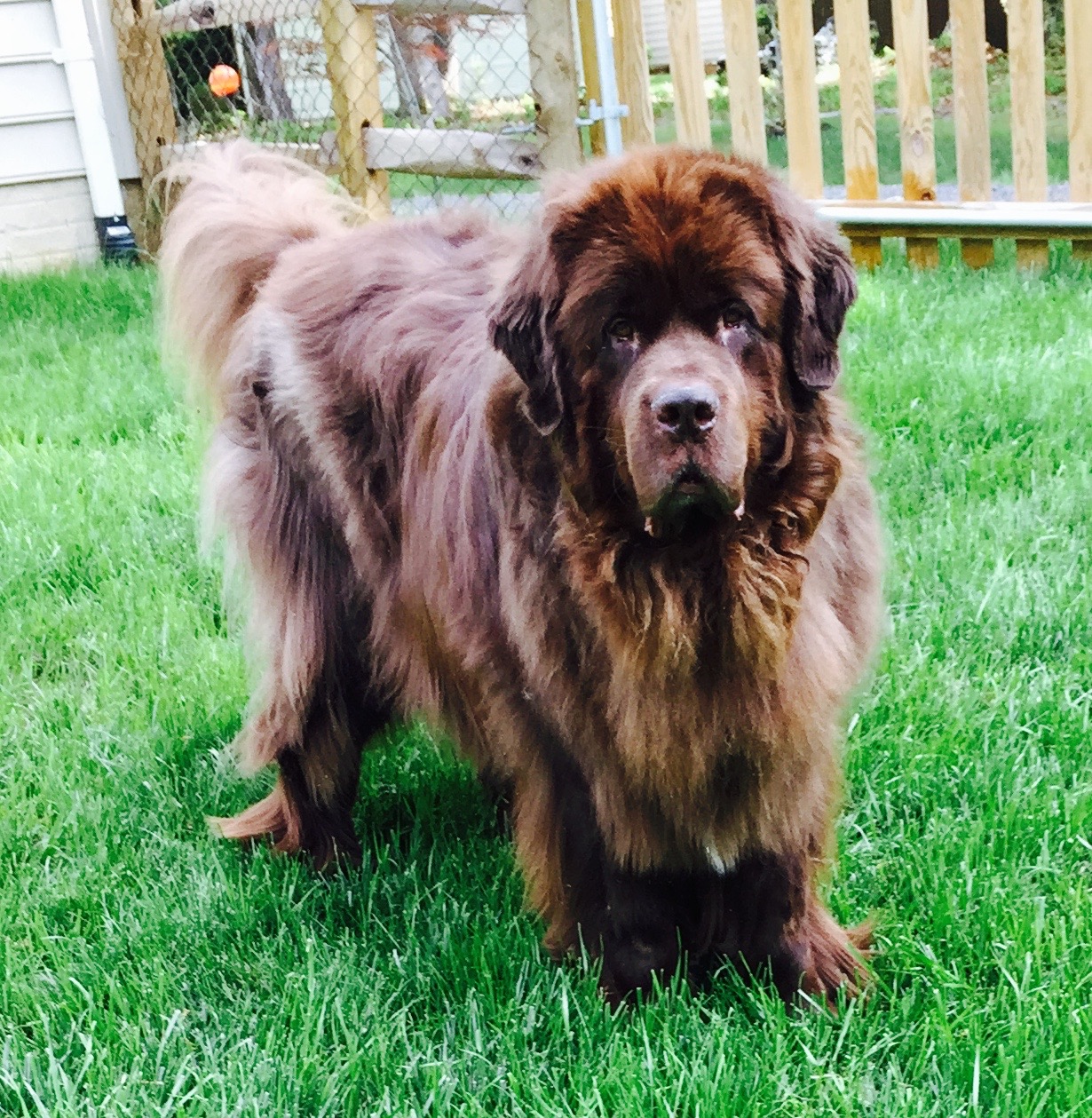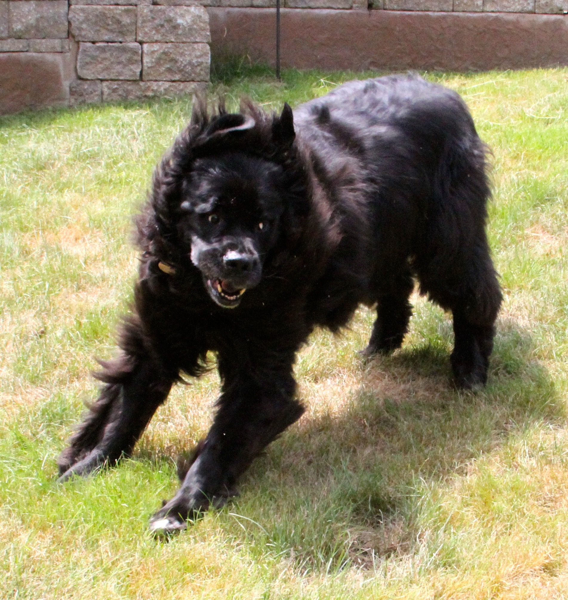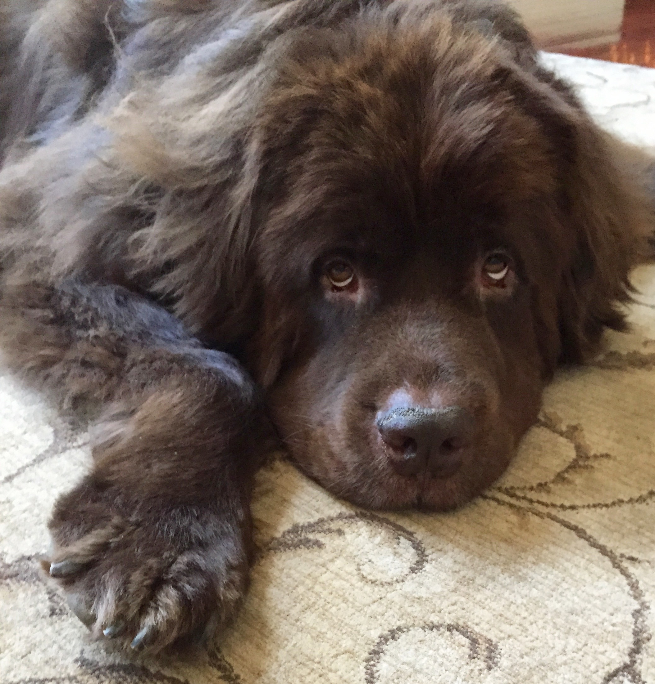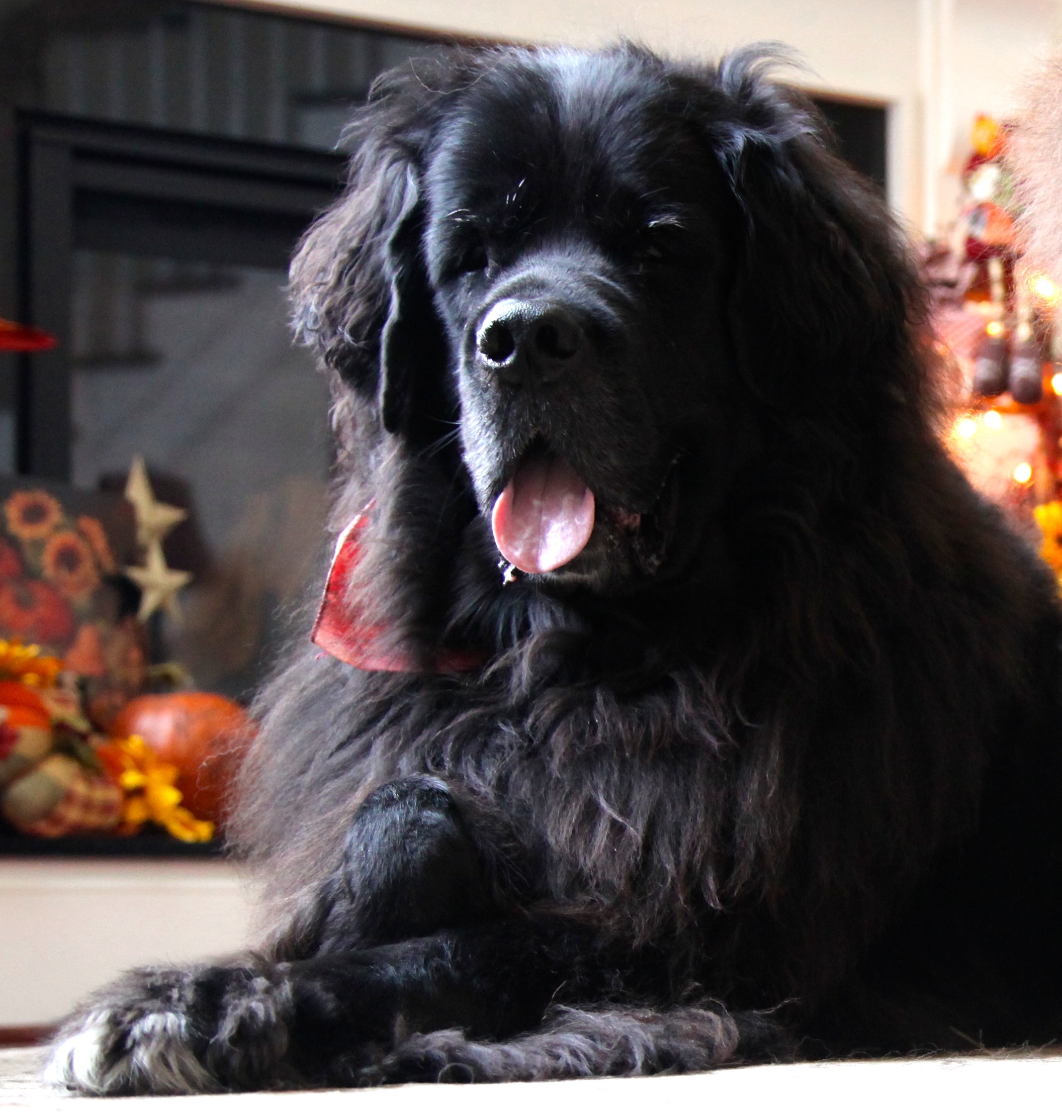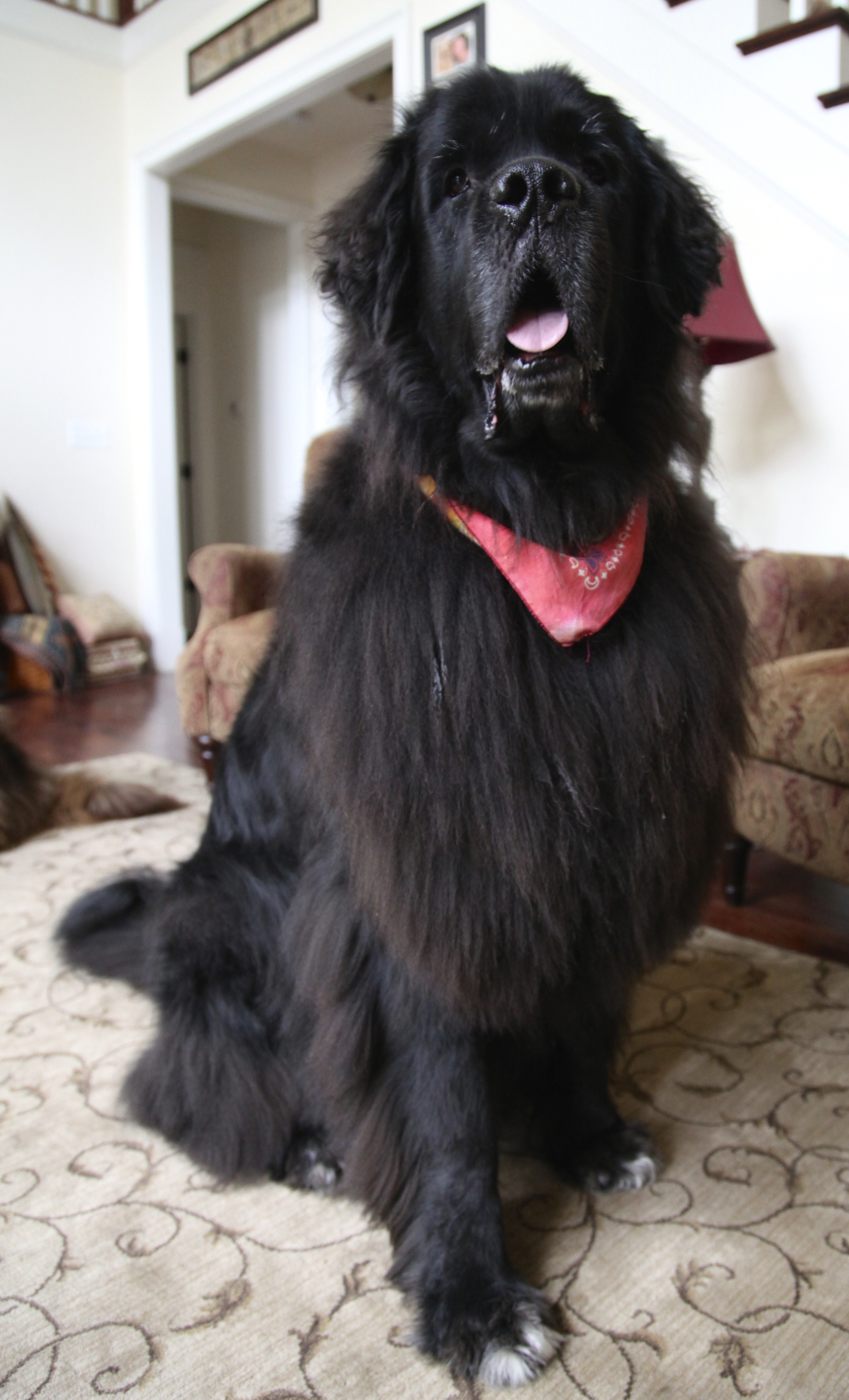 IMG_6830This is Sophie, she is a Newfoundland, and will soon be 9 years old.  Her big personality matches her physical bigness, she weighs 161 lbs. and is 32″ at the withers (yes, she is bigger than the “Standard” Newf…more to love in my humble opinion). 🙂  This girl was quite an ornery puppy, in fact, there was the one time that while trying to retrieve a ball from under a couch, she literally pulled said couch away from the wall and into another room in order to capture the ball again <~~~ That is a true story! lol She has calmed down in her older age, although, she is still as agile as can be, she runs like the wind, and is as animated as the day is long. When we were building this house, we’d let her ride along with us over here every day so she got accustomed to her ride (you know we went *just* for her…<~~ in her mind anyway), so now-a-days at 2pm every single day, without fail, I take her for a little ride around our neighborhood—no, I do *not* spoil my dogs… <~~~ I just told a big fib! lol 😉 But, Sophie gets so much joy out of that little ride each day, I just can’t deny her. 🙂  This girl doesn’t have any health issues!  Her white muzzle and eye lashes and brows are the only way that one can tell she is getting up in age.  She is as strong as an ox and I feel as if she will be with us for many years to come. ❤