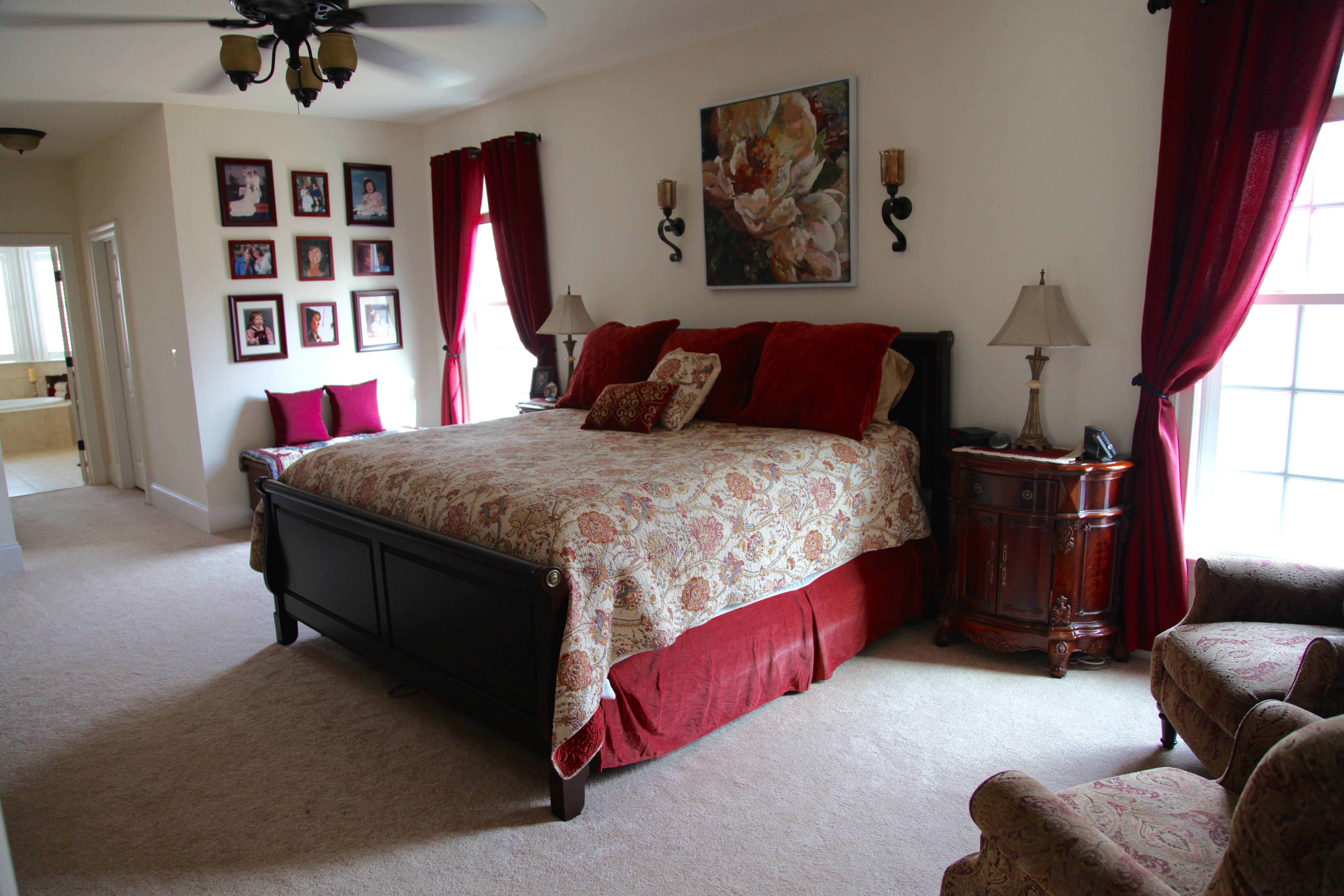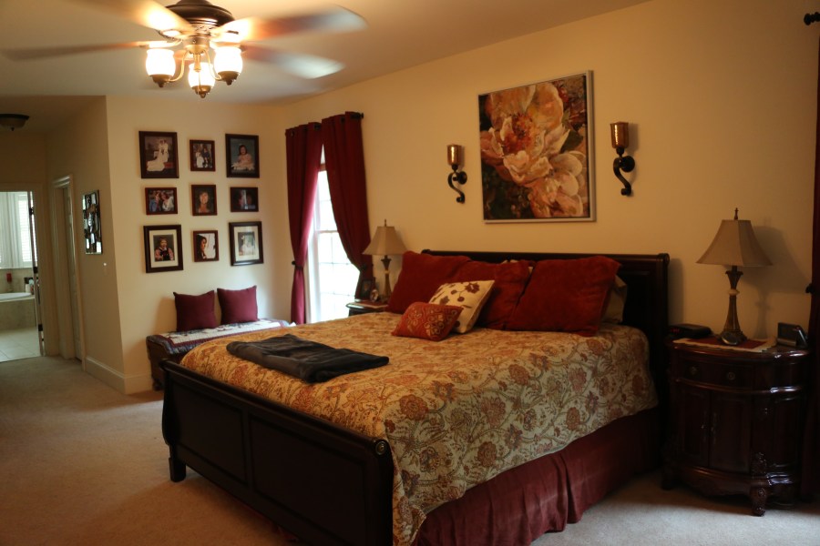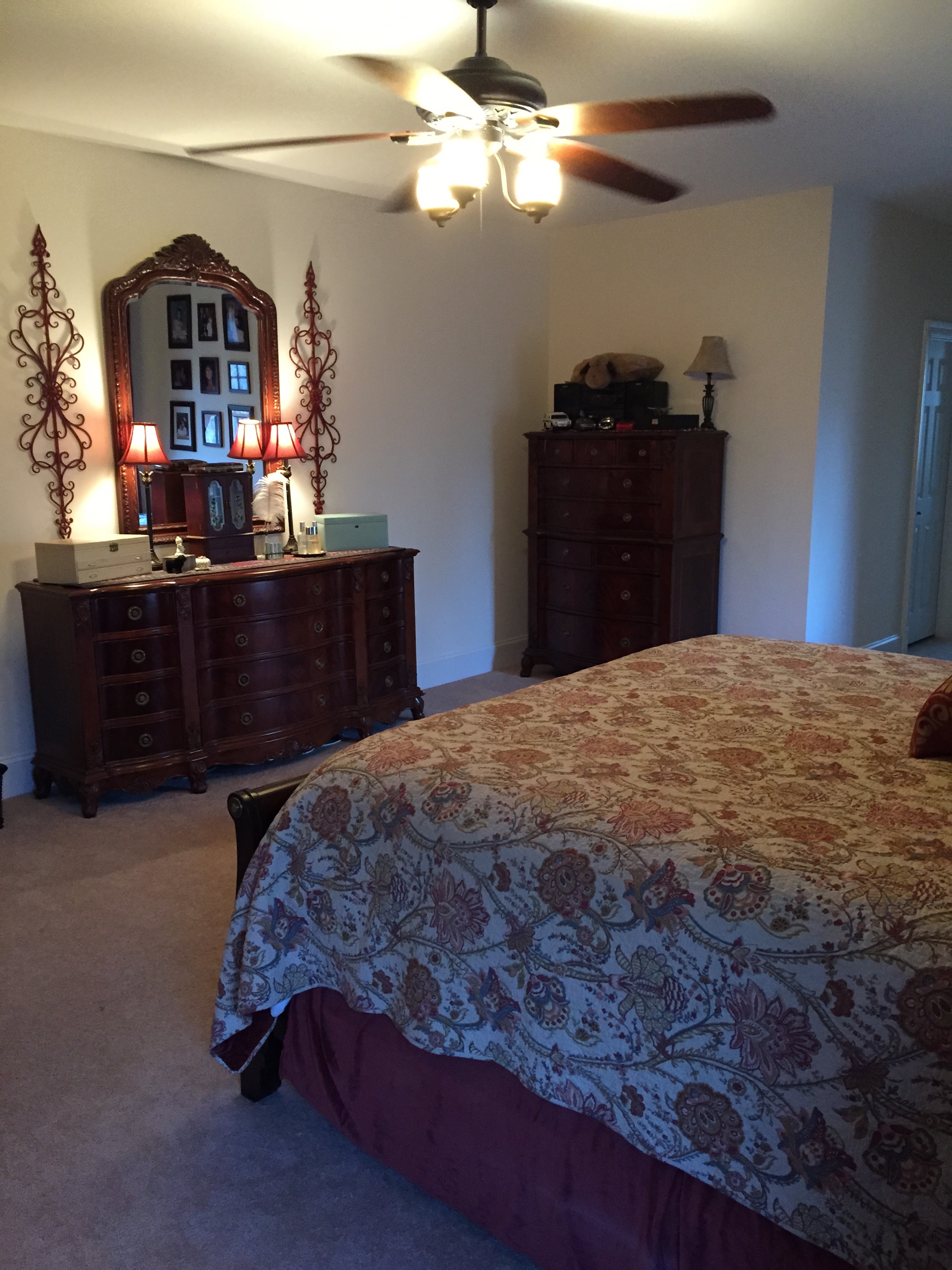 I would have to say that our bedroom is the least decorated of all of the rooms in the house, but, regardless, I’ll go ahead give you a little glimpse.  When we built this house, we had this room extended by 4 feet which makes this quite a large room–25′ x 16′ (or thereabouts).  We have a king-sized bed, two bedside tables, two dressers, a corner shelf, two chairs with a stand in between them, and my cedar chest and we still have tons of room.  We have two walk-in closets and master bath as well.