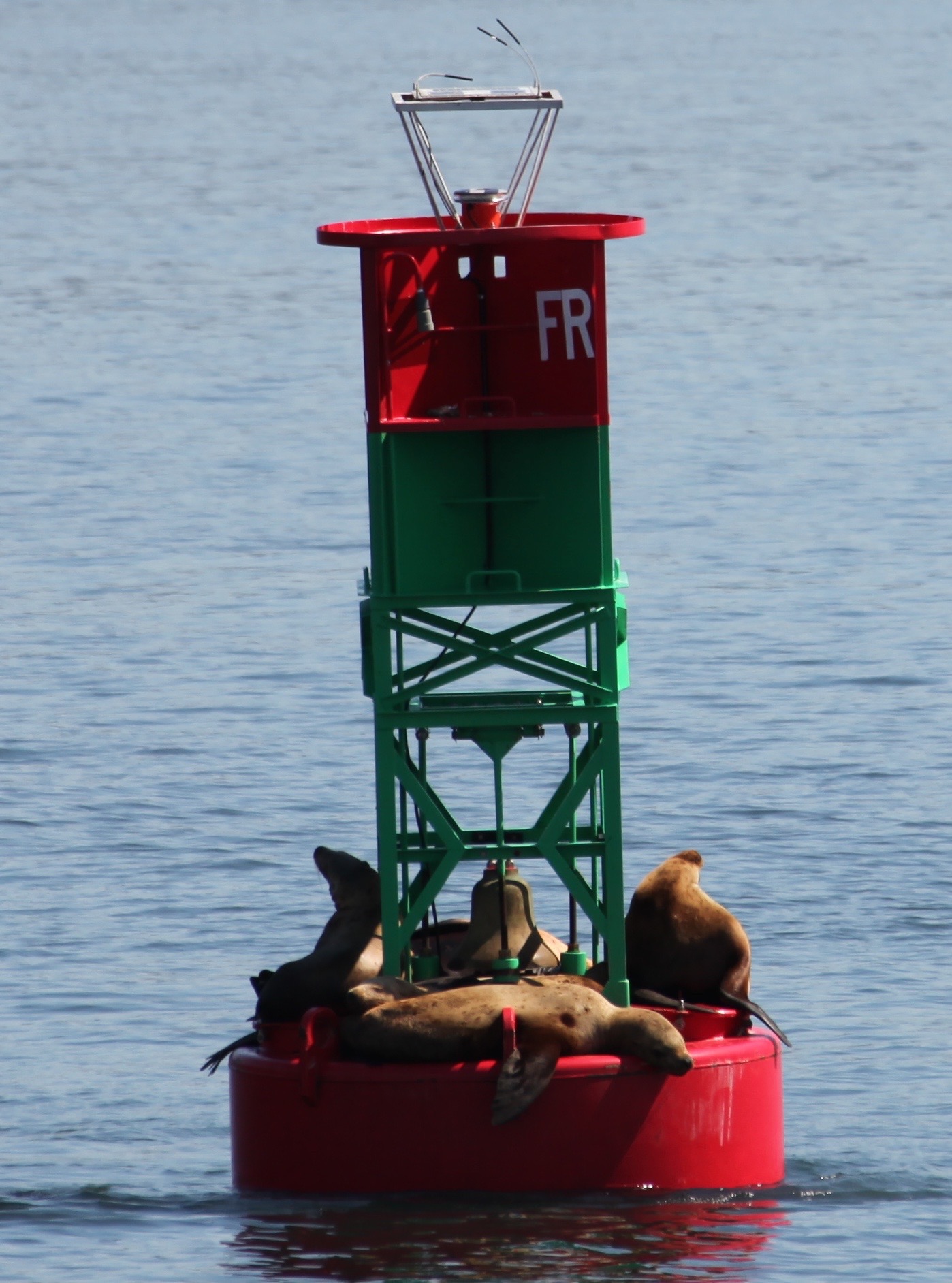 This is a coastguard buoy and the steller sea lions are lounging on top if it sunning themselves. They are too cute and they are quite entertaining to watch. There is definitely some jockeying for position happening, but all in all they share the space well. 🙂