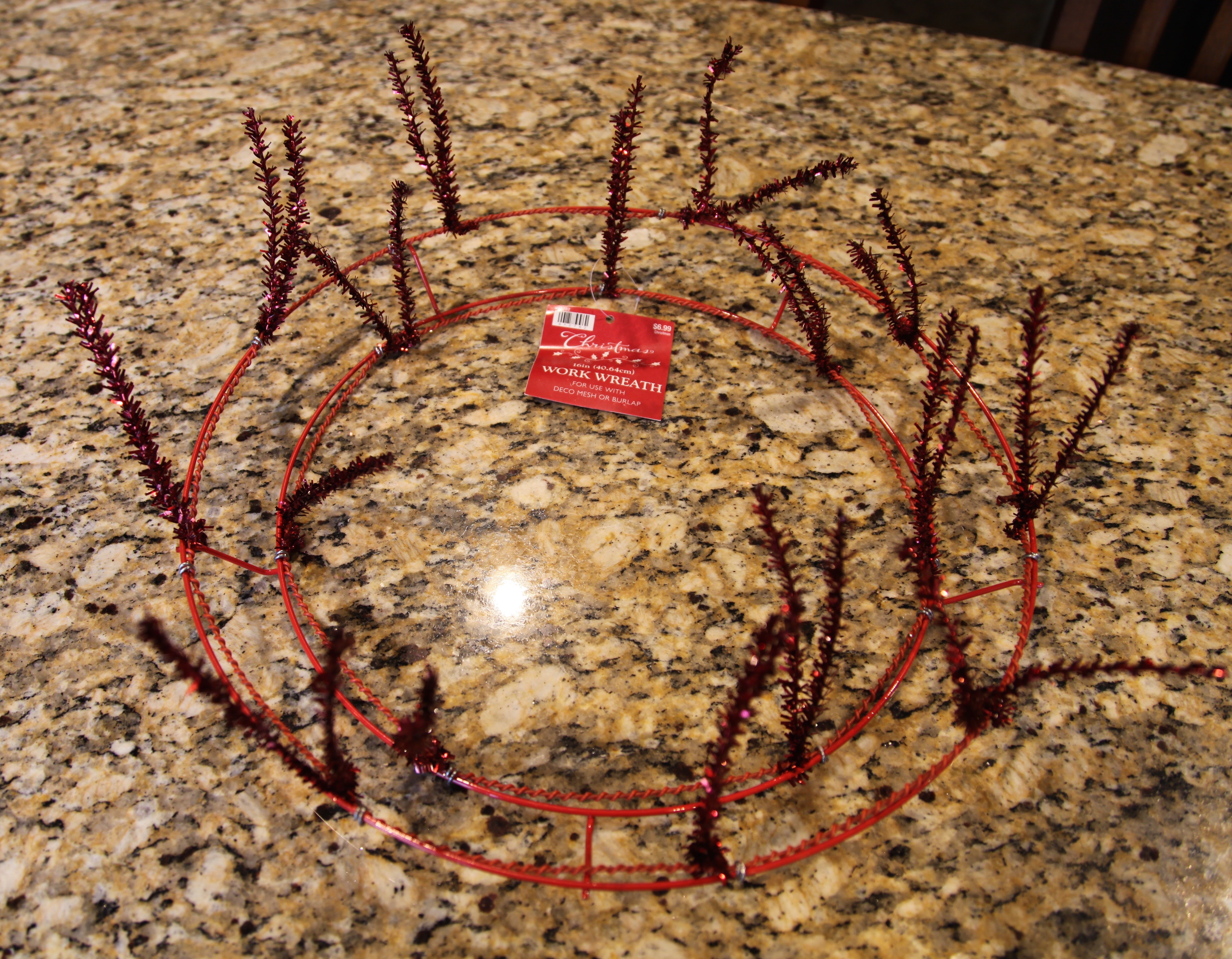 So, here we go…I used a 16″ “work wreath” which only means that it is a metal form with chenille twist ties already attached. I actually was able to find one with red twist ties on sale at Hobby Lobby in the Christmas department.