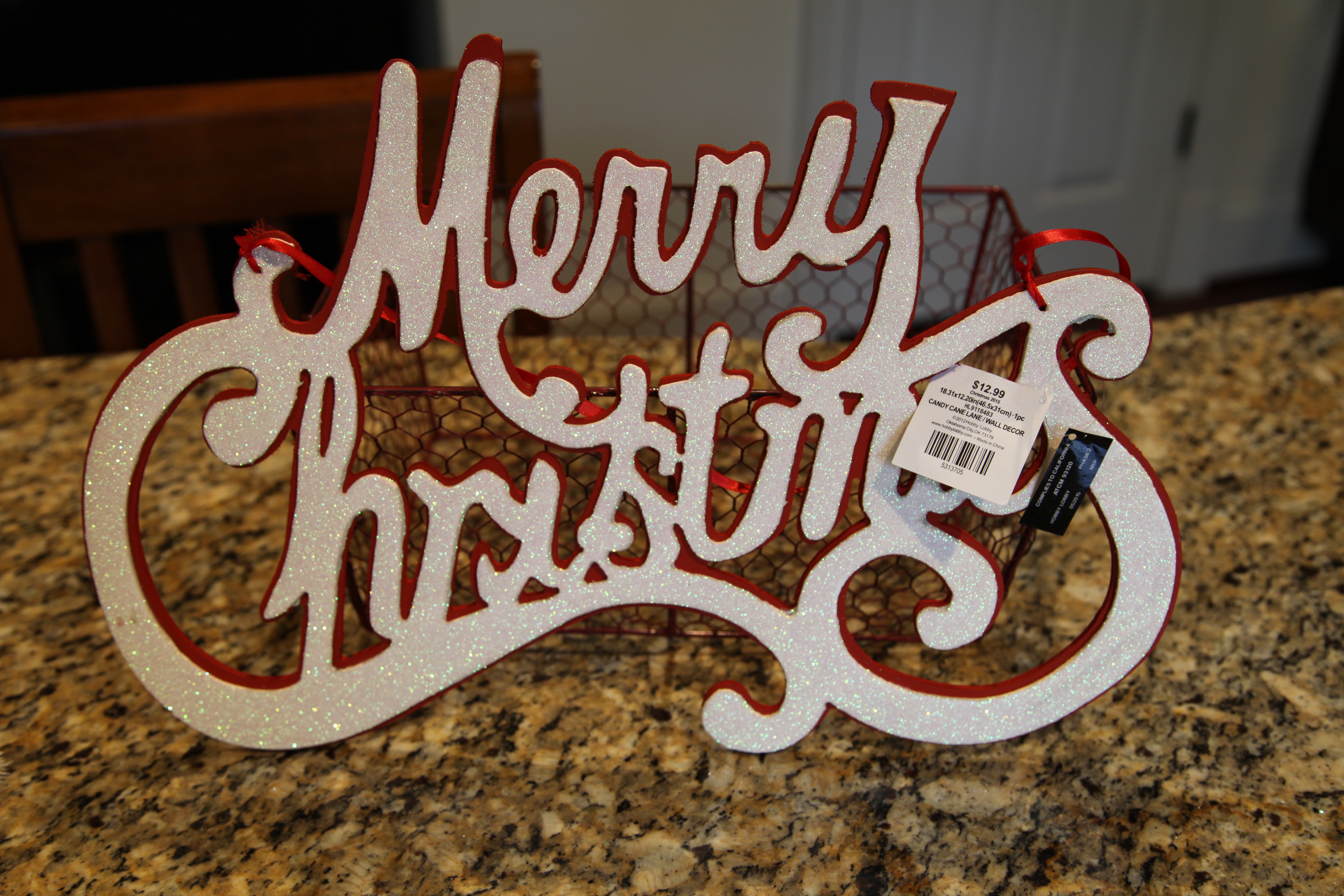I found a “Merry Christmas” worded sign with glittery white lettering, I was able to tie that into the twist ties; I did glue it in a couple of places as well…
