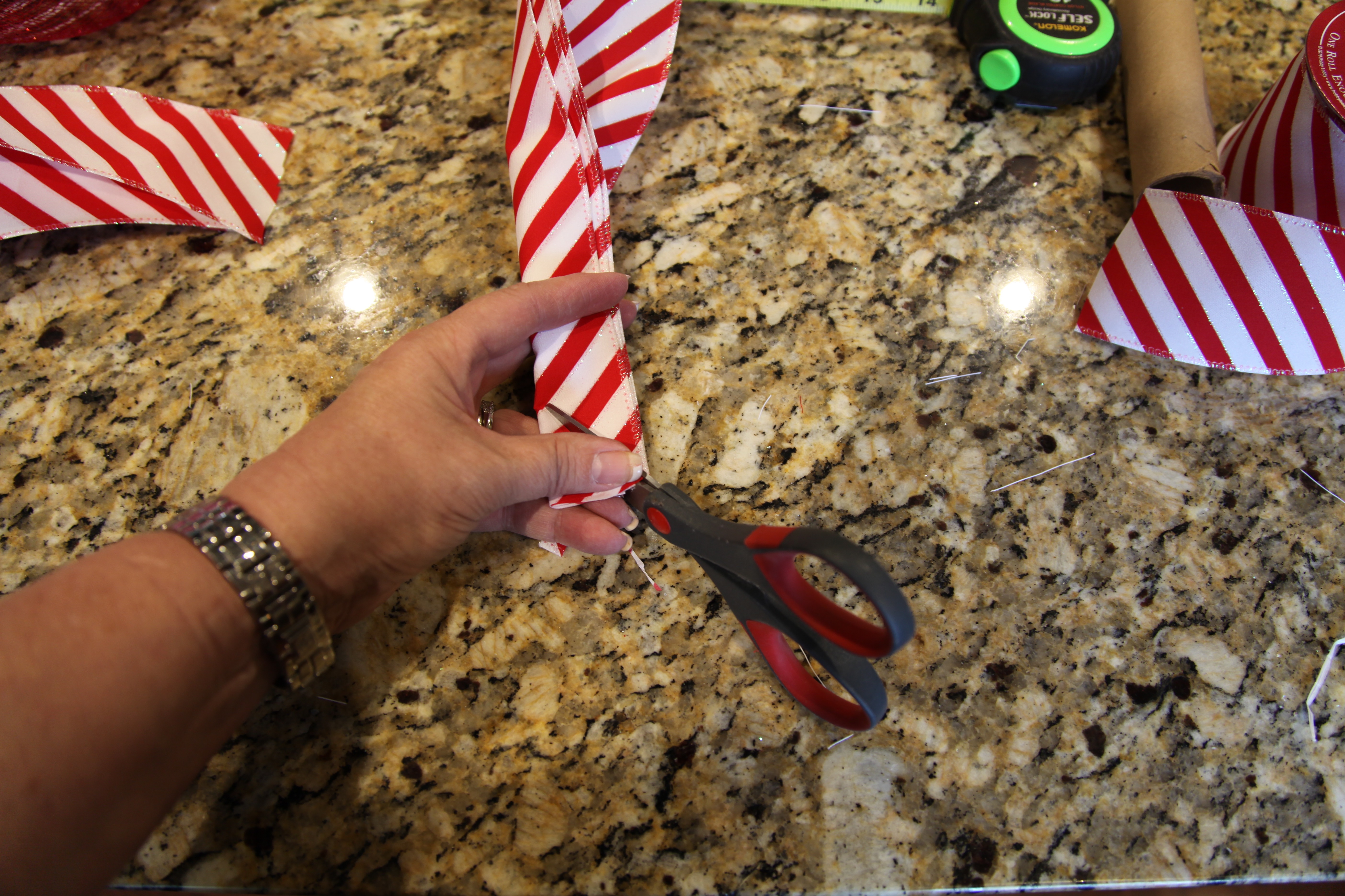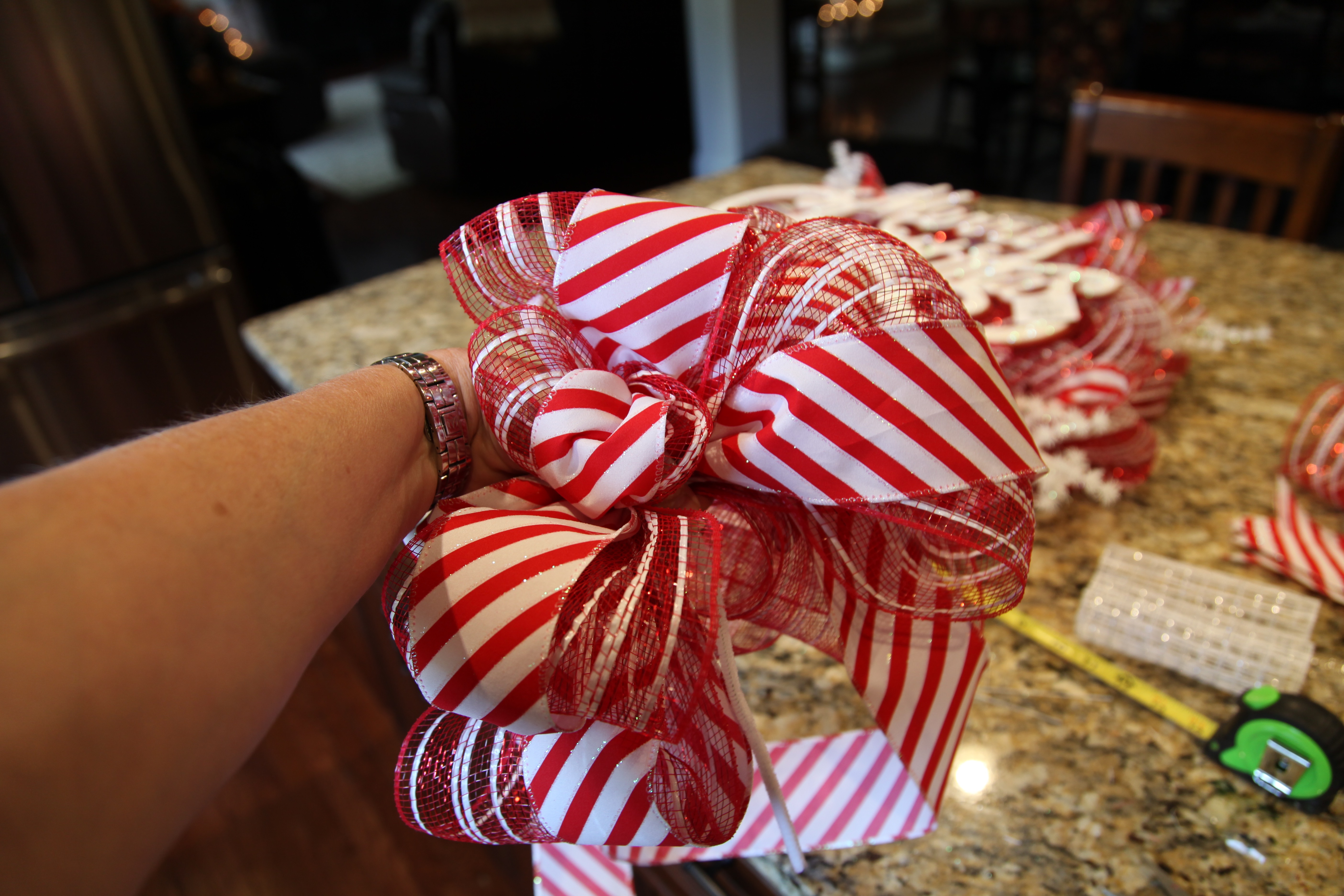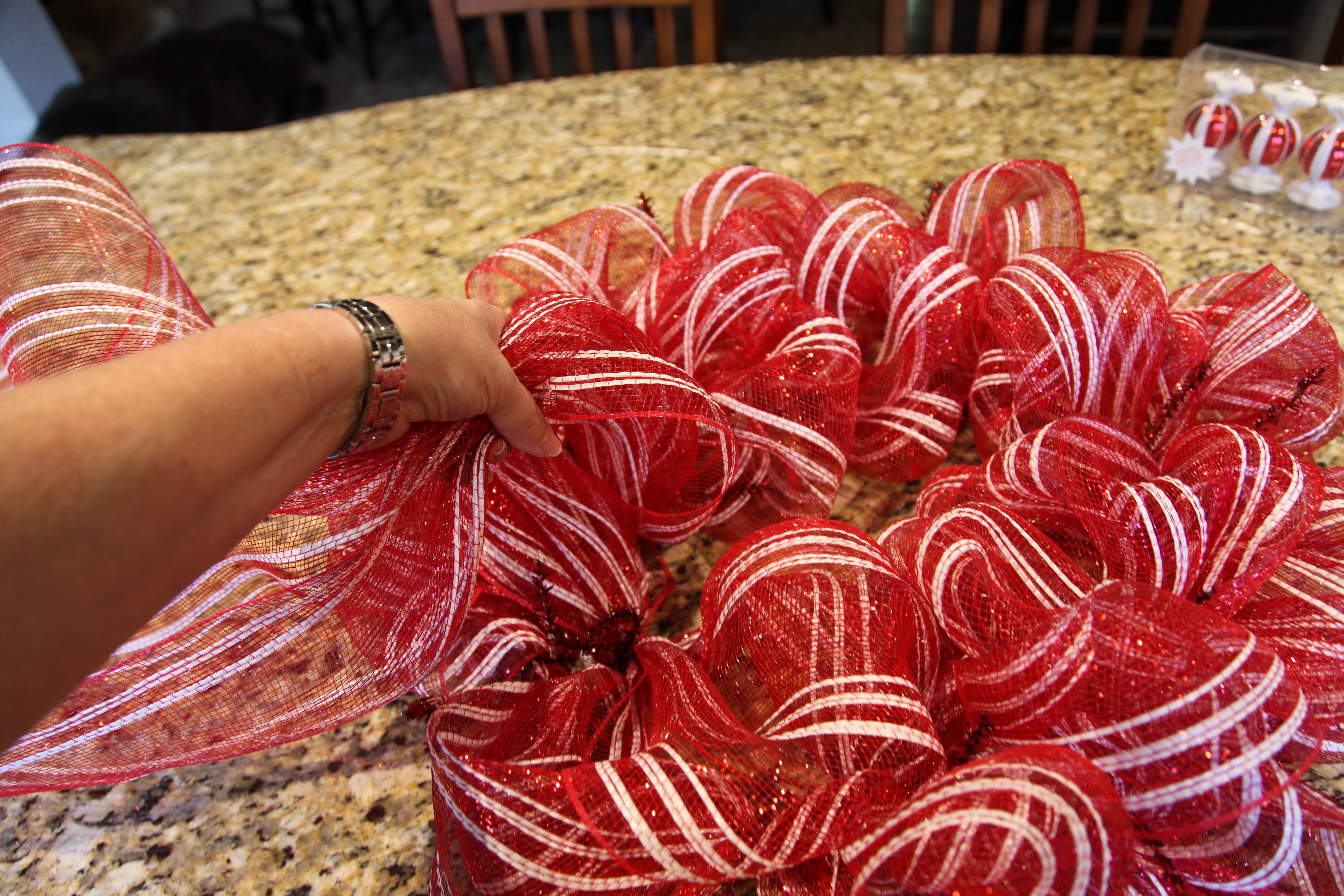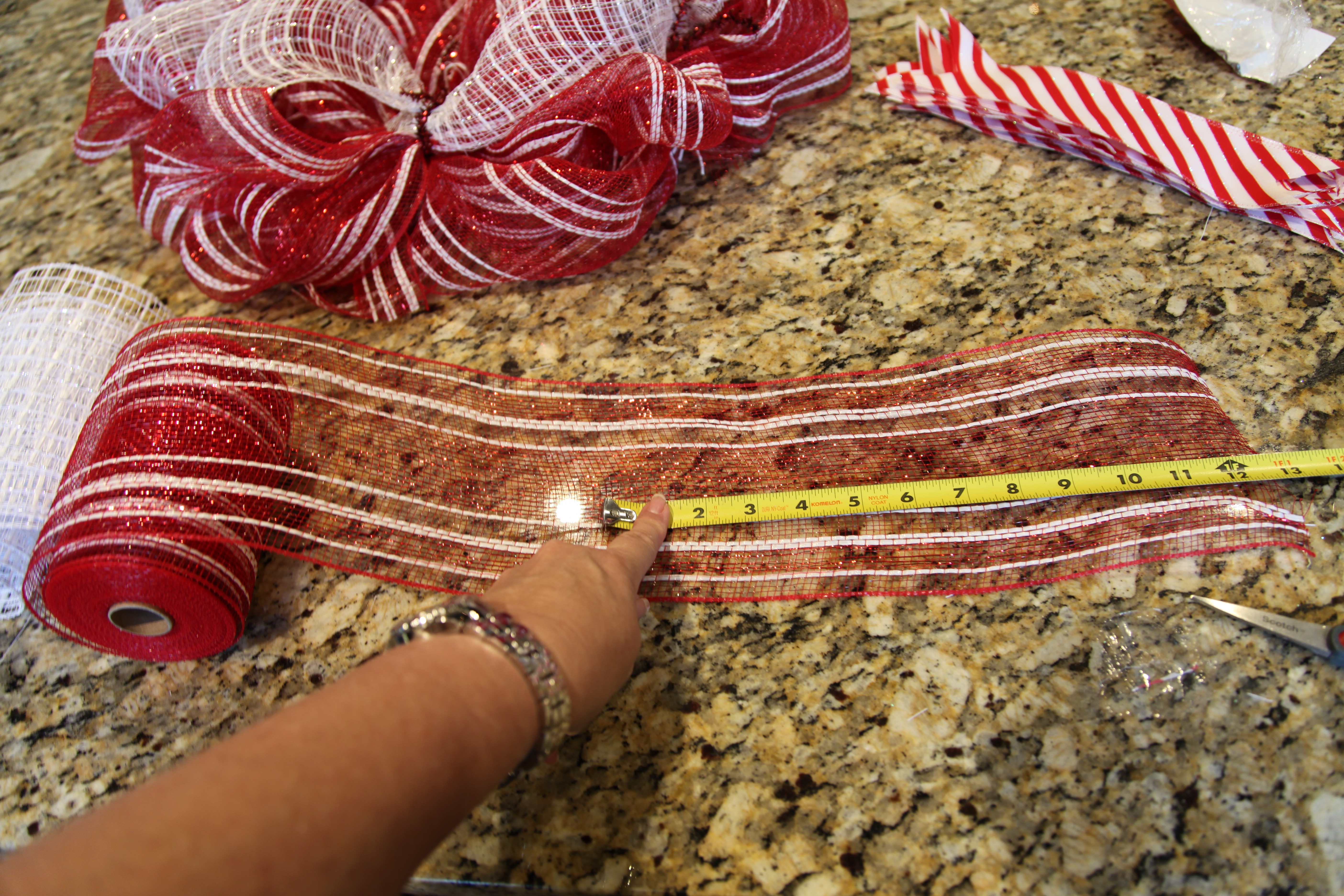 Now to add a few extra adornments to the wreath, I took some 5″ deco mesh ribbon in the same pattern that I used for the wreath and I cut 4- 12″ strips, and I did the same thing with some red and white striped wired ribbon.