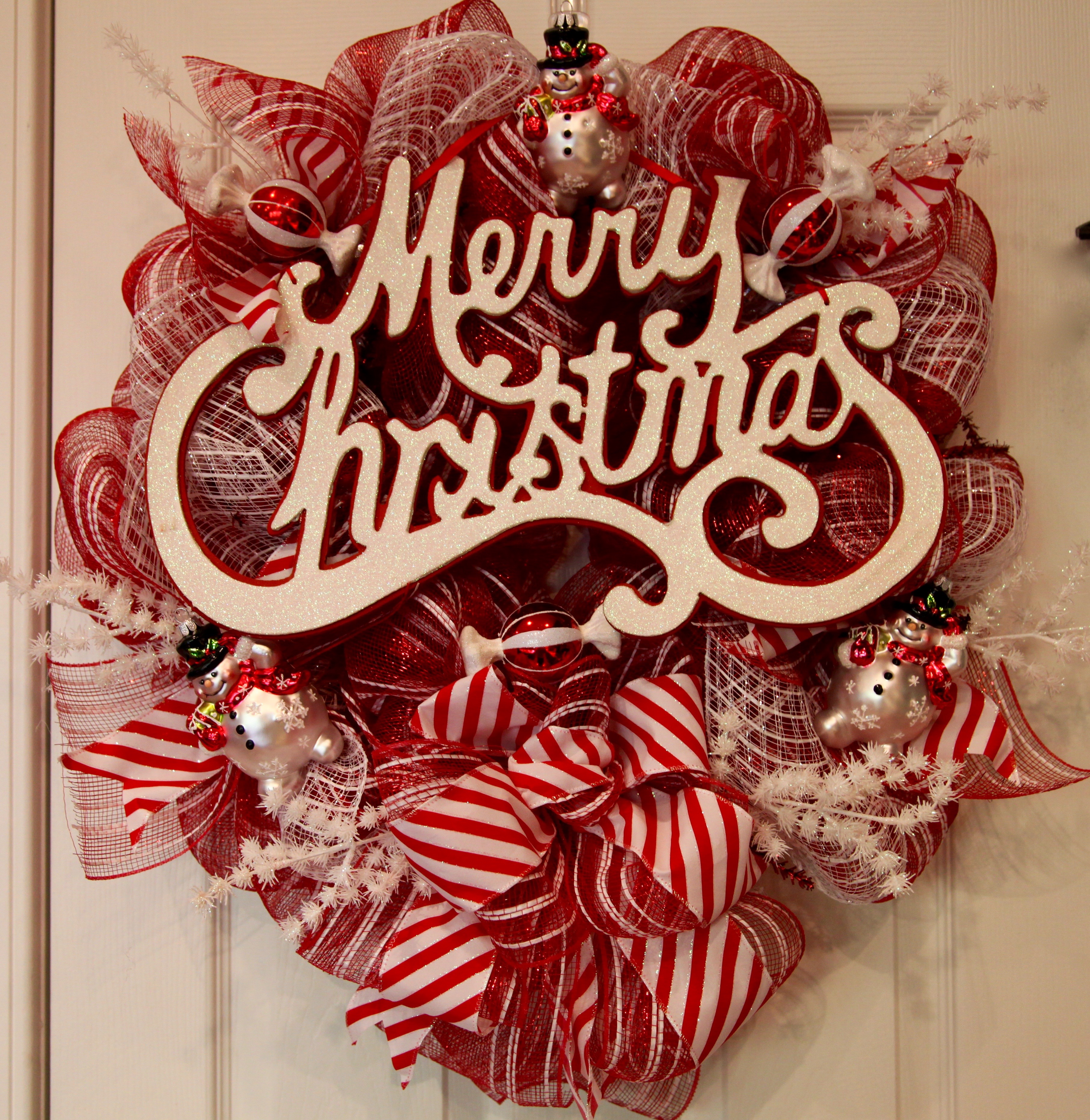 Next, it was time to place a few snowmen and candy Christmas ornaments; I hot glued them into place and called it done.
