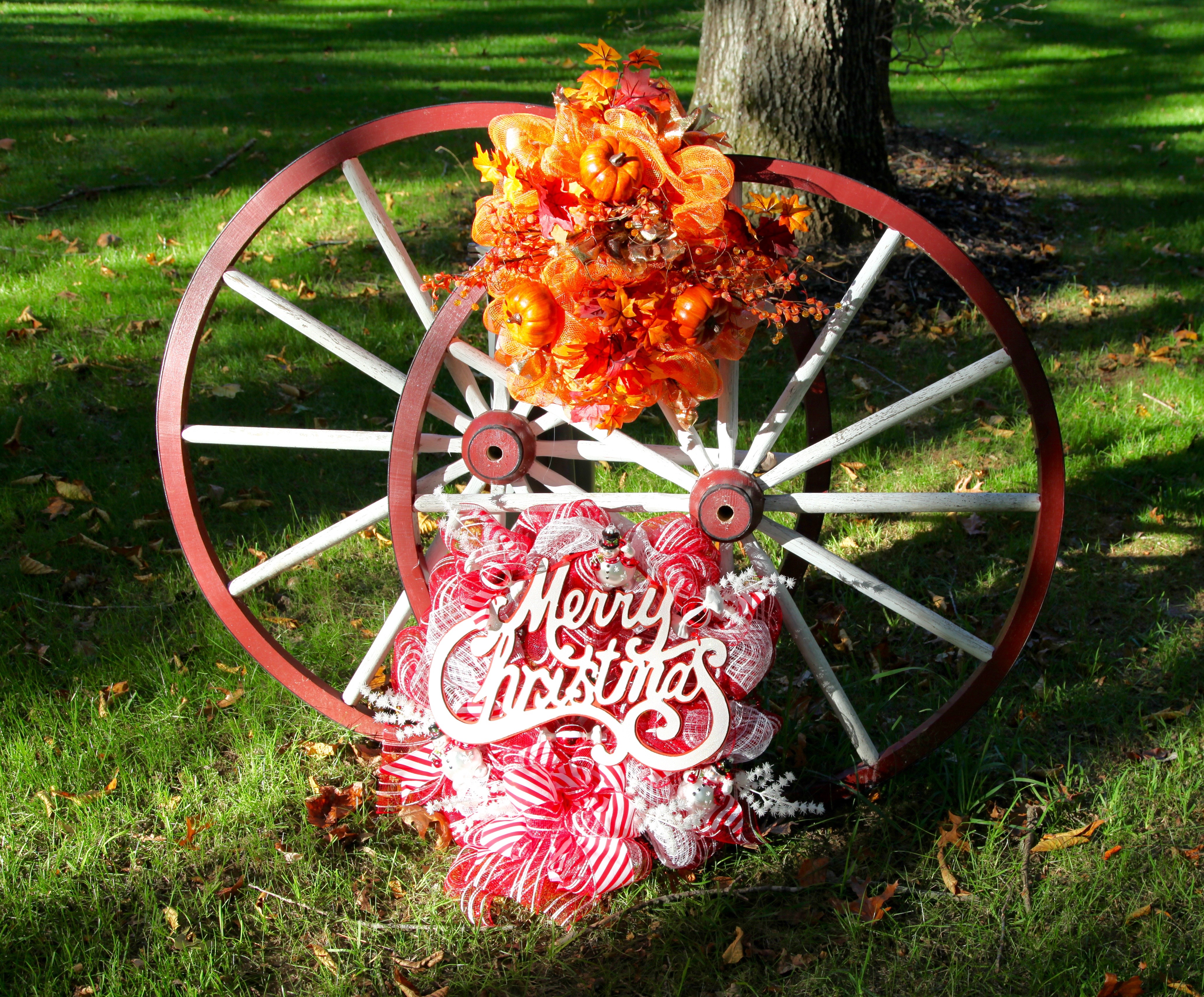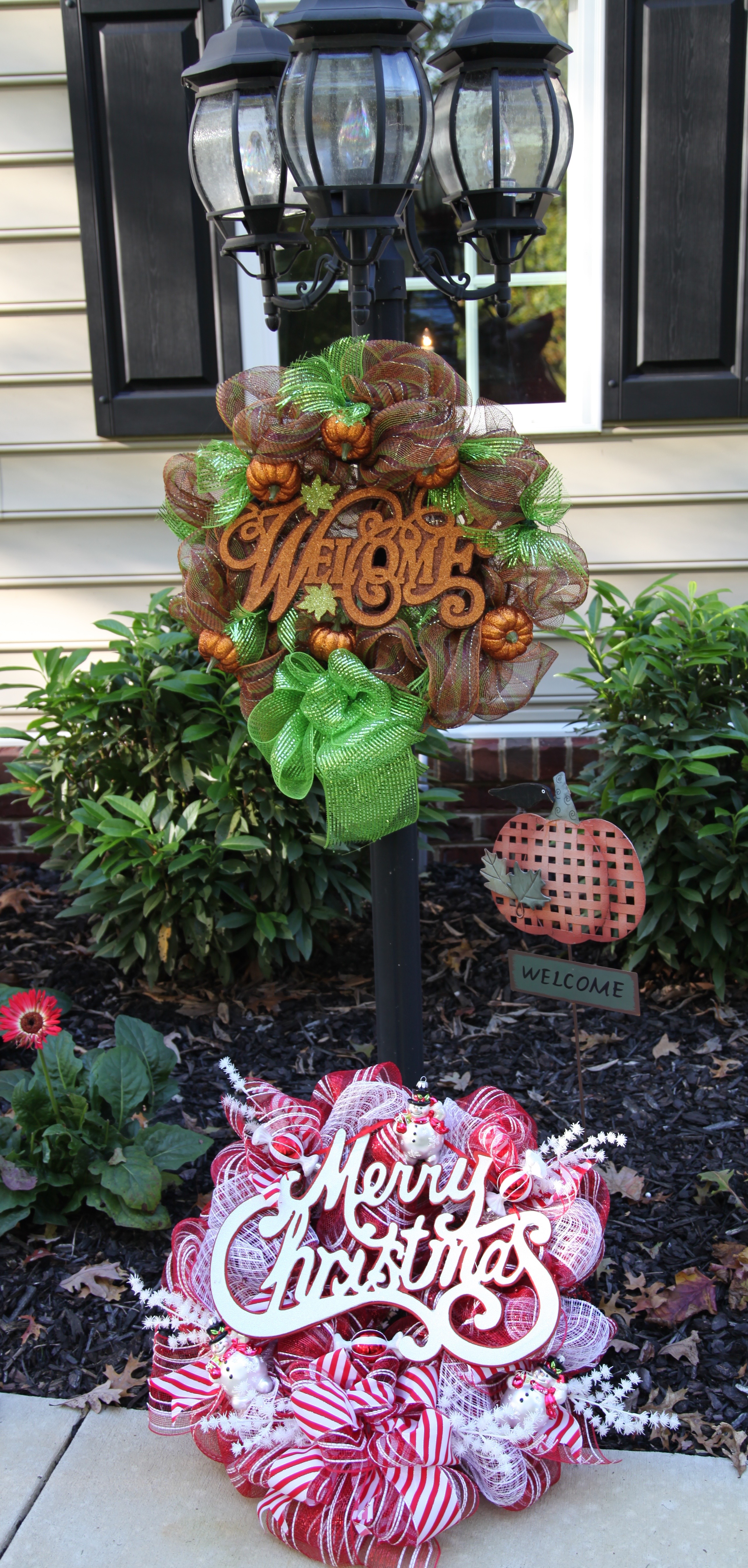 When it is time to decorate for Christmas, this wreath will replace my Fall wreath on the light post…