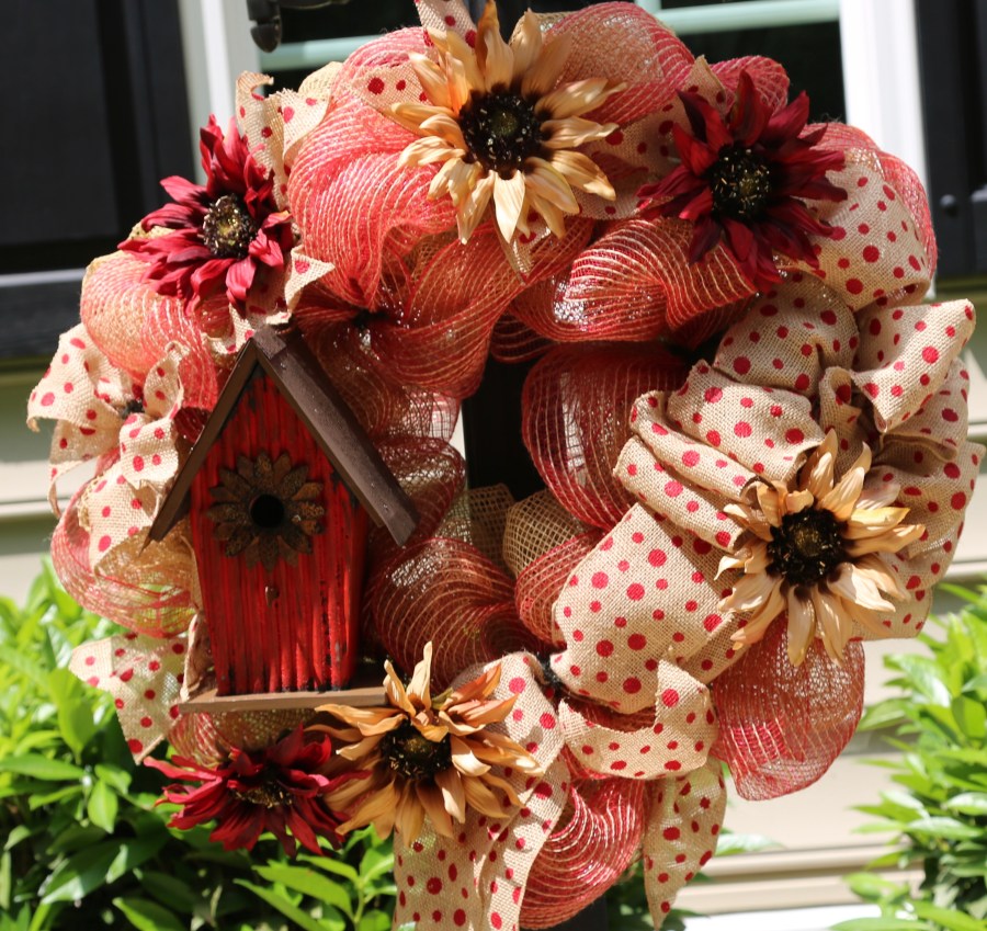 To say it has been hot in our neck of the woods is an understatement! It has been so hot that one of my outdoor wreaths has been losing its glued on accent pieces…<sigh>. A couple of weeks ago, I had redecorated the Little Red Wagon (<link to video tutorial showing you how I created that decor) that sits on the front porch. In addition, I had made a new Burlap & Birdhouse (<~~ link to video tutorial) front door wreath. Red, cream, and khaki were some of the colors that I incorporated into the decorations. I just happened to have a grapevine wreath already made and decided to go ahead and hang it on the front light post…welllllllll…That has ended up to ***NOT*** be one of my brighter ideas as the temperatures have soared and so has the humidity with it…that poor wreath that was held together by hot glue started to lose its accent pieces, they were literally melting off. I knew I needed to make a new heartier wreath to hang out there asap.