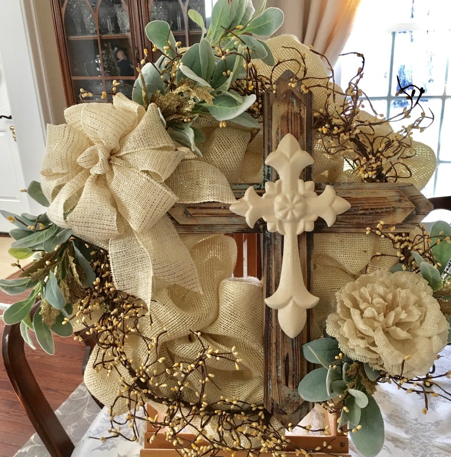I love, love, love this cream wreath. I hope to make one similar for my brother and his wife for Christmas this year. So I’m gathering items that I will need… Do you remember where you purchased the cross from?