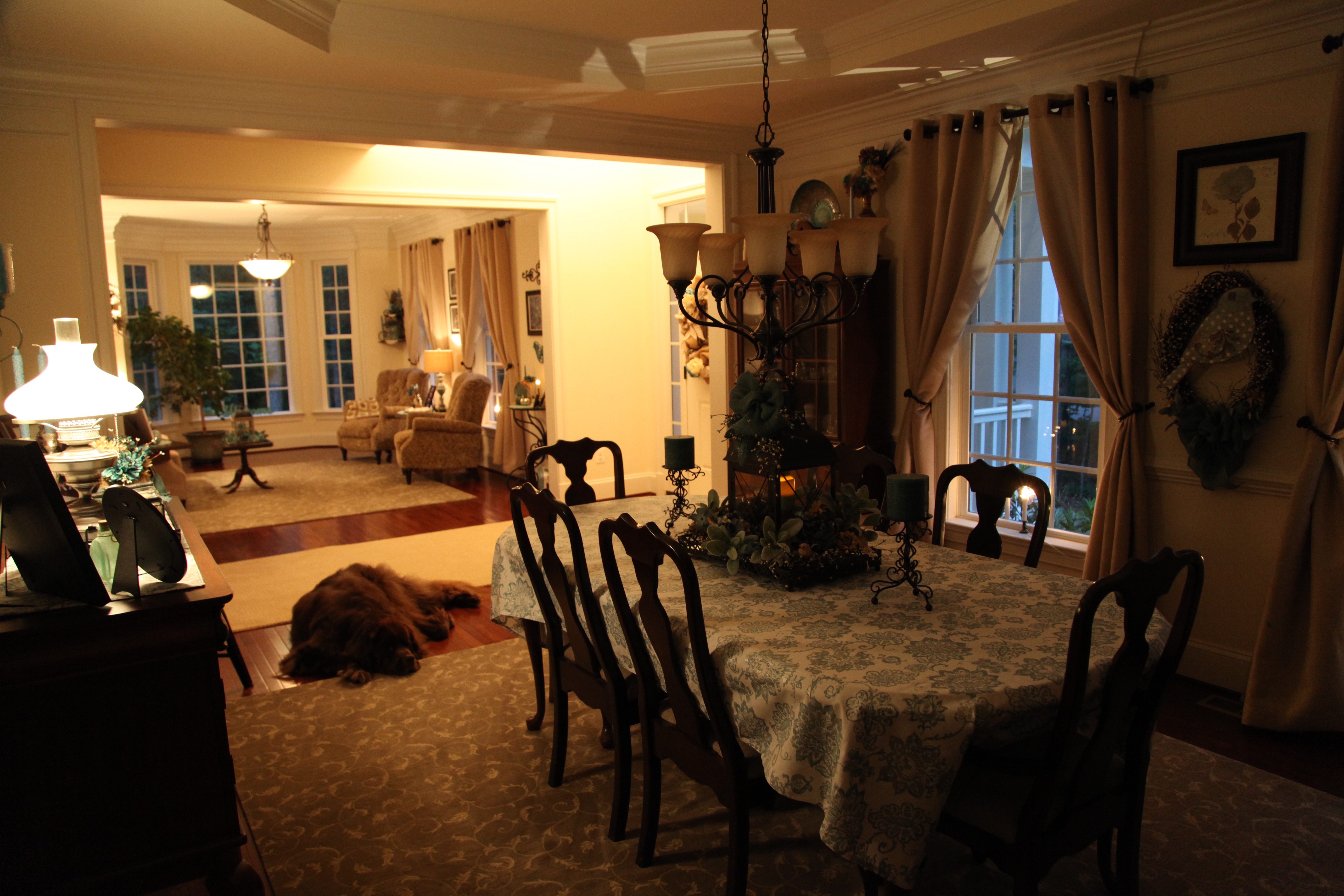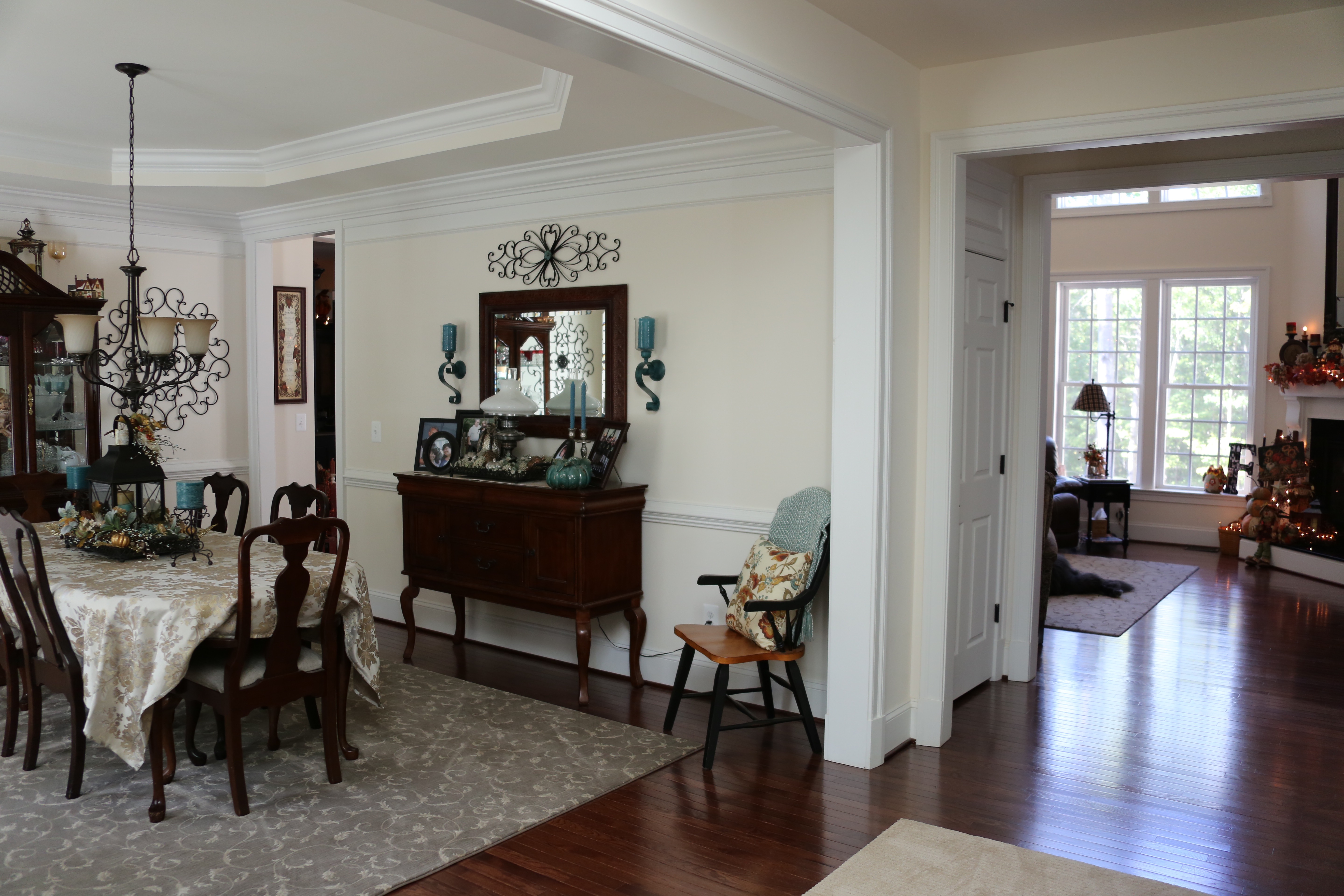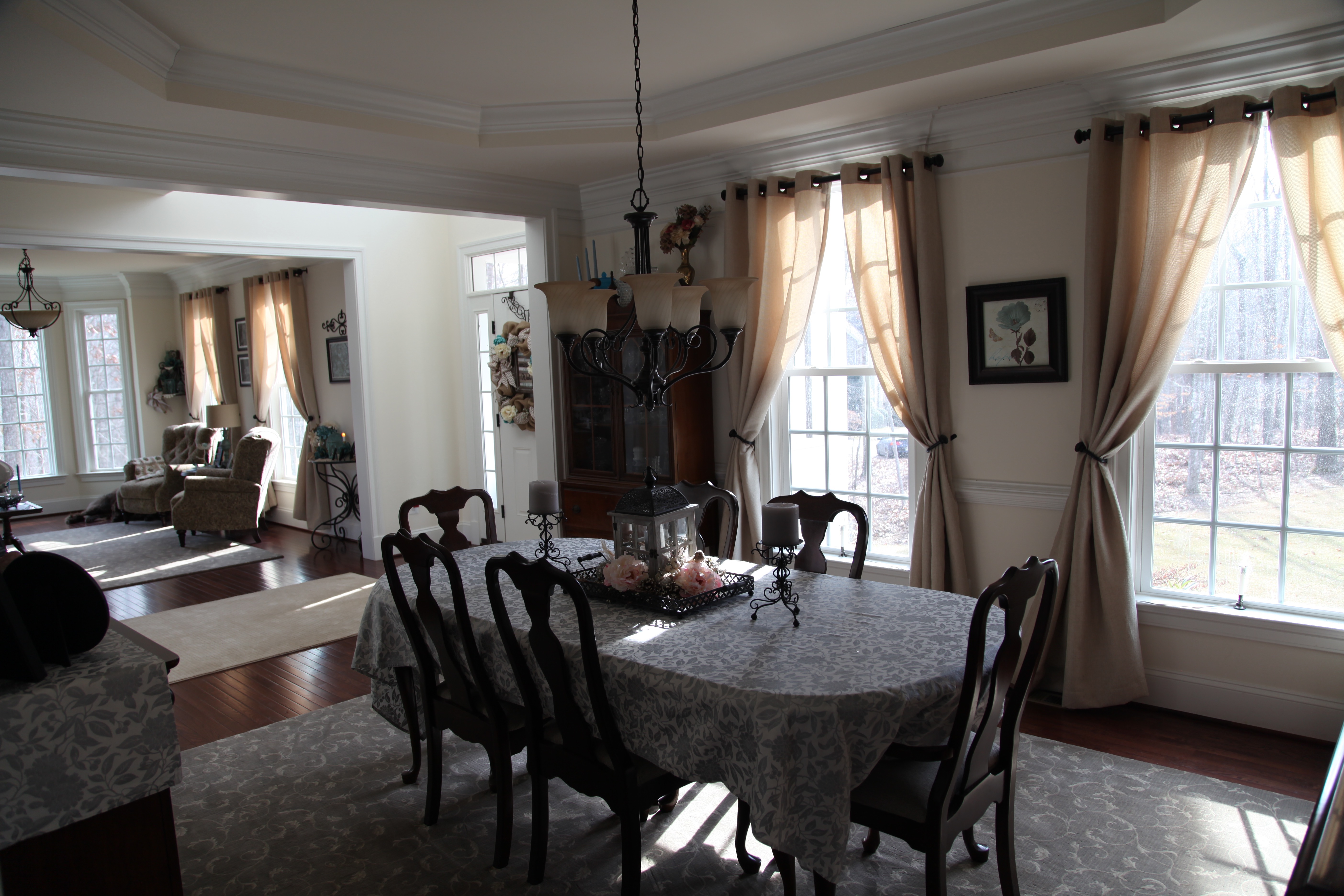 Both the living and dining rooms are pretty much the same size the only difference being that the dining room has a tray ceiling and the living room has a large bay window at one end. The dining room furniture is every bit of 25 years old and because it wasn’t used too much in our other home, it is still in great shape. We did purchase all new furniture for the living room before we moved into this house and when we did that, I ordered a bolt of the same material that the couch was made from so that we could reupholster the dining room chairs to match.