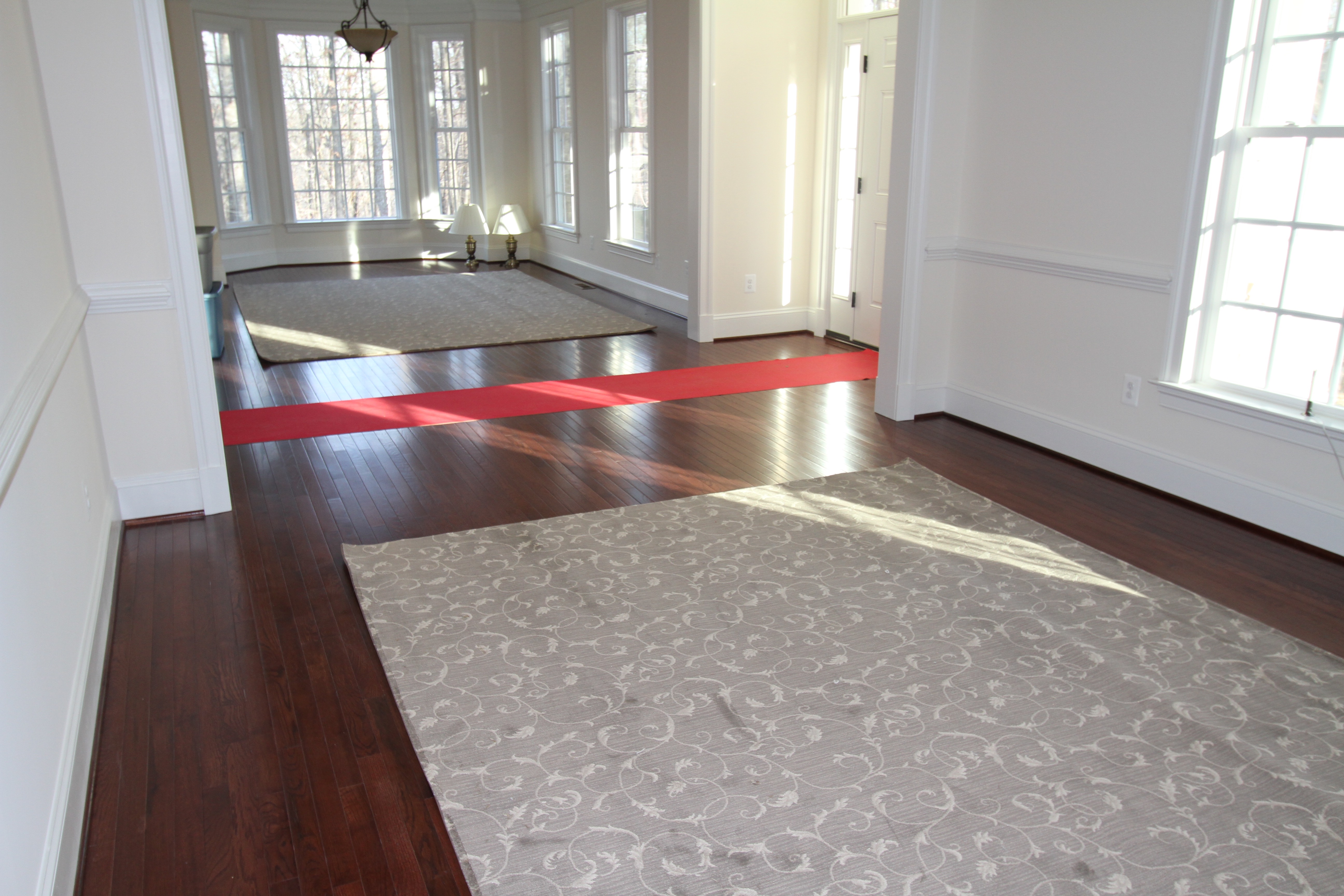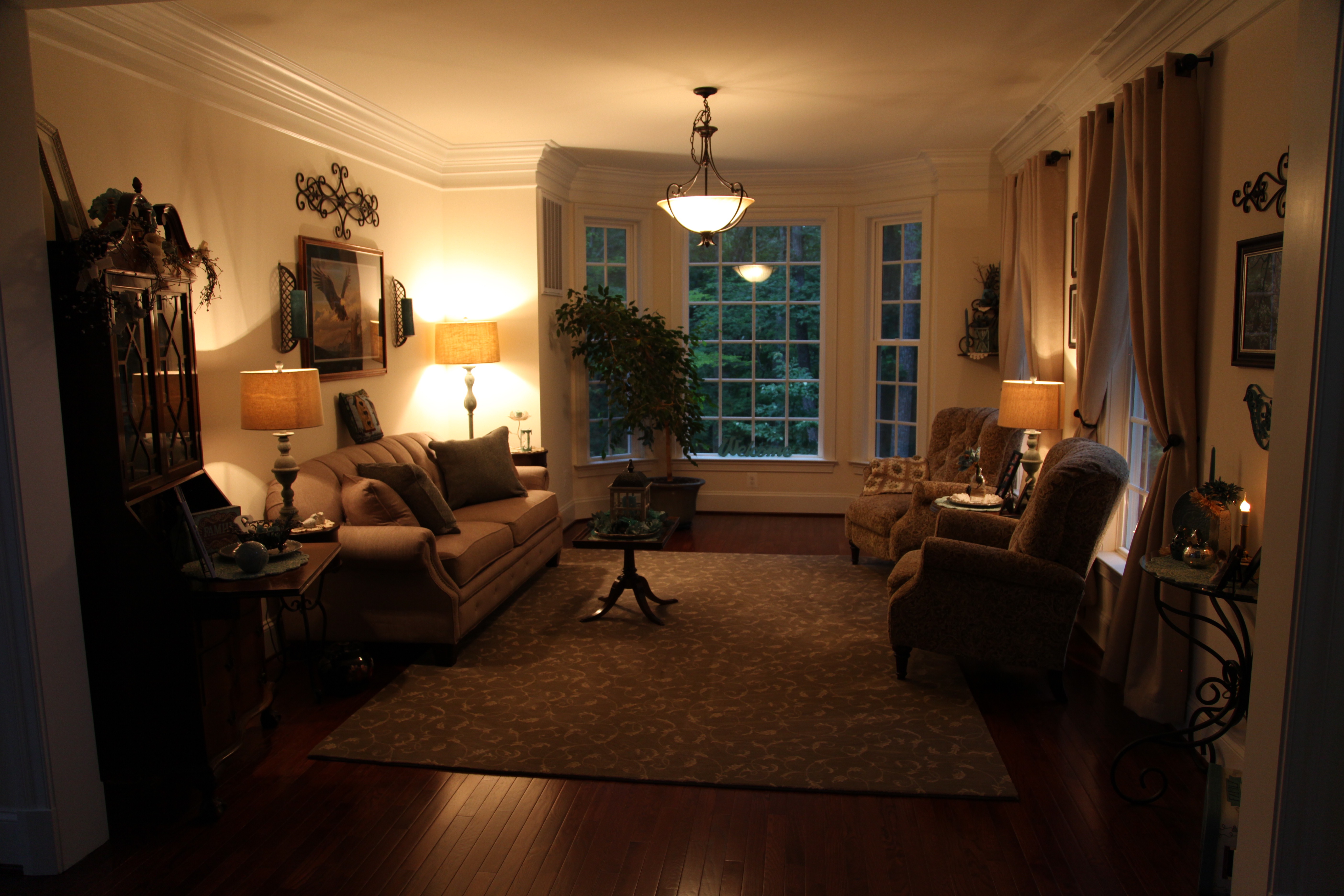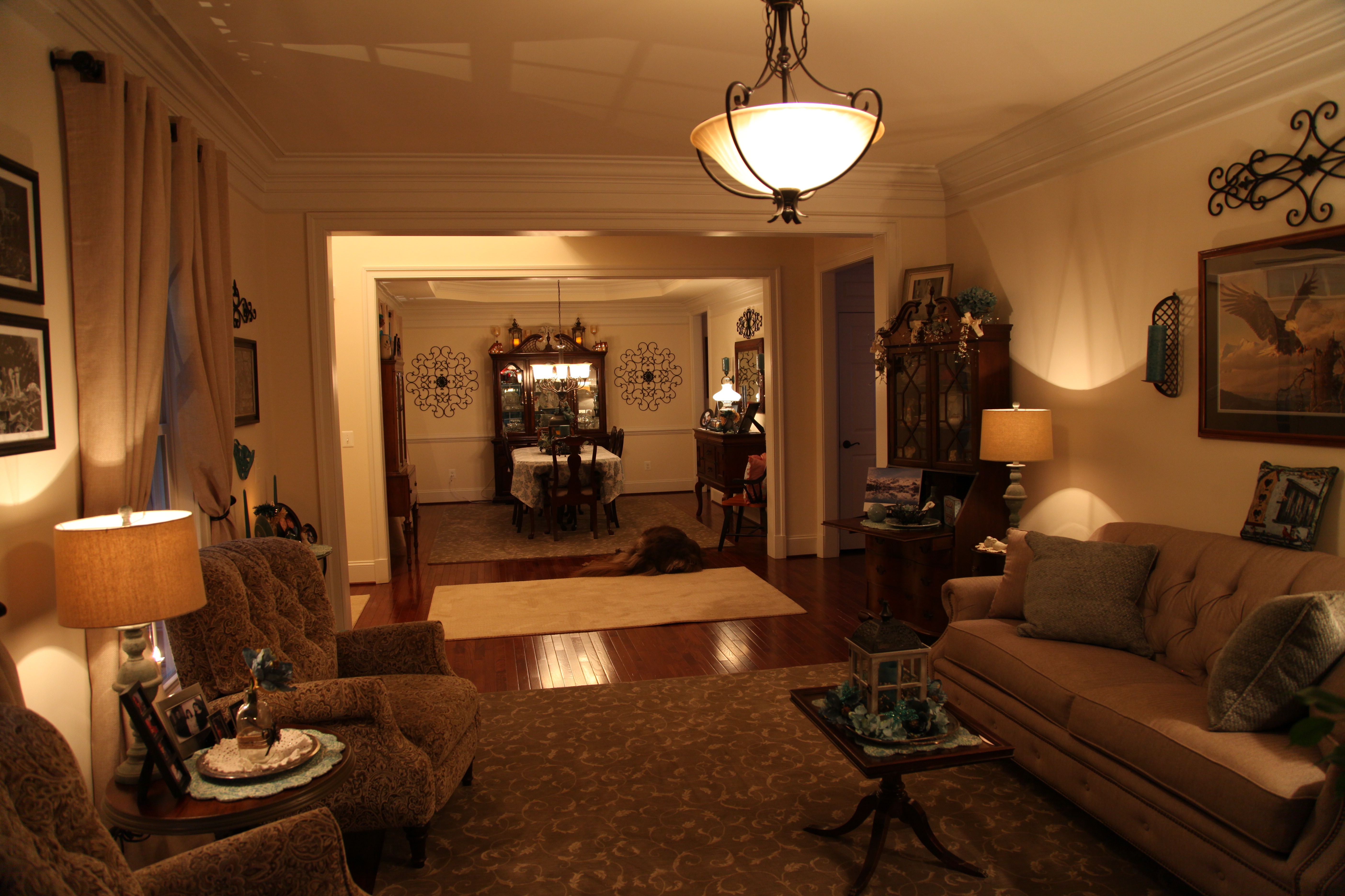 Both the living and dining rooms are pretty much the same size the only difference being that the dining room has a tray ceiling and the living room has a large bay window at one end. The dining room furniture is every bit of 25 years old and because it wasn’t used too much in our other home, it is still in great shape. We did purchase all new furniture for the living room before we moved into this house and when we did that, I ordered a bolt of the same material that the couch was made from so that we could reupholster the dining room chairs to match.