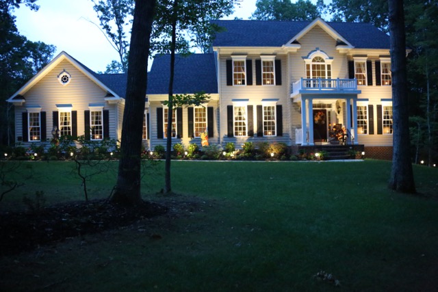 And here is the house from a distance. The lights stay lit in the windows all year long (we have a “Holiday Light Package” which allows us to flip one switch inside to control all of those window lights…nice little option for a girl who loves to have lights in her windows). 🙂 My hubby has done a great job of installing pathway lights, a few ‘up’ lights, and wash lights to light up the front of the house in the evenings. He has all of those lights on a timer and they go on at dusk and off 6 hours later. Here is a link to how the hubby and I created our “Special Outdoor Lighting”.