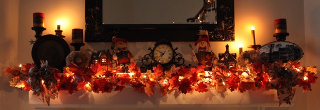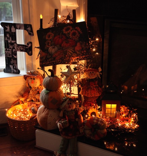 I always start my change of Season decor with the fireplace hearth and mantel. Just to let you know too, before I change my decor out, I spend a day packing away a good bit of the existing decor so that I can start with a clean slate. Of course there are some things that I leave in place and build upon, for instance regarding the mantel and fireplace, I keep the candle holders and clock on the mantel and the ladders/pip berries/white lights and country crock on the hearth…those items stay in place all year round and I just decorate on and around them. I have also placed baskets and a couple of other items on either side of the fireplace, they too stay in place and I use them as a base with which to build my Seasonal (or generic-depending on the time of year) decor.
