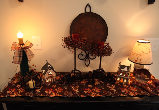 This is a centerpiece that sits on a credenza in the family room. I use the basic rod-iron fleur-de-lis candle holder throughout the year. For this look I added a rod-iron tray and used pip berries as a candle ring of sorts, added some pine cones, larger berries, a wooden pumpkin and called it done.