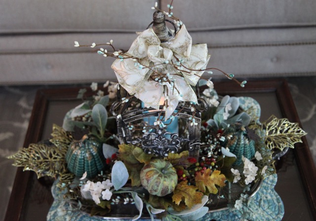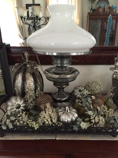 This lamp was my grandmother’s and then my mom’s and now it is mine. It is a very special piece to me, so I always want to do it justice when incorporating it into my decor. It sits on my dining room’s sideboard table and this is how I pulled that green color into the surrounding decor. I used a tray to hold the lamp and the arrangement. I utilized some silver toned pumpkins, berries, and a few flowers: