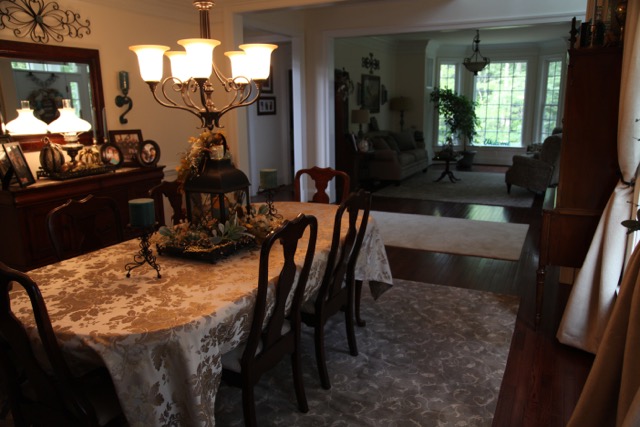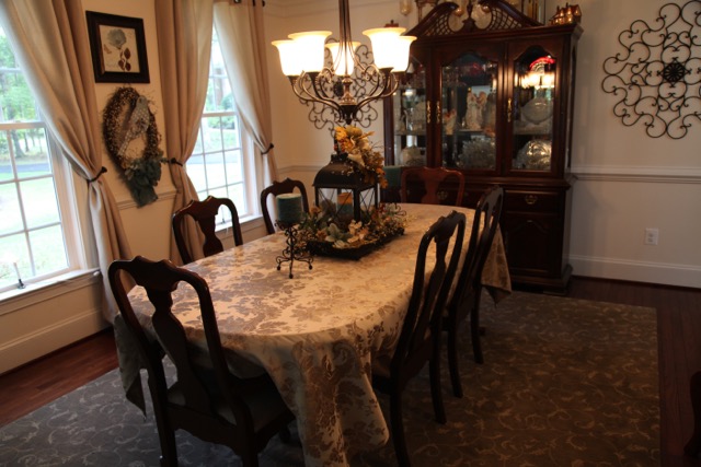 All of the previous decorations are located in the family room, kitchen, kitchen eating area, and powder room, those rooms are located on the back of our home. We also have a living and dining room that are on the front of our home (separated by the staircase). I decided to challenge myself this year. Throughout the year I use a pretty green color as my accent color in those rooms so I wanted to try to incorporate that color into my Fall decor as well. Plus I wanted it to look a bit more polished (if that makes sense) in those rooms…more formal might be a better way to put that. 🙂 So here is what I came up with: