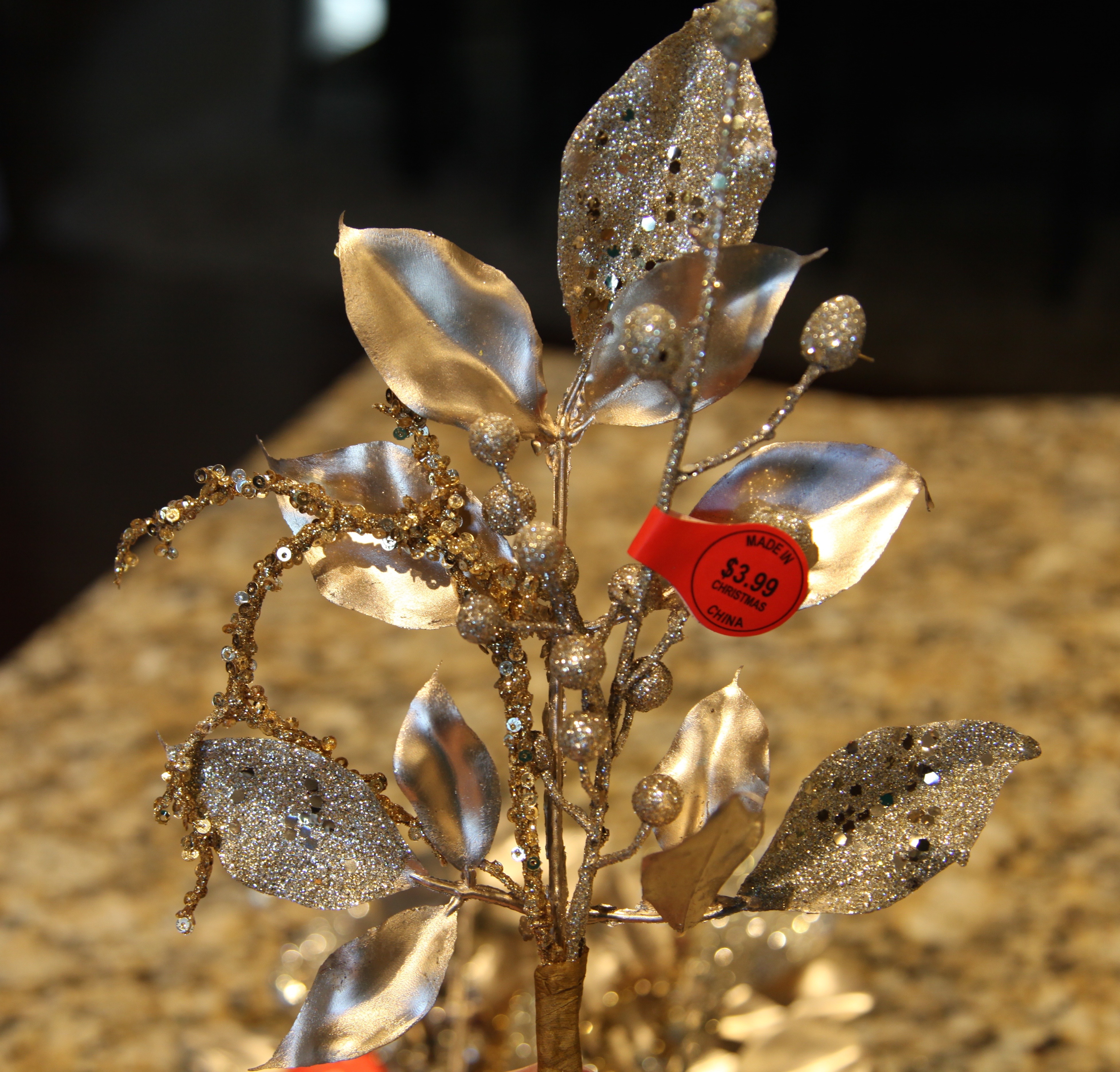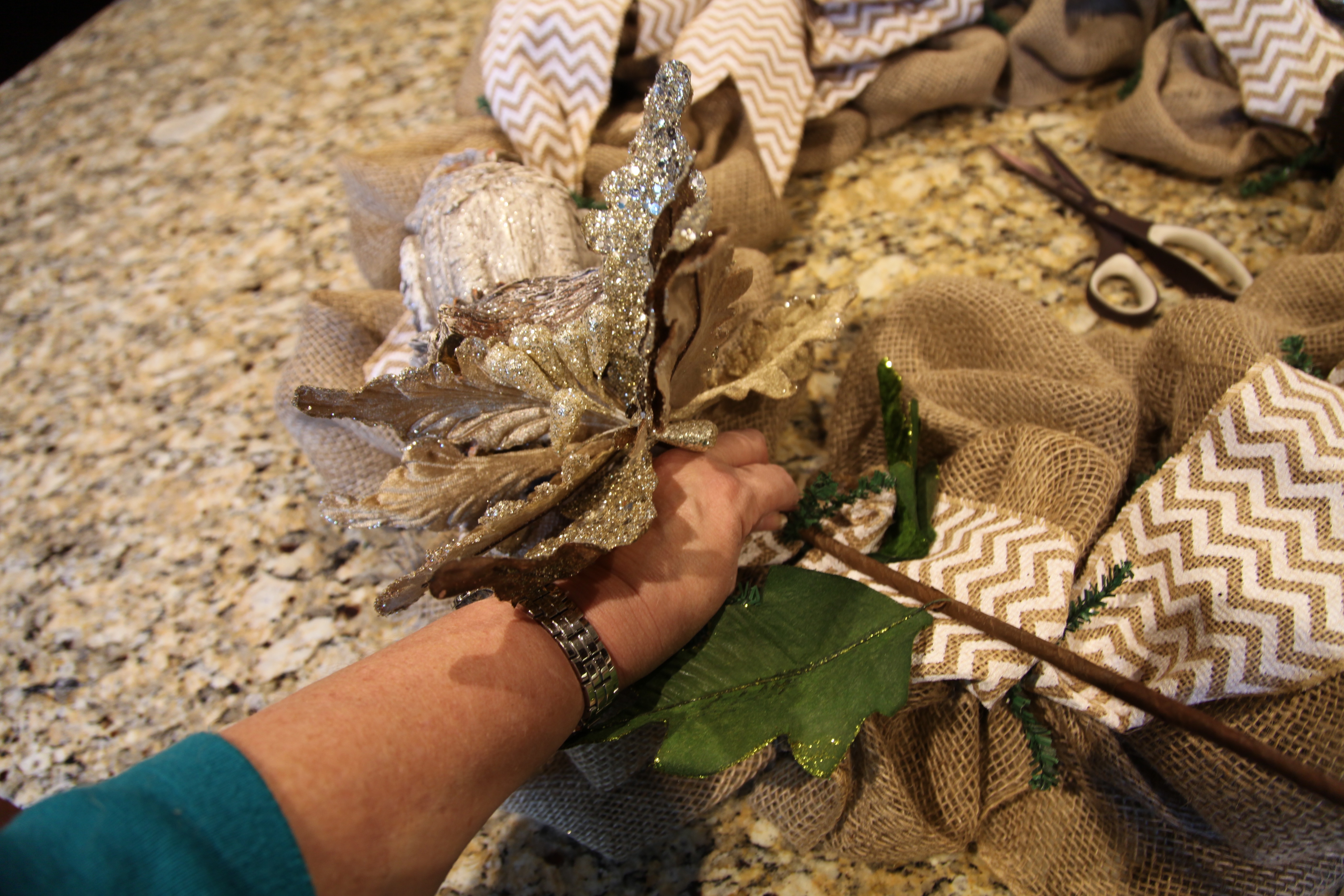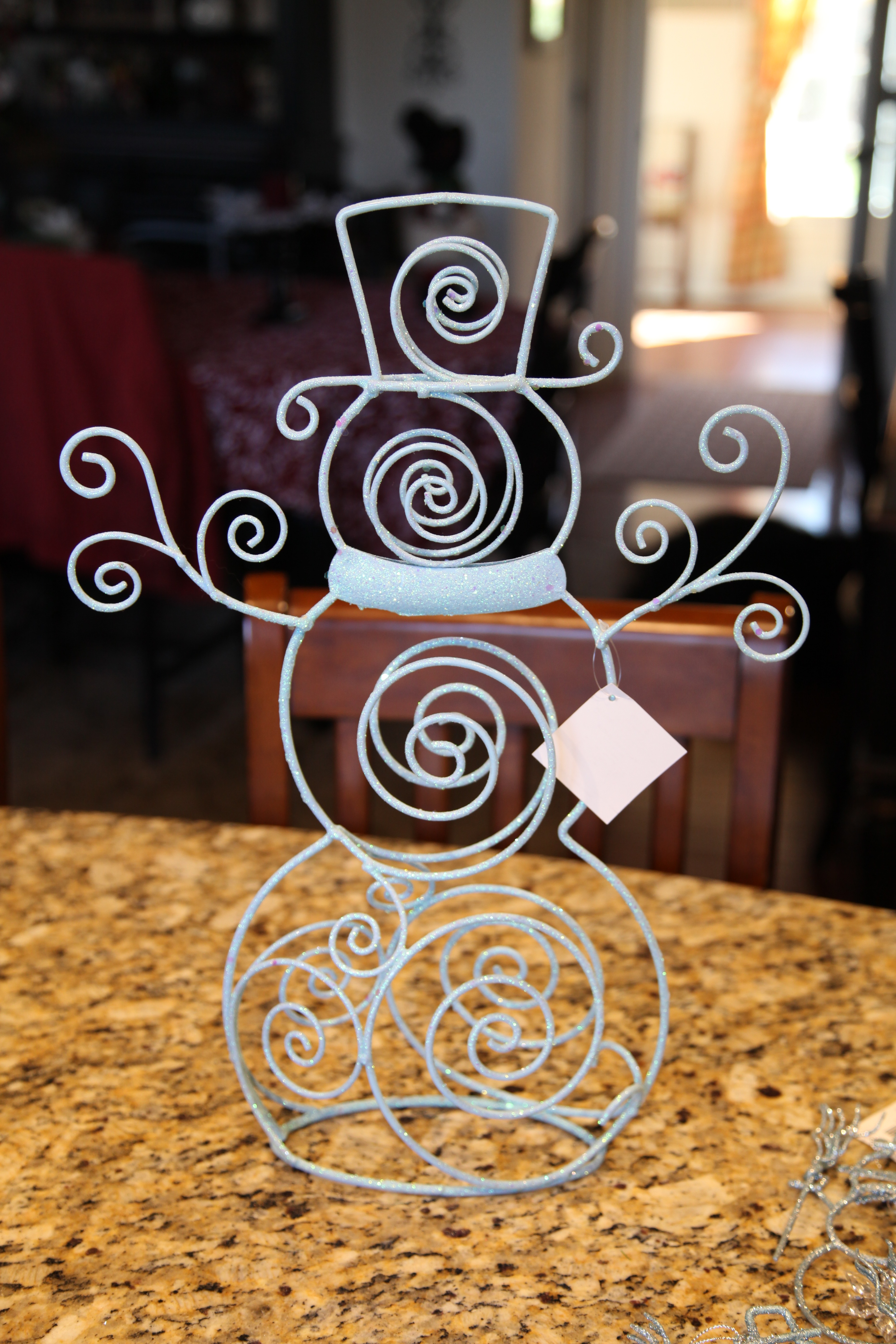 It is a very, very special lamp so I wanted to do it justice. Unfortunately, I was concentrating so hard on making this arrangement that I neglected to take pictures of how I created it. It wasn’t hard though, all it really is are a couple of white flocked pine picks, a few white and silver pinecone ornaments, and a few sparkly white and silver poinsettias. OH, I did add a battery operated mini light set (with a timer)…