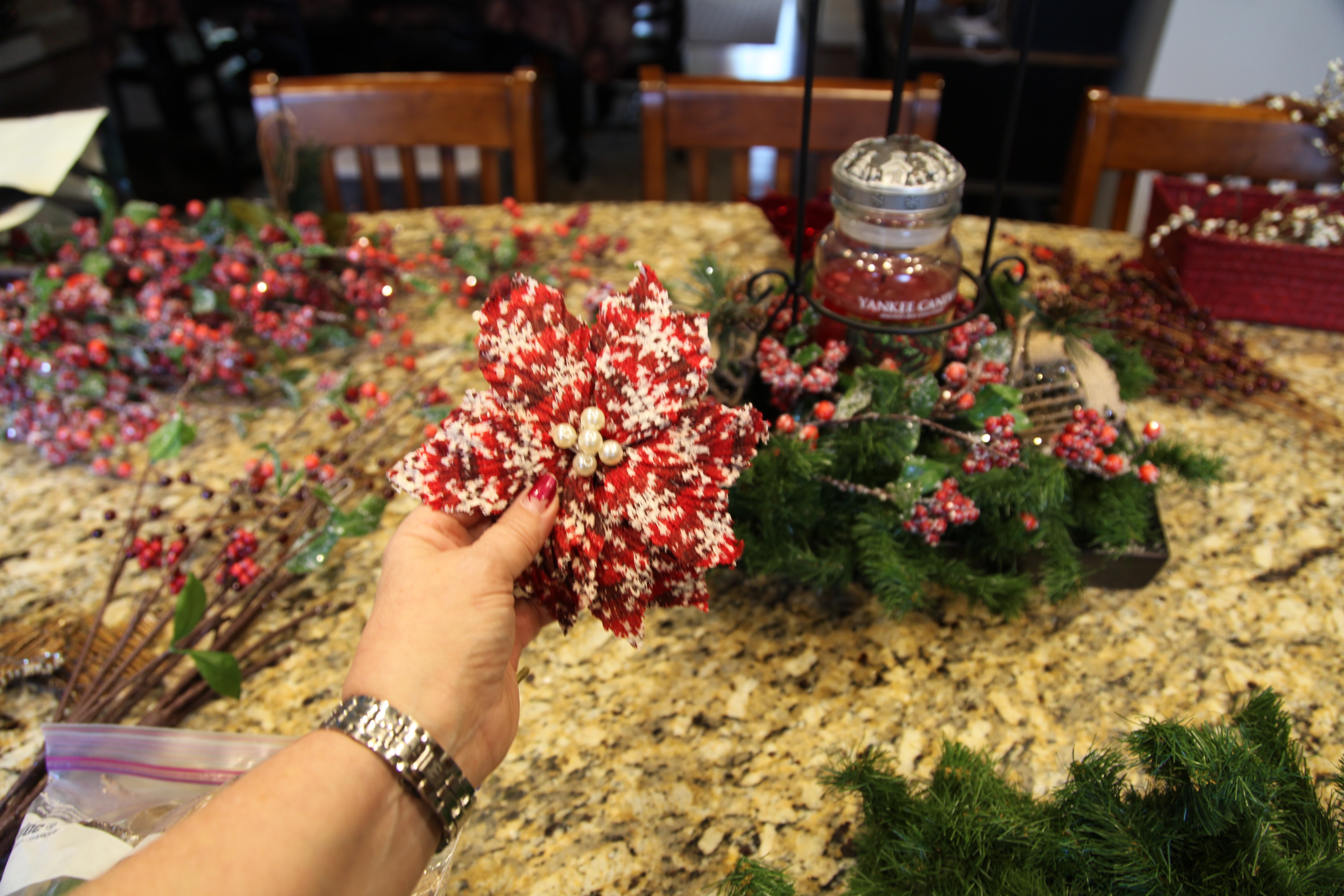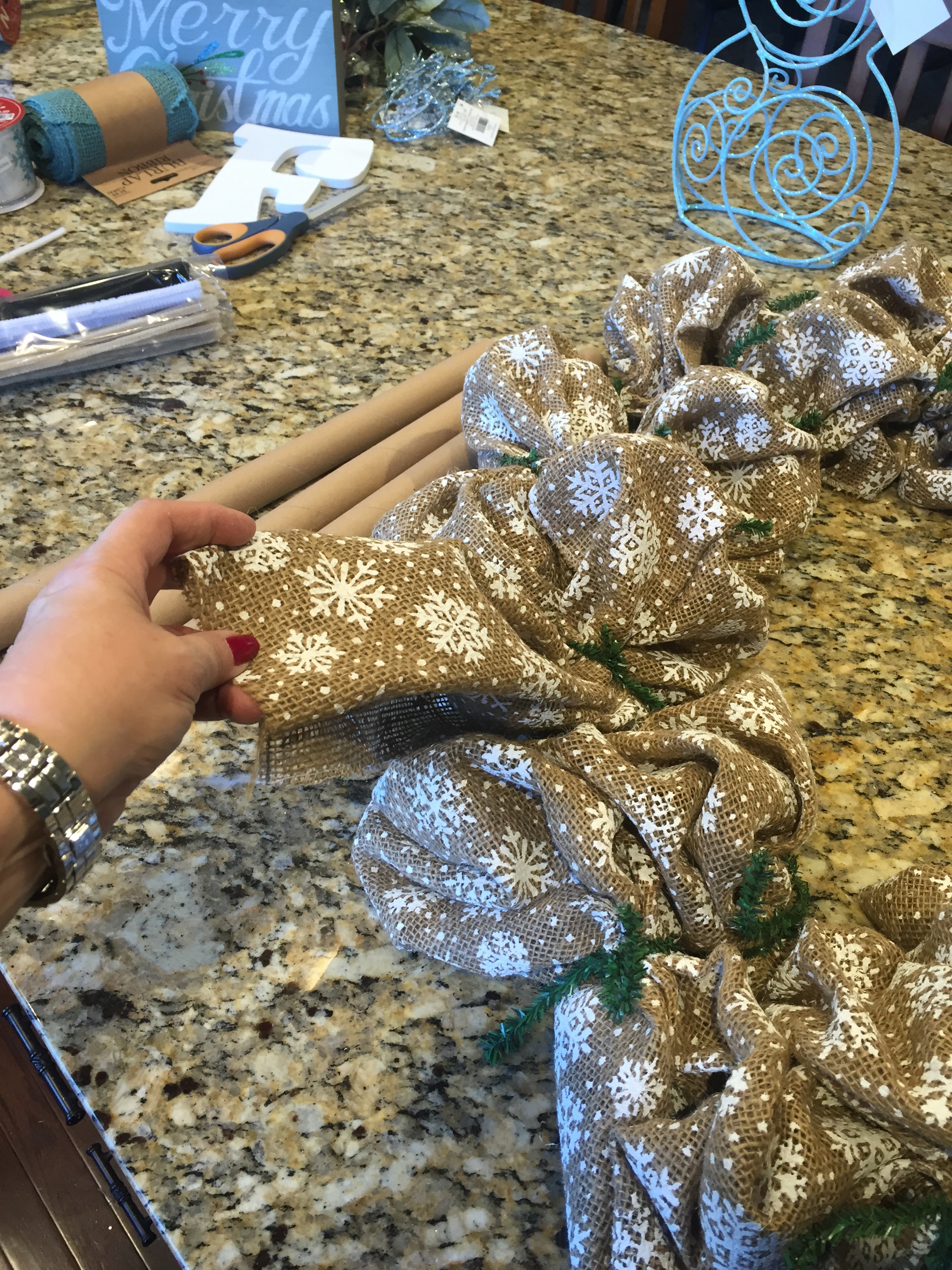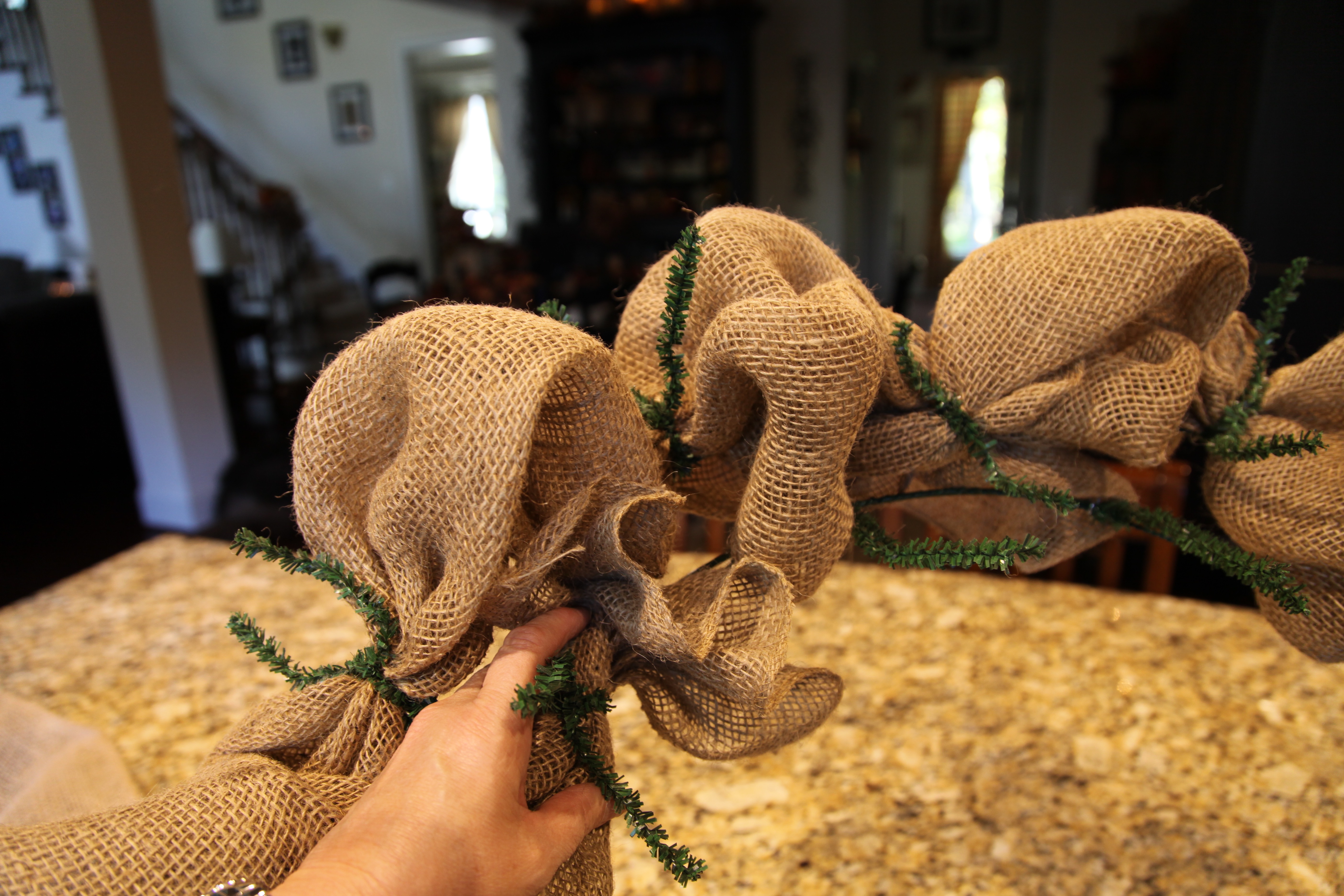 I made all of those bows, and then I made a swag our of pip berry picks and gerber daisies to attach to the bullnose…