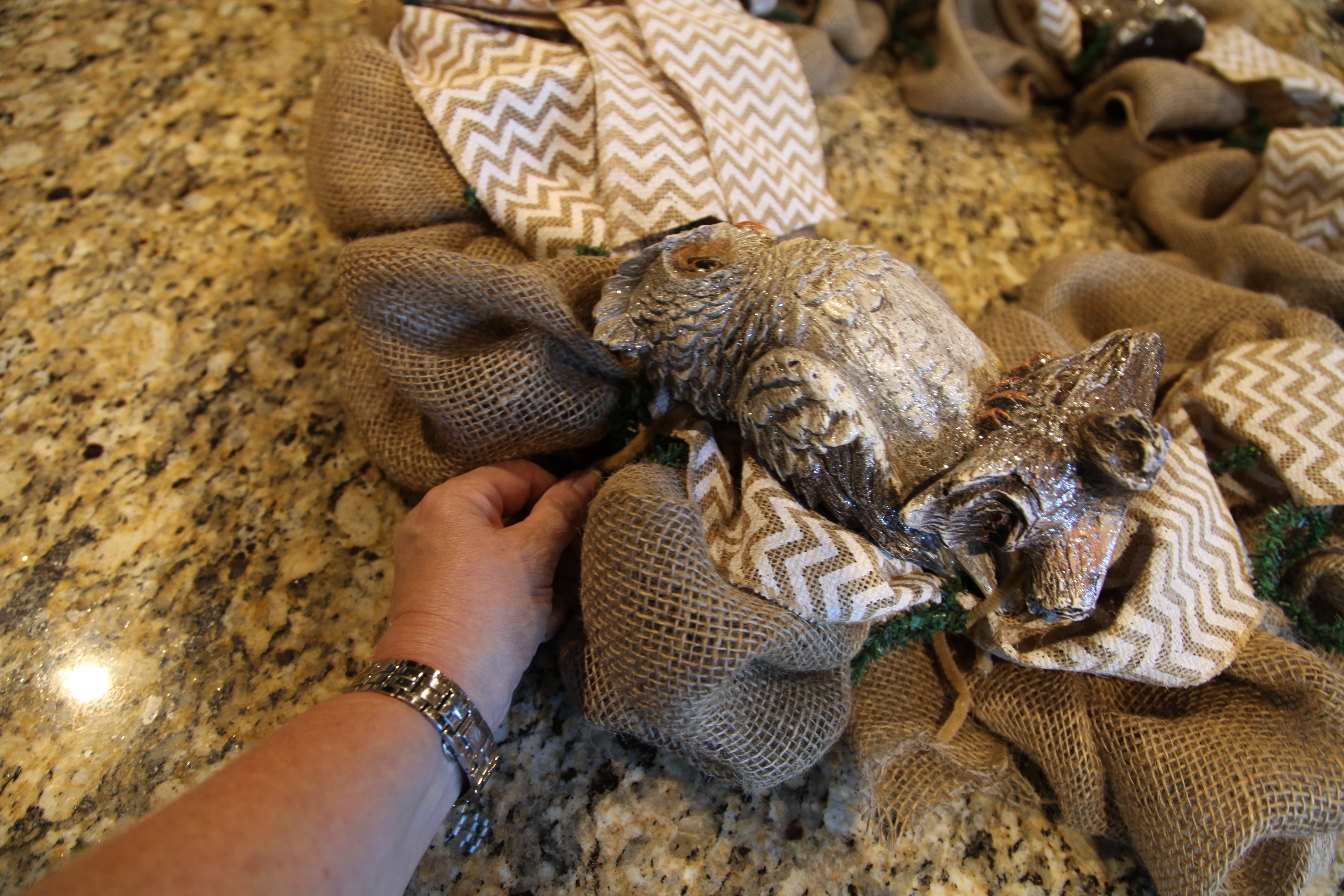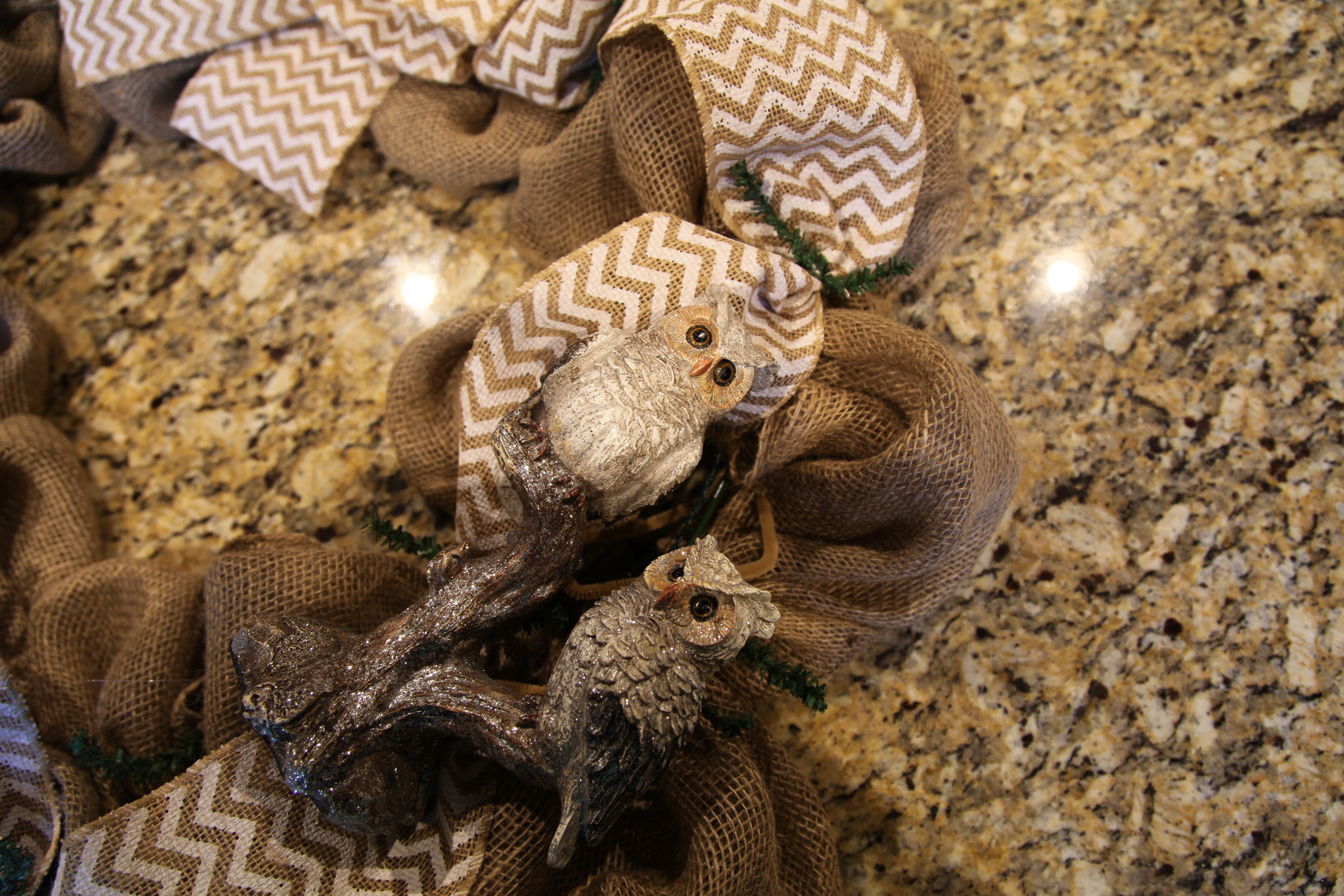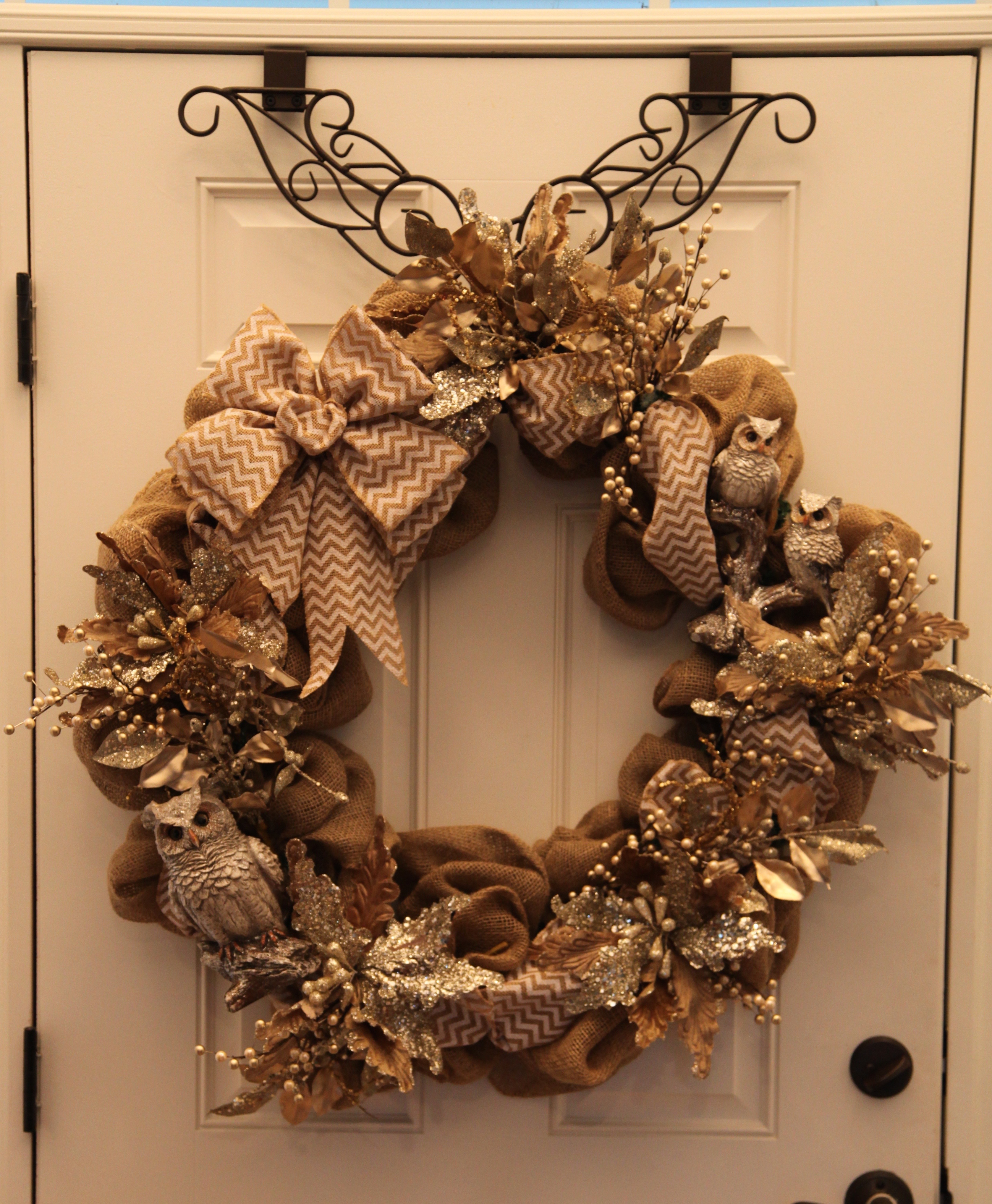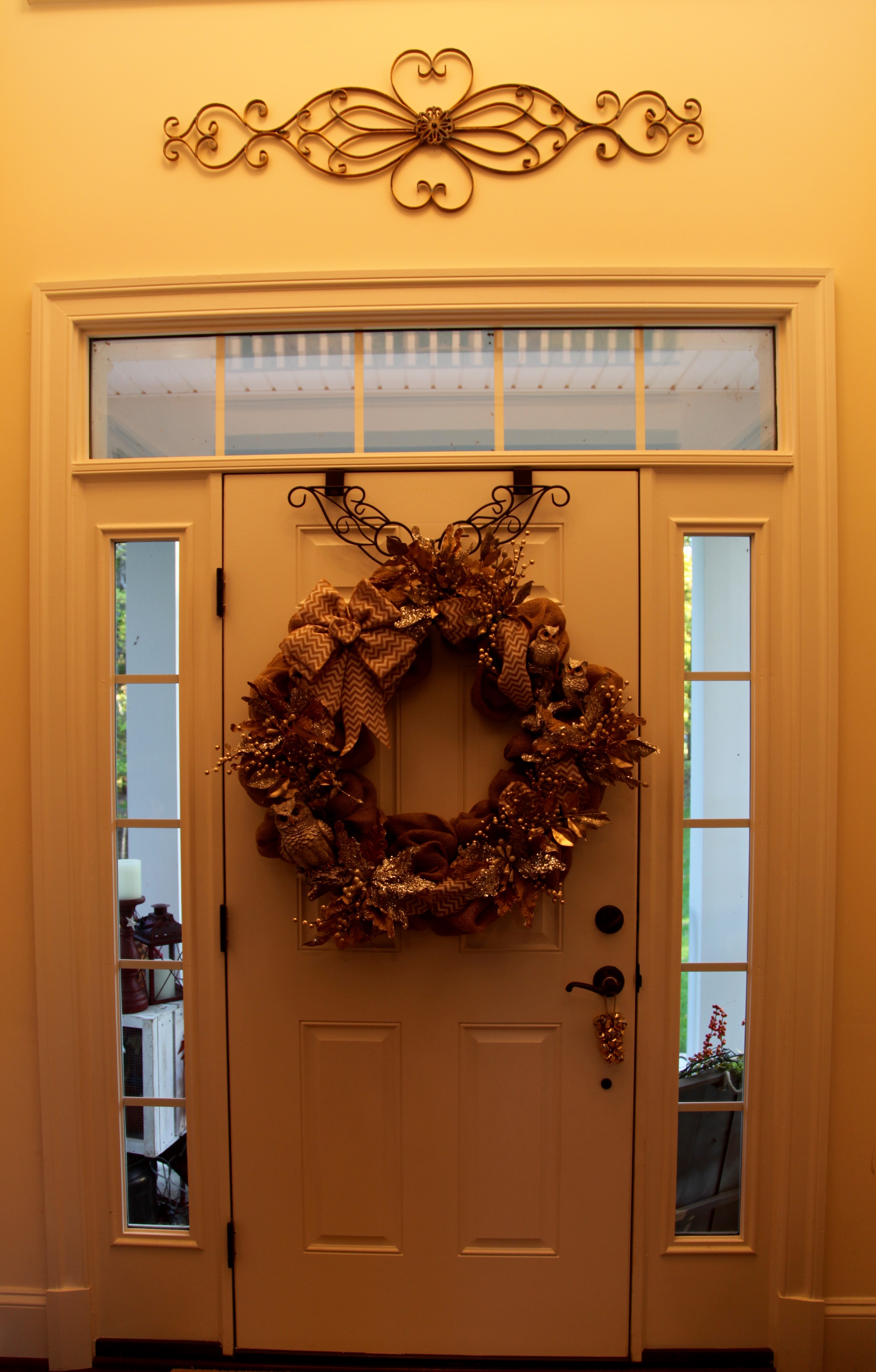 Here is the Powder room, I have tried to decorate it in much the same way as I did the kitchen and family room areas as it is close by. I just made this wreath right after Christmas, I tried to pull in all elements of my decor, i.e. gerber daisies, rod-iron (owls), pip berries (I used a pip berry garland)…OH goodness, why don’t I just give you a link, here is how I made that Burlap, Pip Berry, & Rod-Iron Wreath. 🙂