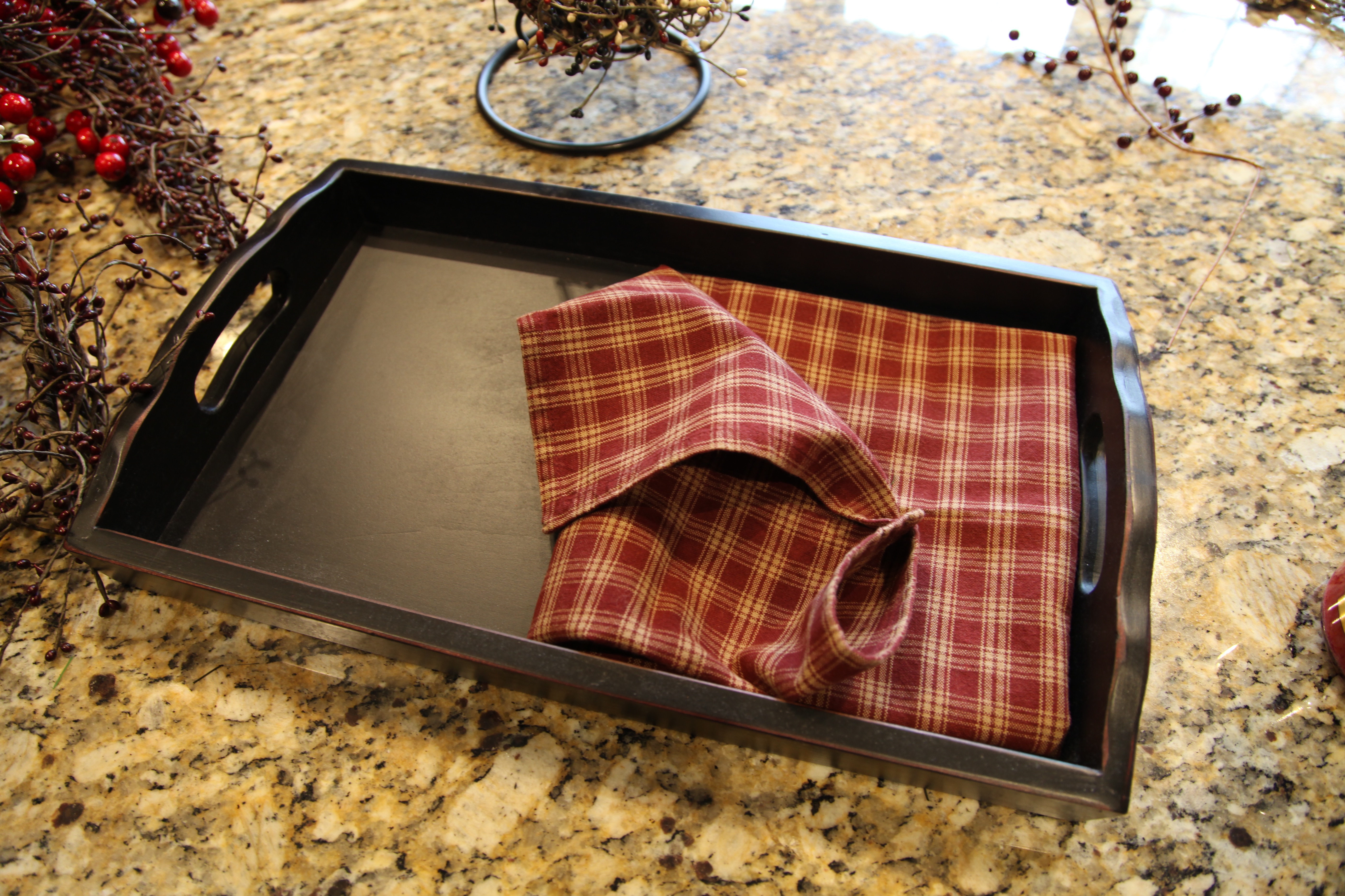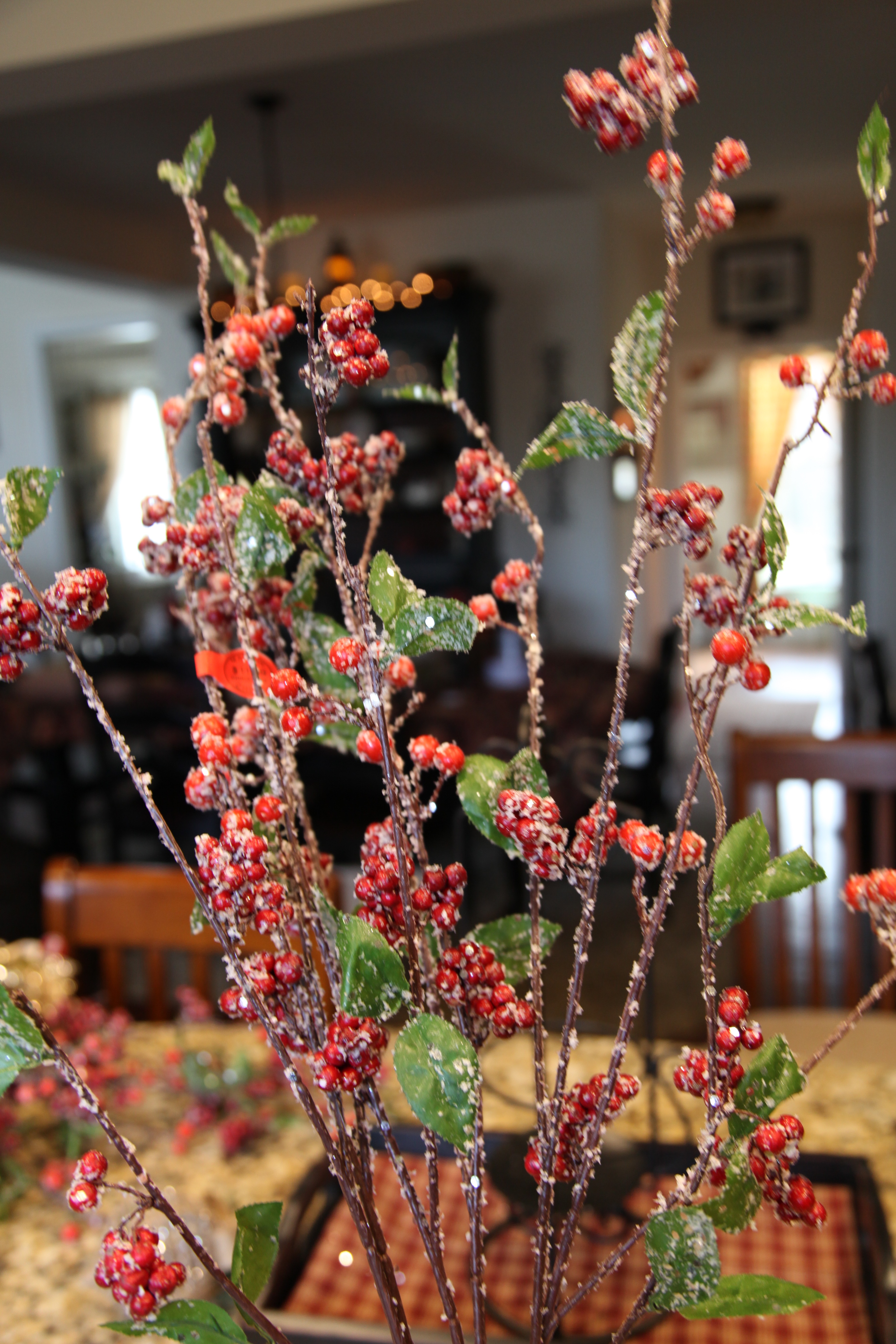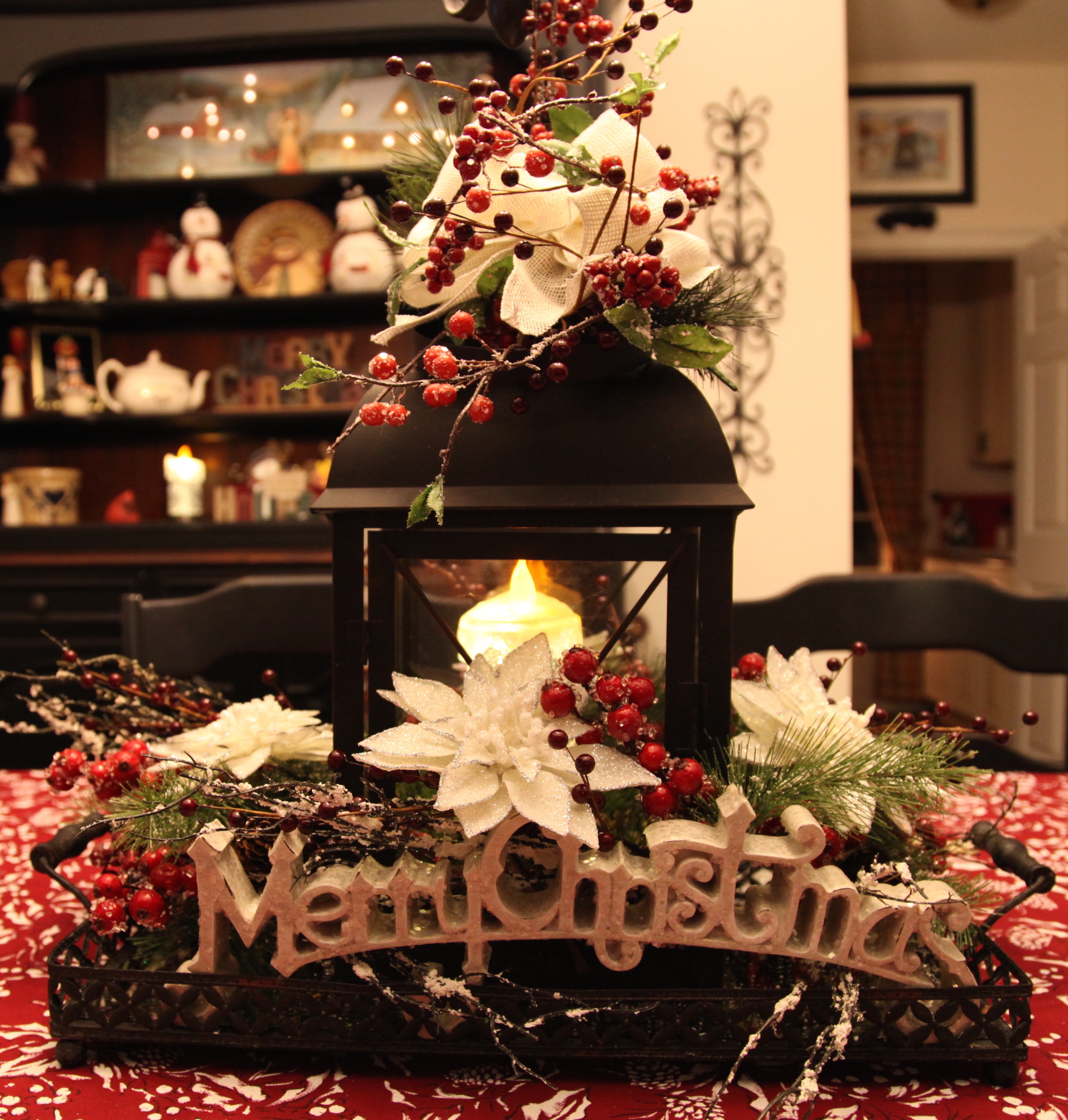 The fireplace is another focal point; I typically decorate the mantel and hearth. I have utilized, a pip berry garland, dickens houses, willow tree figurines, wooden plates, and a few other accent pieces to pull it all together.
