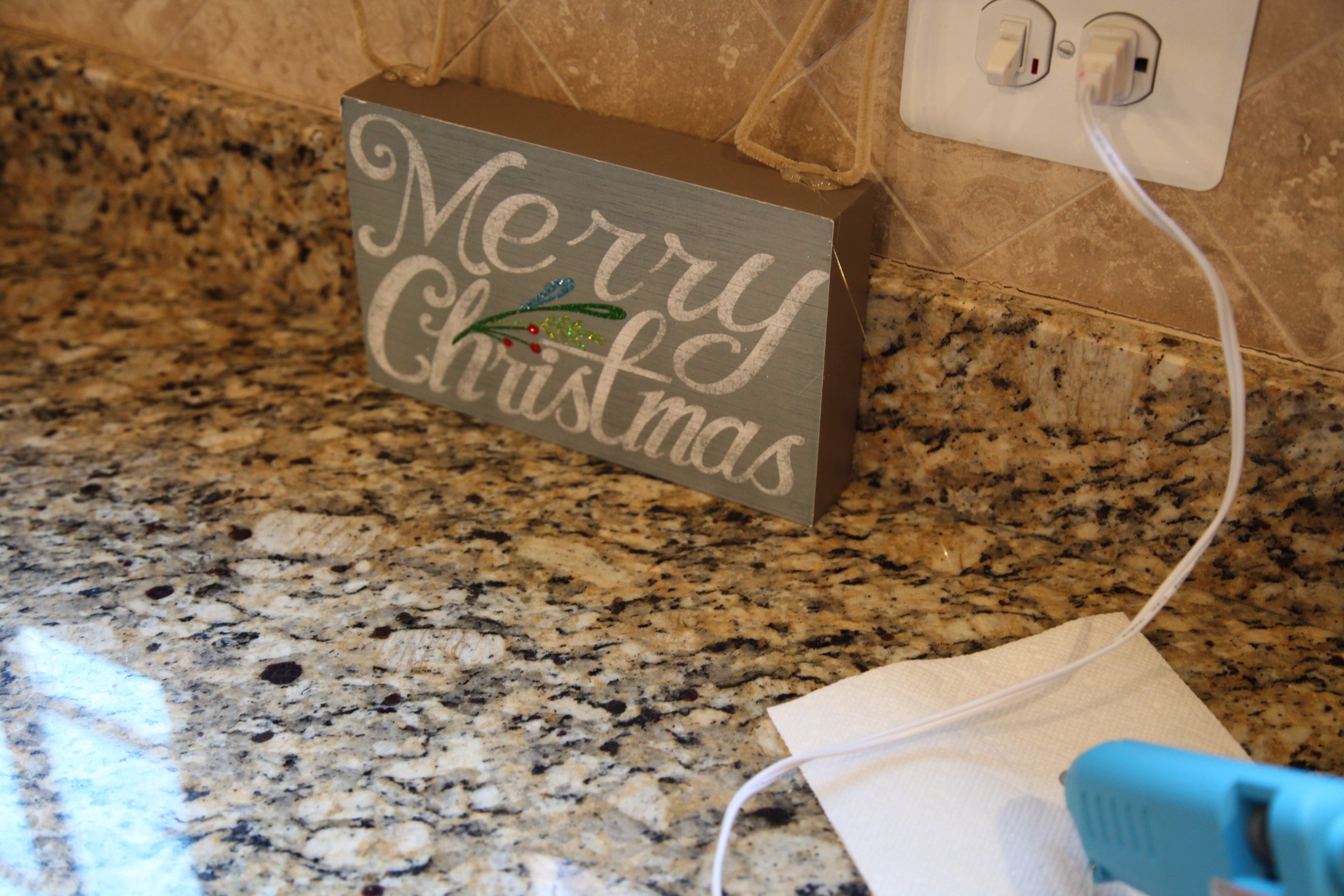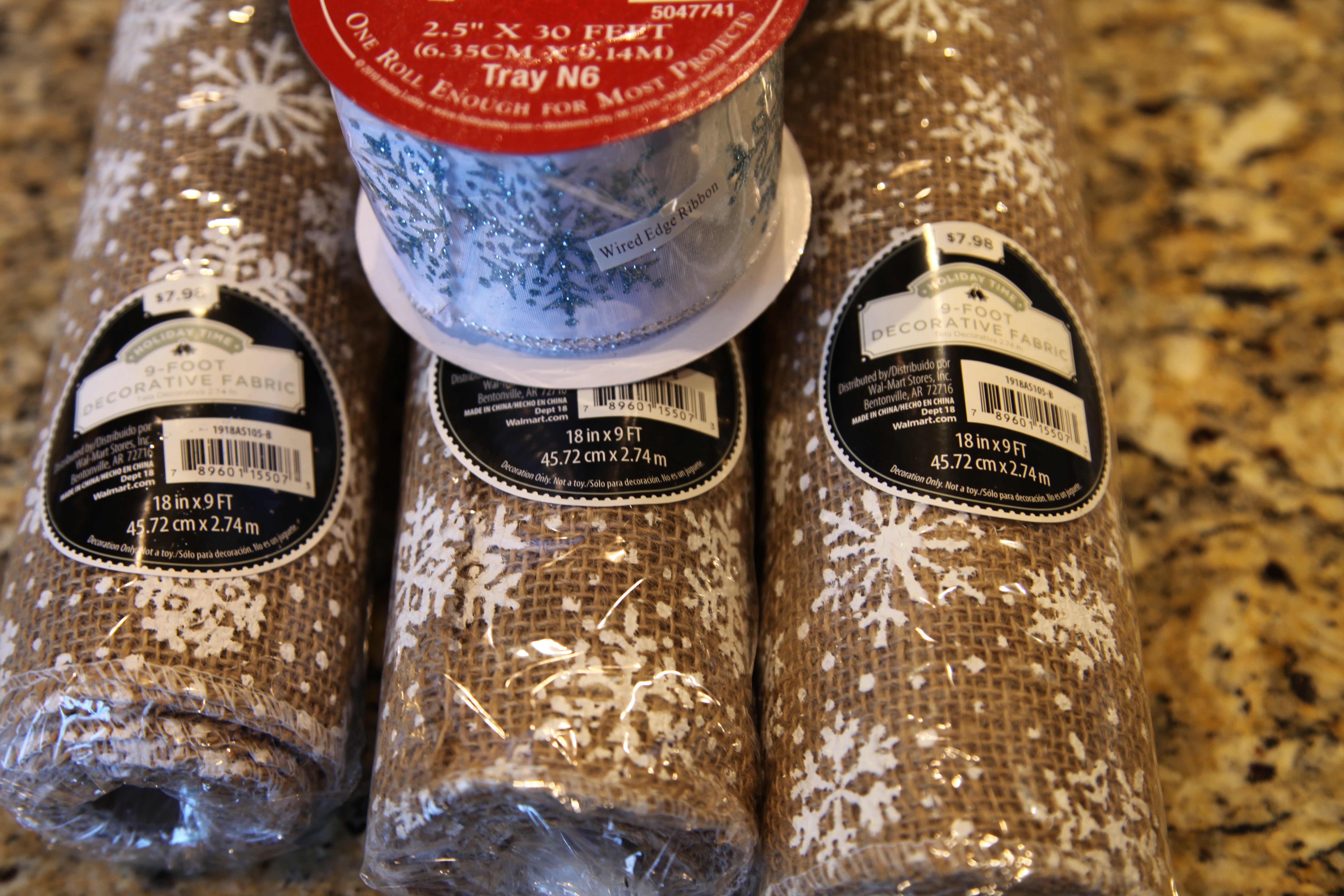 I decided to make new bows out of that plaid and use the same ribbon to tie around the snowmen’s necks…I hung them on either side of our “Newfie” gate (where silhouettes of our pups are located)… I also tied ribbon around the Newfs necks. 😉