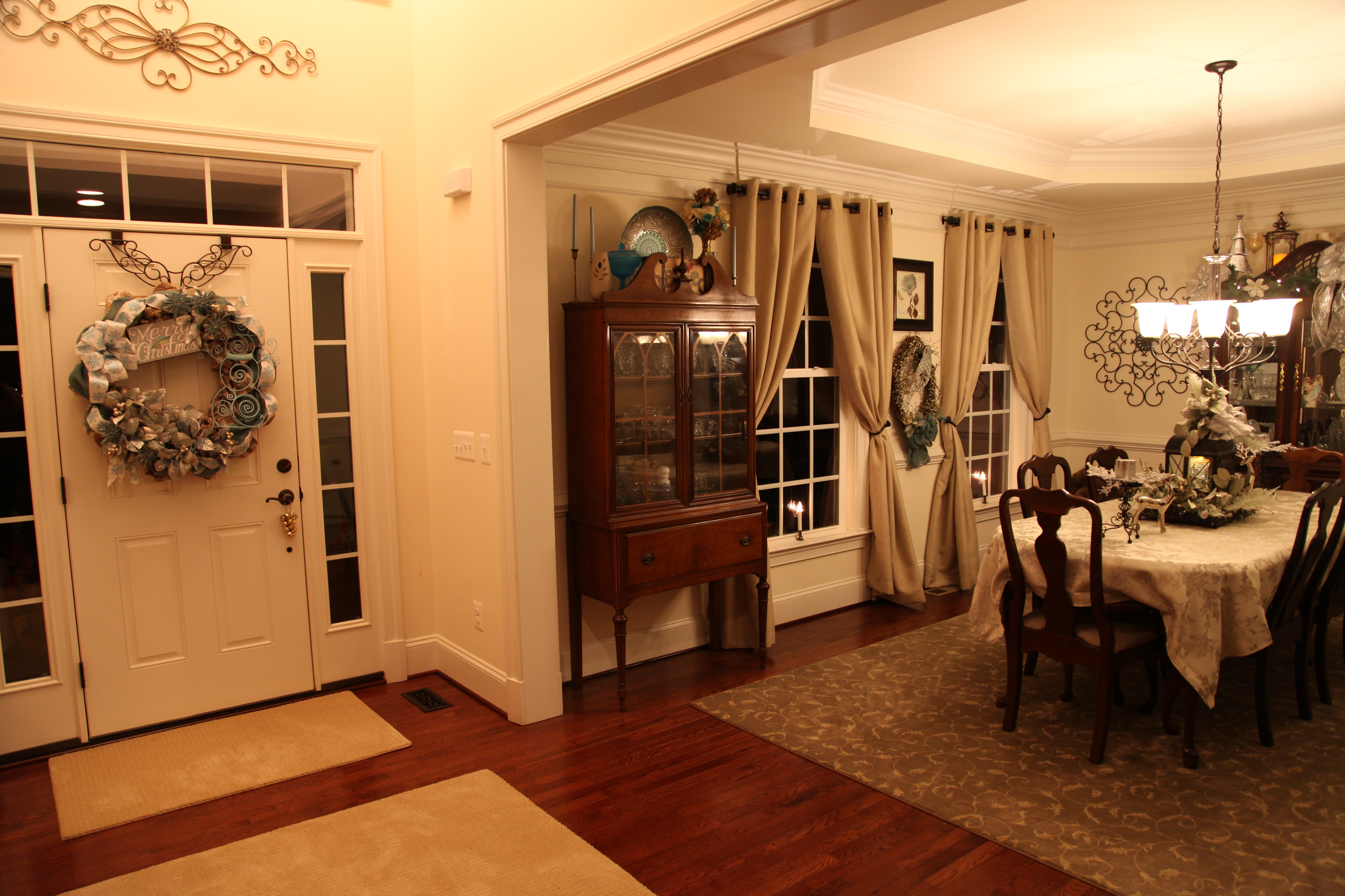 That was rather an eclectic little list I had going, but, as you’ll see, my “theme” became all of those things rolled into one cohesive design that has worked out beautifully in this home. I will highlight the back part of our home in this entry where I’ve used burgundy, khaki, & cream as my major color scheme. The staircase separates the family room/kitchen/eating area from the living and dining rooms that sit on the front of our home. I’ll do a separate post describing those rooms at another time; I use khakis and creams in there as well, but my main accent color in those rooms is a soft green.