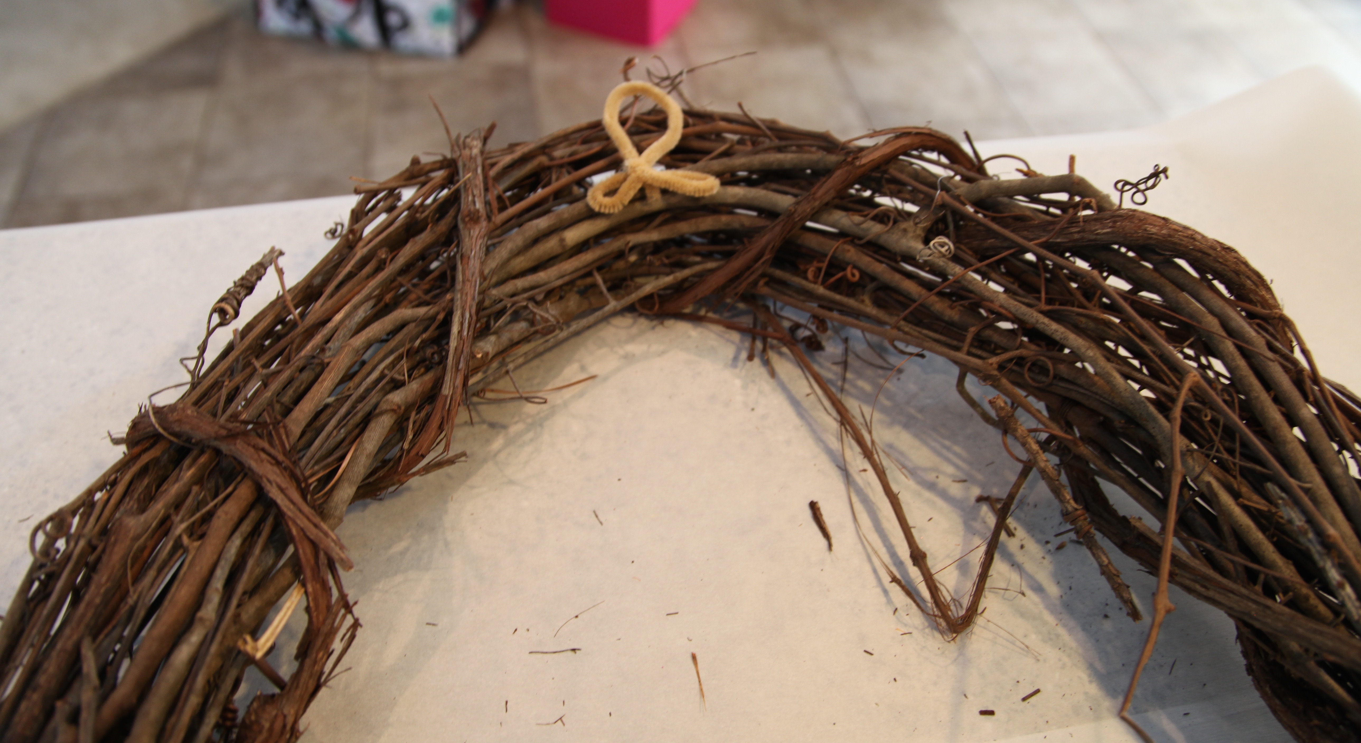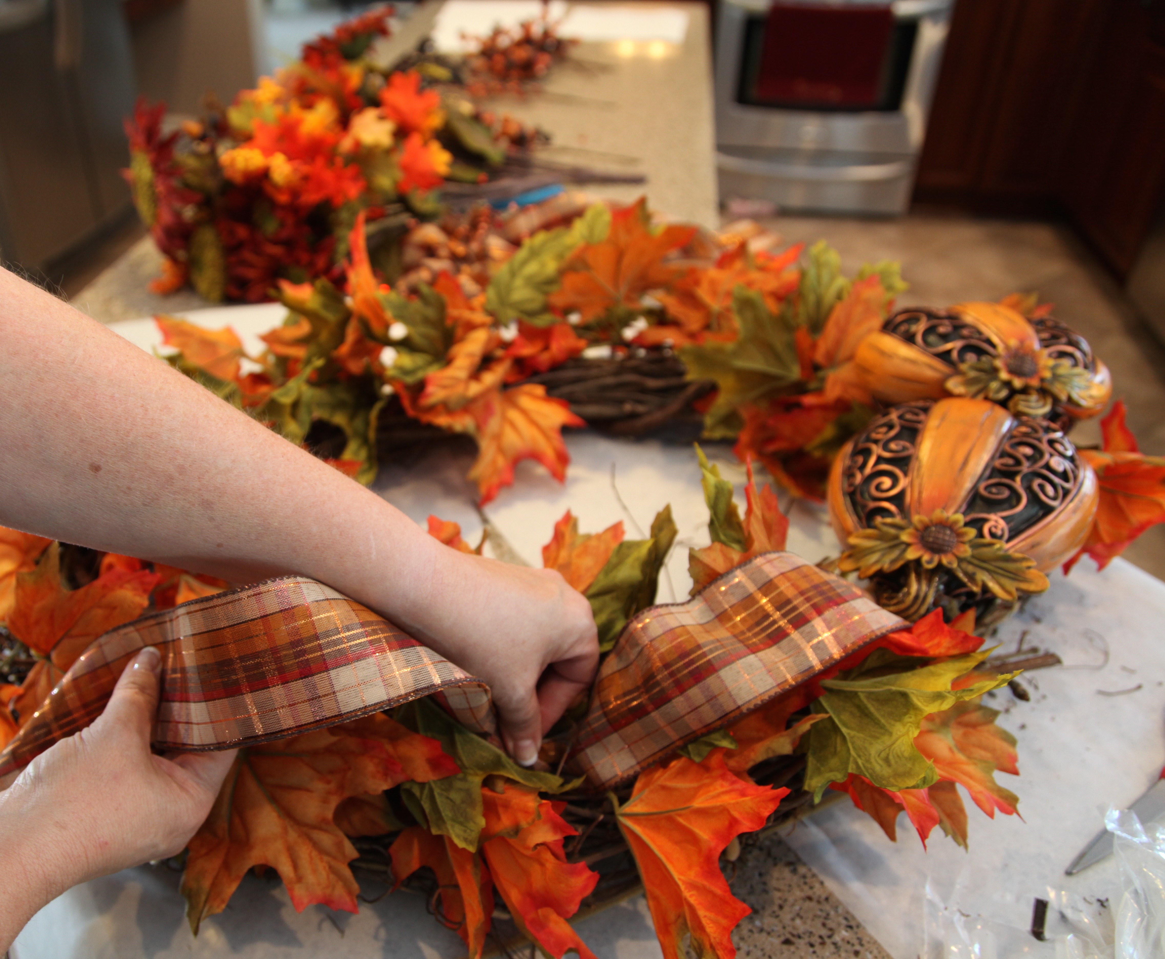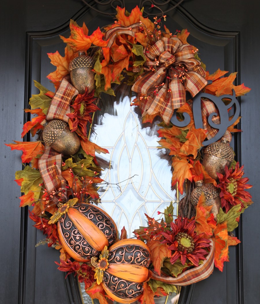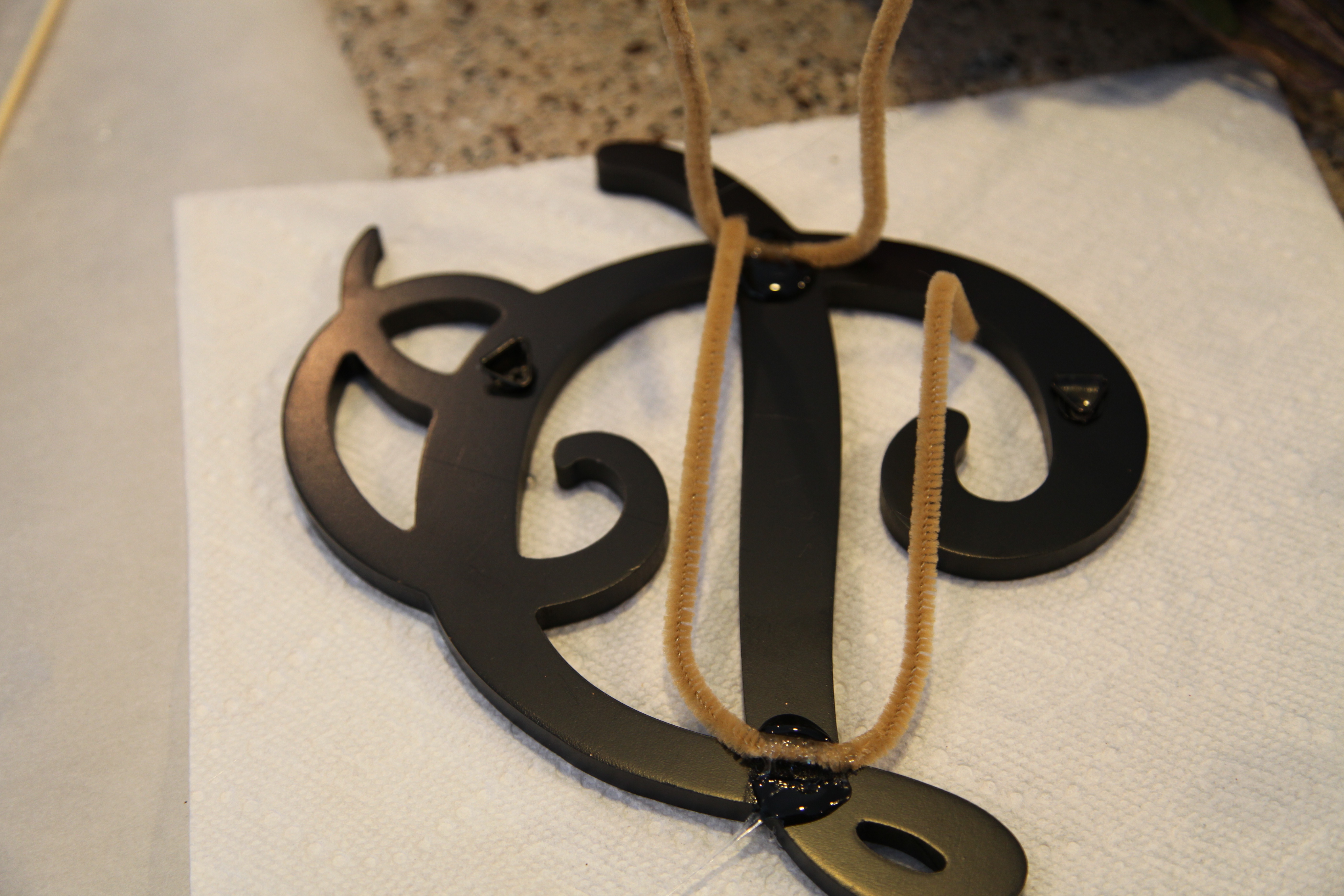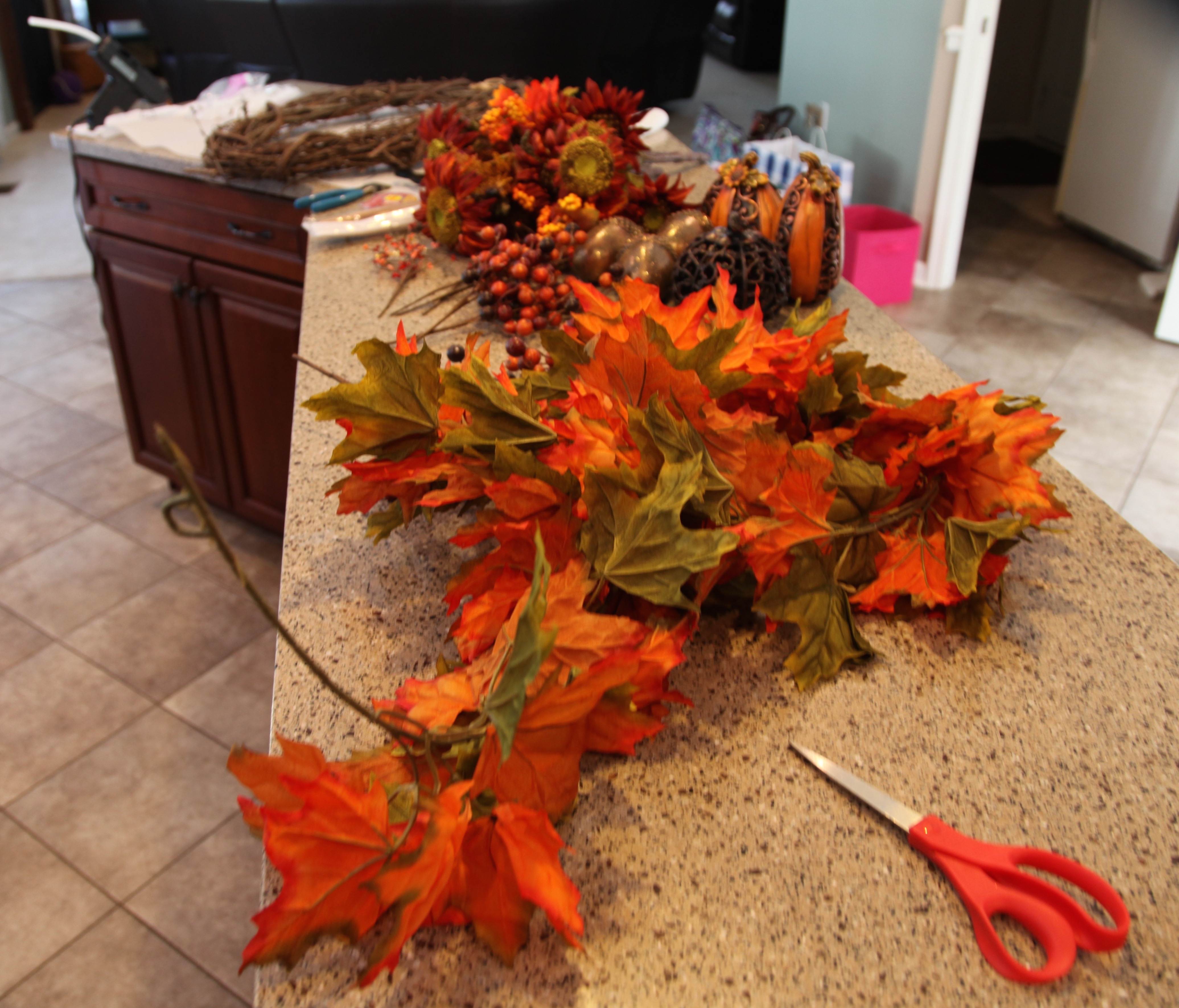 While the glue was drying on the wreath and garland, I took the opportunity to glue pipe cleaners to the backs of those pumpkins, they were pretty heavy and I knew that hot glue–even my industrial strength glue wasn’t going to hold them in place on the wreath.