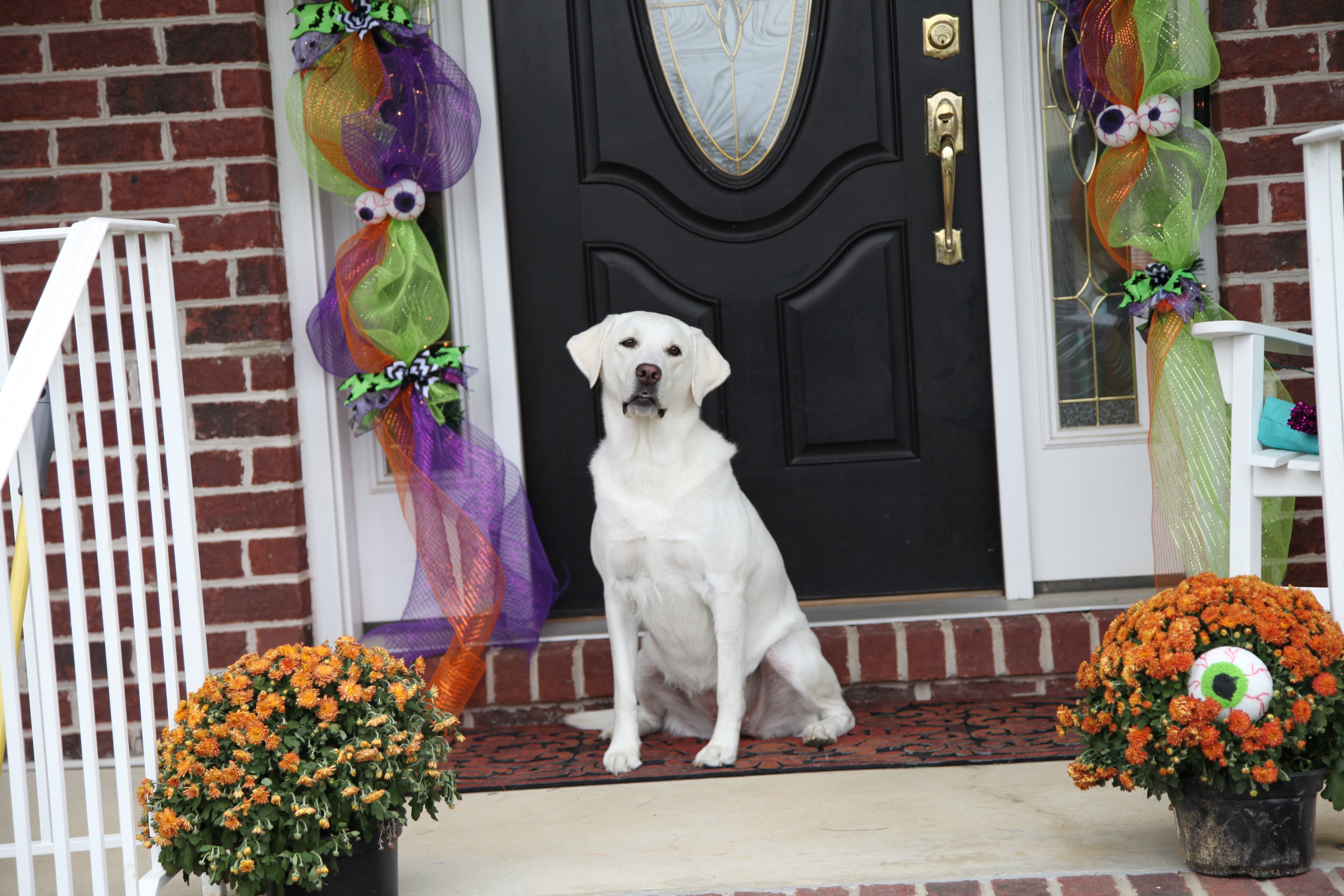 So, the hard part was done, now it was just a matter of changing out the decorative flags in the flower bed, switching out my gazing ball for a red one, adding a nice pine wreath to the light post & wagon wheels…