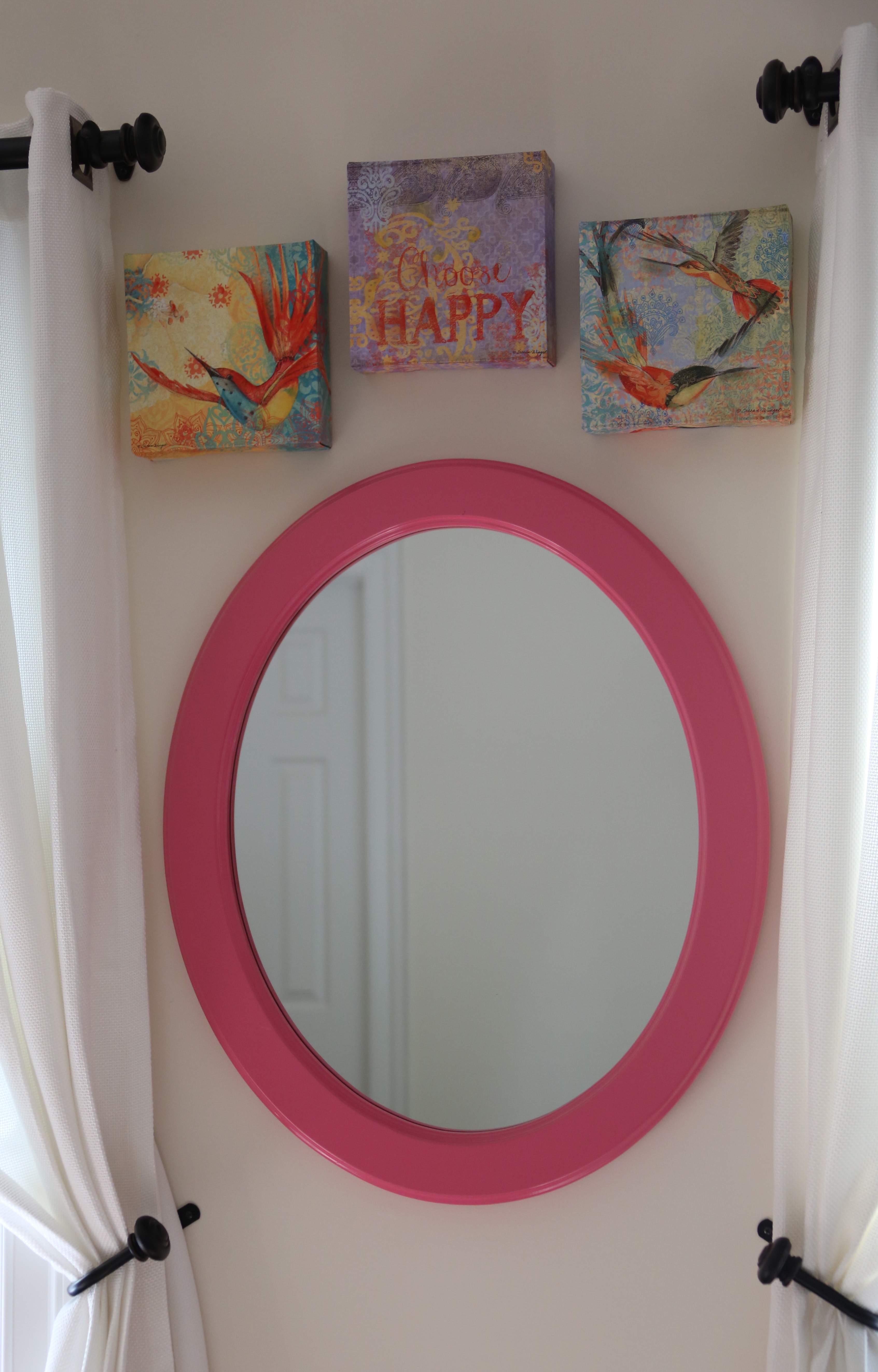 I used the very same type of curtain in this room as I did in the Happy room and in the Turquoise Room the only difference being that I used a silver curtain rod and tie back hooks. The grommets in the curtains are silver as well.