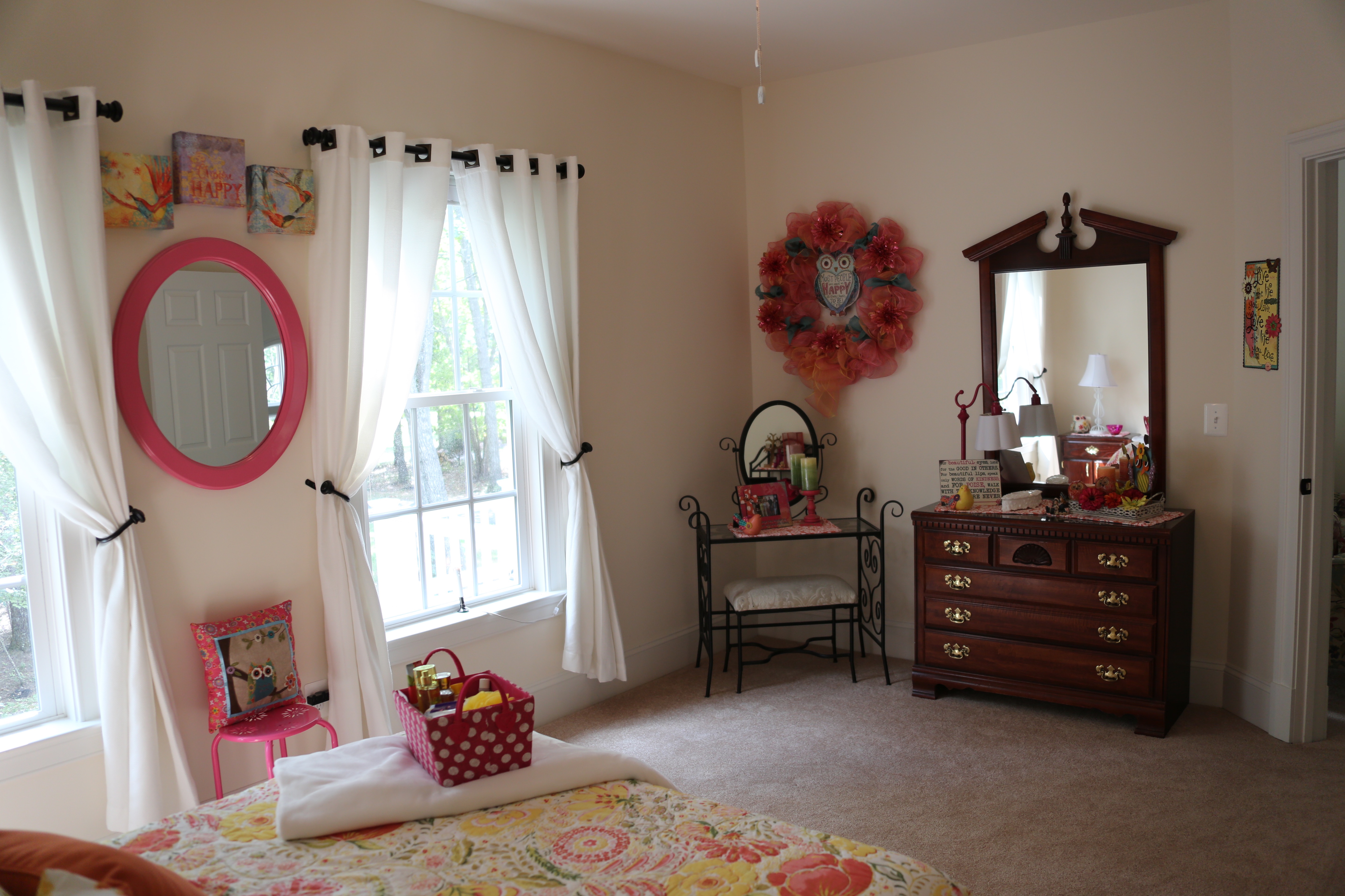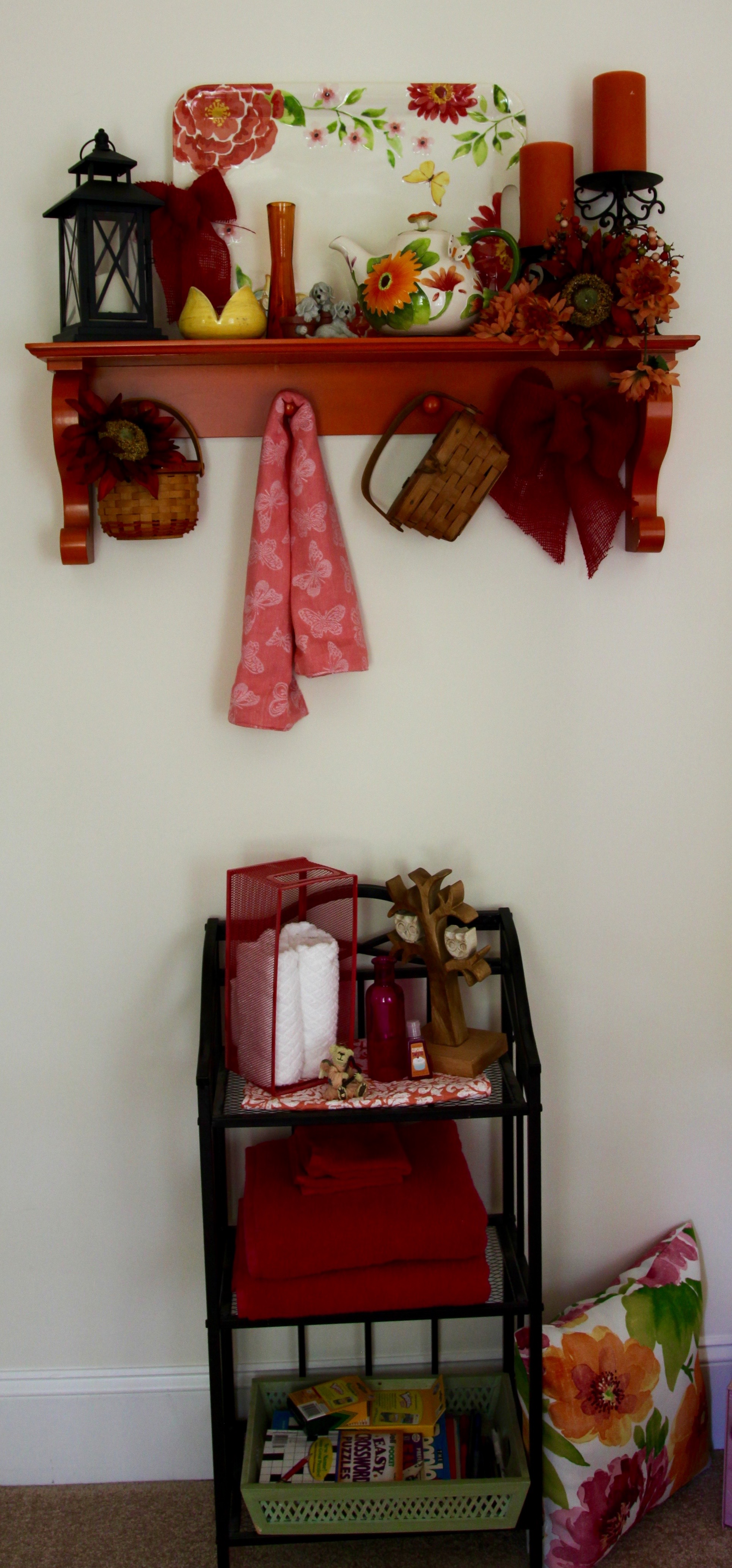 This is a very small space, but, it is private and I know that those who stay in this room appreciate that attribute. 🙂 I really enjoyed doing that little wall grouping. Actually, my hubby helped a lot, we had the 3 shelves, the owls, and the butterflies laid out on the floor in Hobby Lobby one day; we were arranging and rearranging those items until we finally got it like we wanted it…that process took a while…haha. Once we got everything home and hung up, I put all of the other stuff together on the shelves pulling from the stash that I had retrieved from the basement.