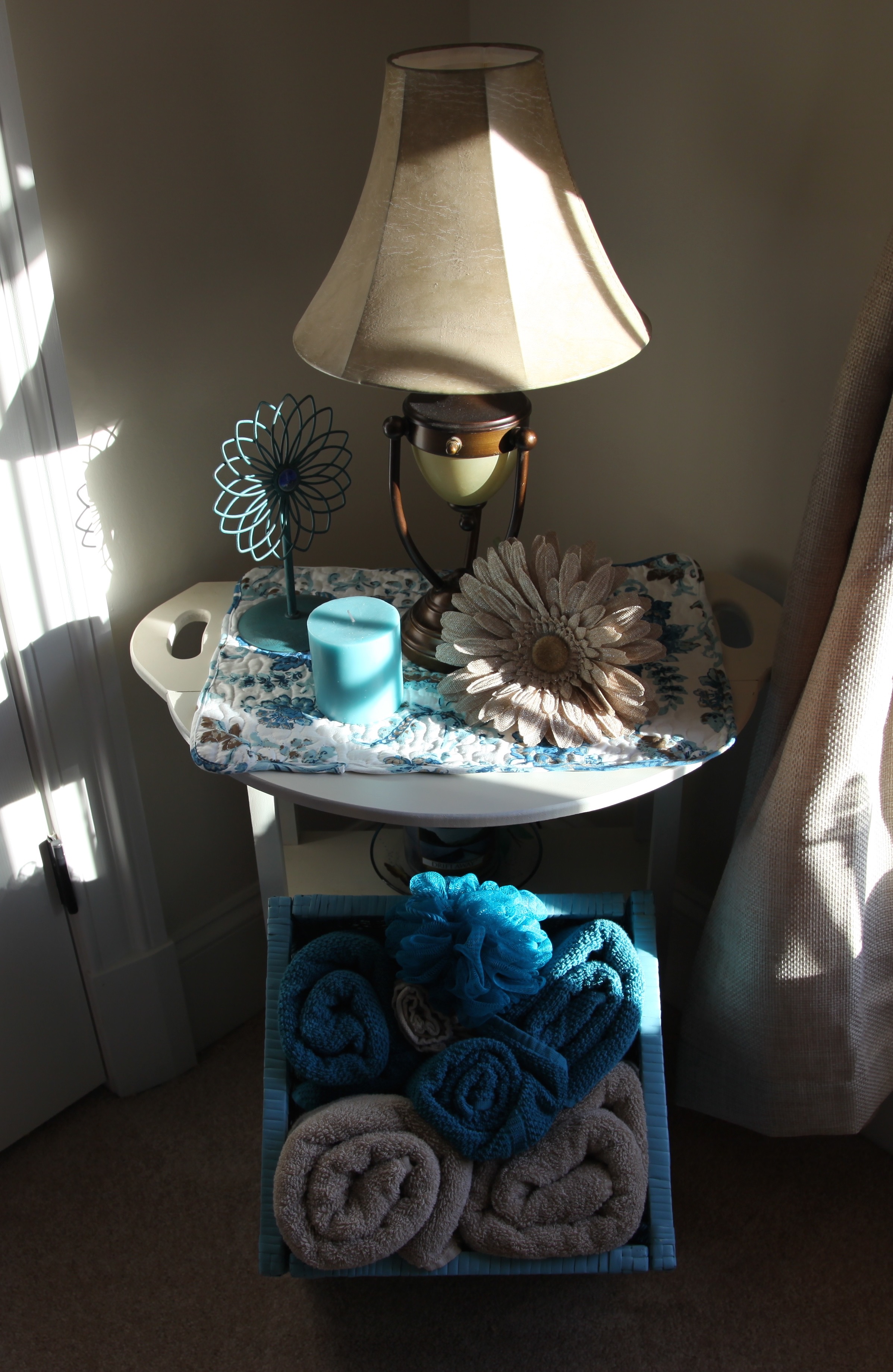 Just as I did in the other two rooms, I have placed a basket of goodies on the bottom of the bed. I think it adds a nice touch, makes guests feel welcome, and also provides them with necessities if they happened to forget anything.
